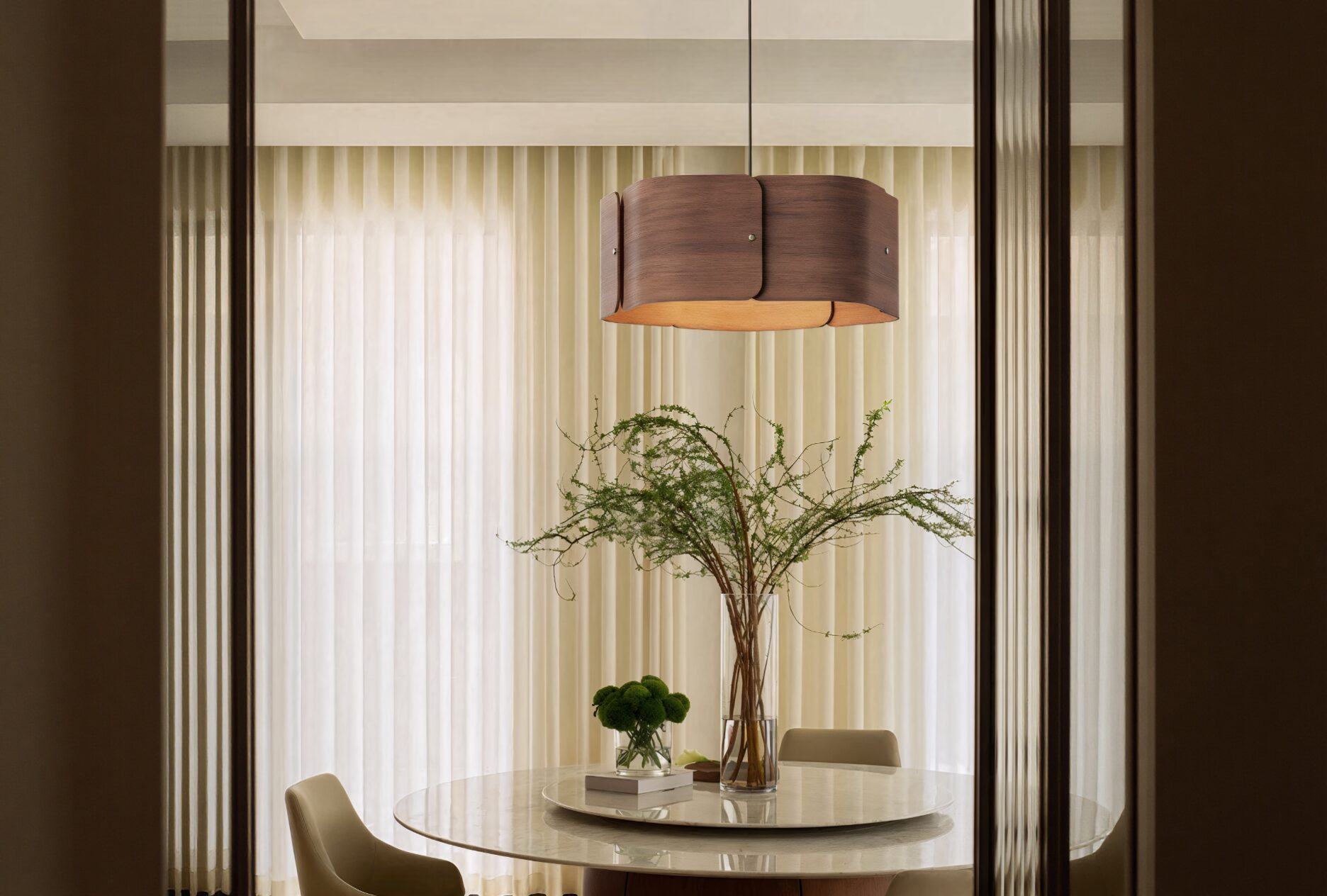 Тёплая текстура натурального дерева сочетается с современной геометрией, создавая мягкое рассеянное освещение и атмосферу уюта.