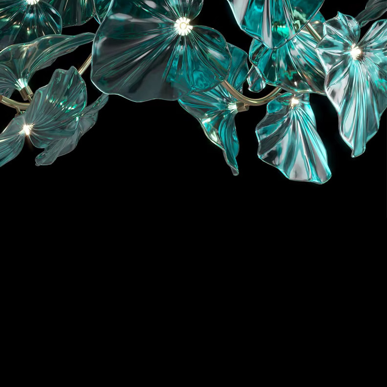 Вдохновленная драгоценным камнем, люстра AQUAMARINE сочетает благородную форму с магией океанских красок. Её плафоны в виде крупных лепестков переливаются всеми оттенками морской воды — от кристальной прозрачности прибрежных волн до глубоких аквамариновых тонов, где цвет теряется в глубине.