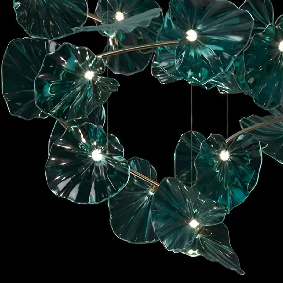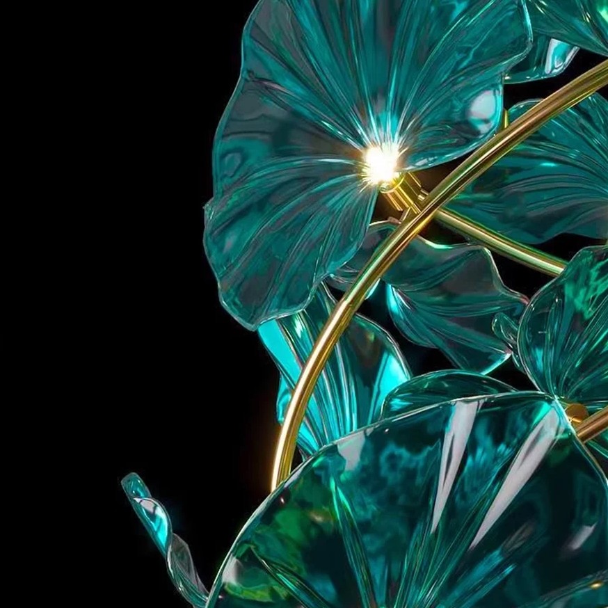 Металлический каркас с золотистым покрытием подчеркивает игру света в стеклянных «лепестках». Рассеянное свечение создает эффект солнечных лучей, проникающих сквозь толщу воды — мягкое, но наполненное жизнью.