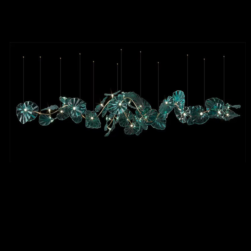 Вдохновленная драгоценным камнем, люстра AQUAMARINE сочетает благородную форму с магией океанских красок. Её плафоны в виде крупных лепестков переливаются всеми оттенками морской воды — от кристальной прозрачности прибрежных волн до глубоких аквамариновых тонов, где цвет теряется в глубине.