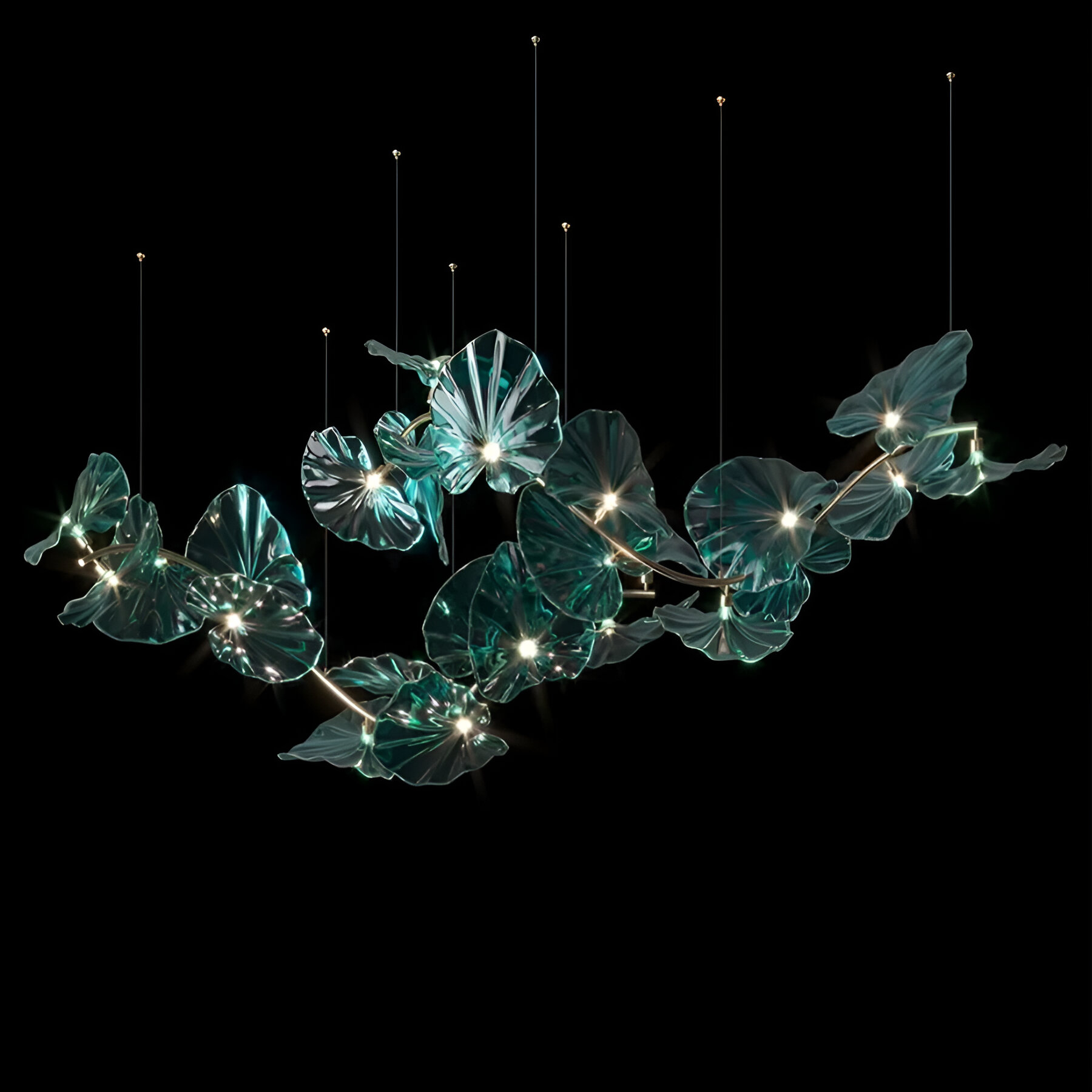 Металлический каркас с золотистым покрытием подчеркивает игру света в стеклянных «лепестках». Рассеянное свечение создает эффект солнечных лучей, проникающих сквозь толщу воды — мягкое, но наполненное жизнью.