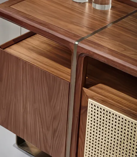 Металлические вставки и раттановые панели добавляют мебели уникальности и легкости, придавая ей современный облик.