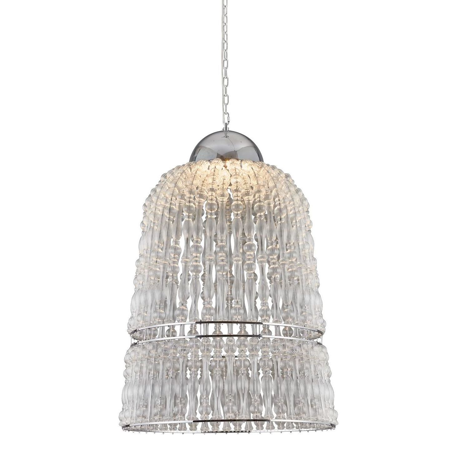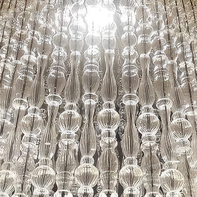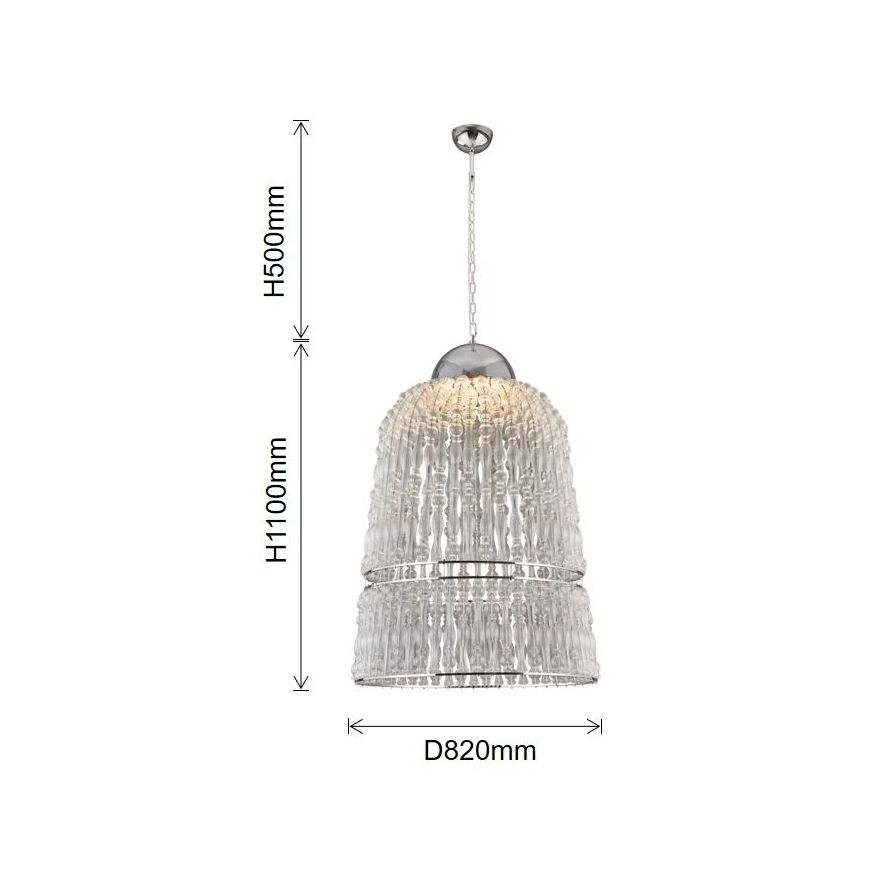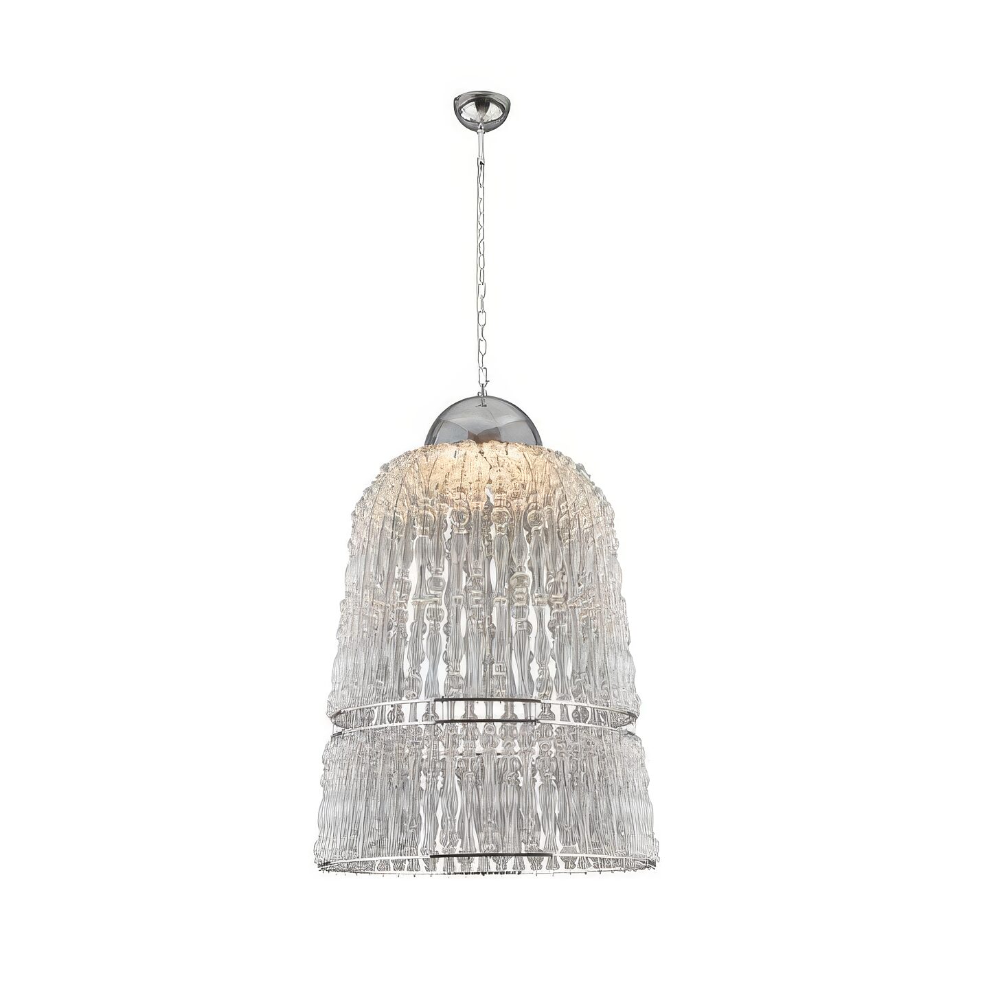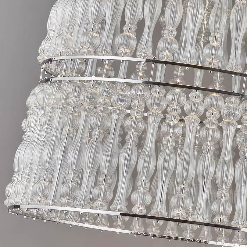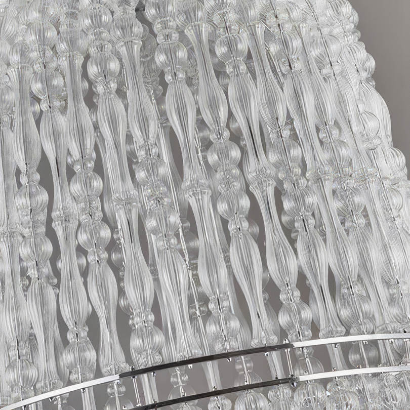 Композиция строится на сочетании прозрачного рельефного стекла и холодного металлического блеска — платинового или хромированного. Ручная работа придаёт каждому элементу индивидуальность: стеклянные подвески варьируются по длине и форме, образуя мягкий вертикальный каскад света. Верхняя полусфера отражает блеск стекла, создавая эффект многослойного свечения.