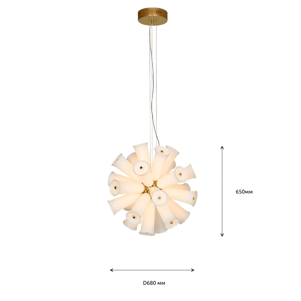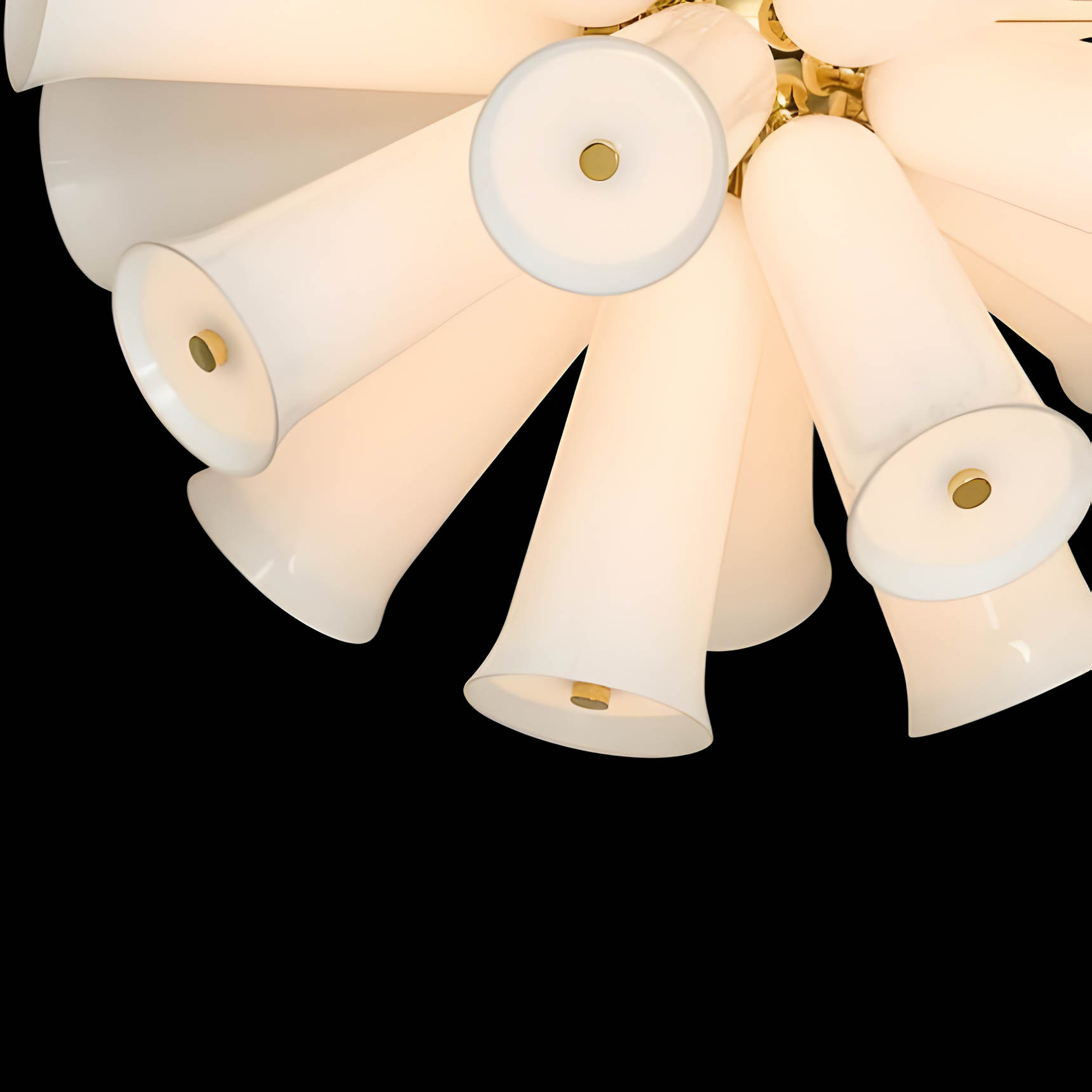 Корпус светильников выполнен из металла в сатинированной латунной отделке с деликатным шелковистым блеском. Плафоны — из матового белого выдувного стекла с глубокой, равномерной засветкой; источник утоплен, не слепит, а свет мягко проливается по всей высоте и выходит через открытую кромку, подчёркивая форму «раструба». Тёплое сияние выстраивает аккуратный световой объём и добавляет интерьеру ощущение торжественного уюта.
