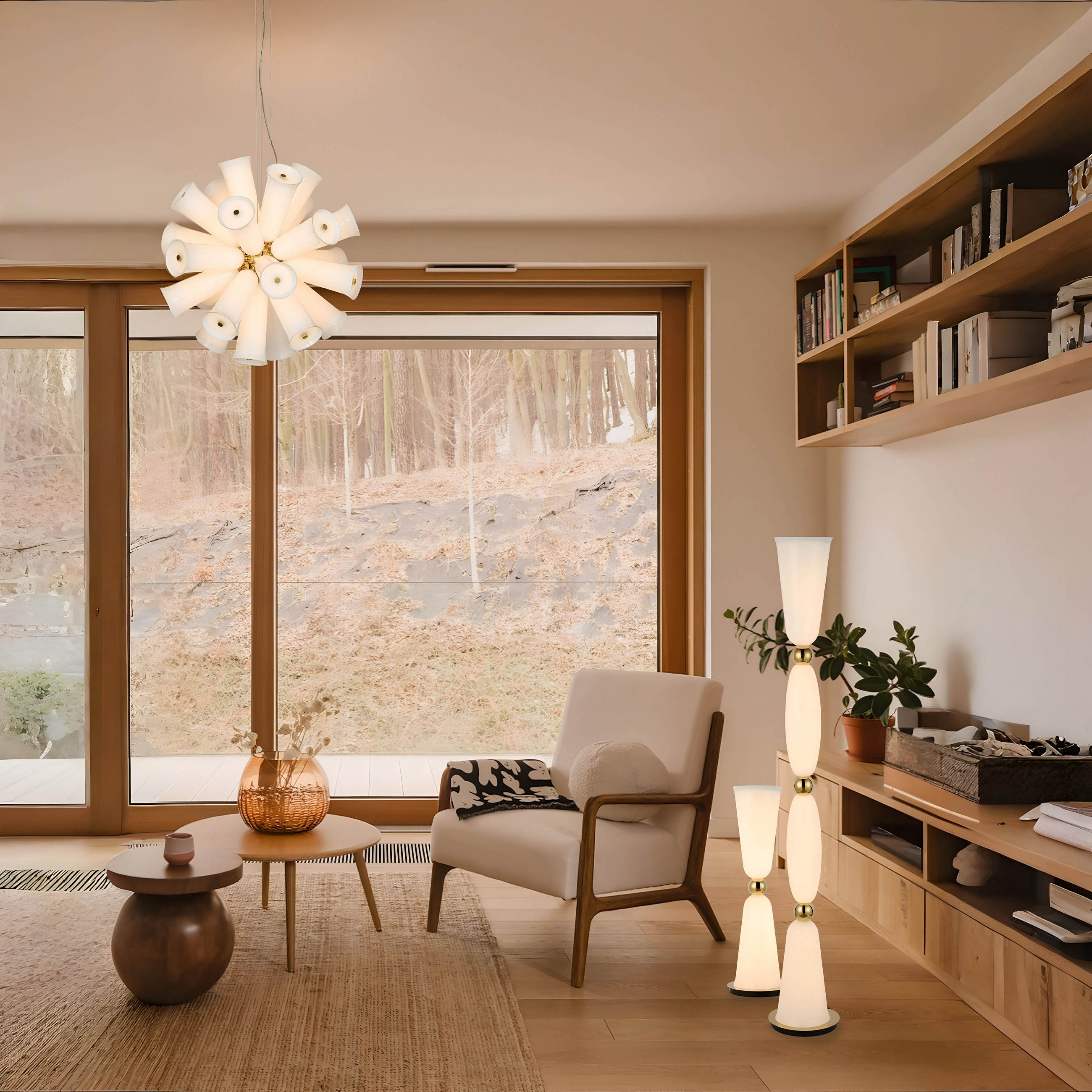 Серия FANFARES включает торшеры, настольную лампу и люстру, которые органично смотрятся в светлых гостиных, спальнях и обеденных зонах. Они вносят в пространство лёгкий ритм и ту особую нотку ожидания, когда интерьер наполняется мягким, праздничным светом.