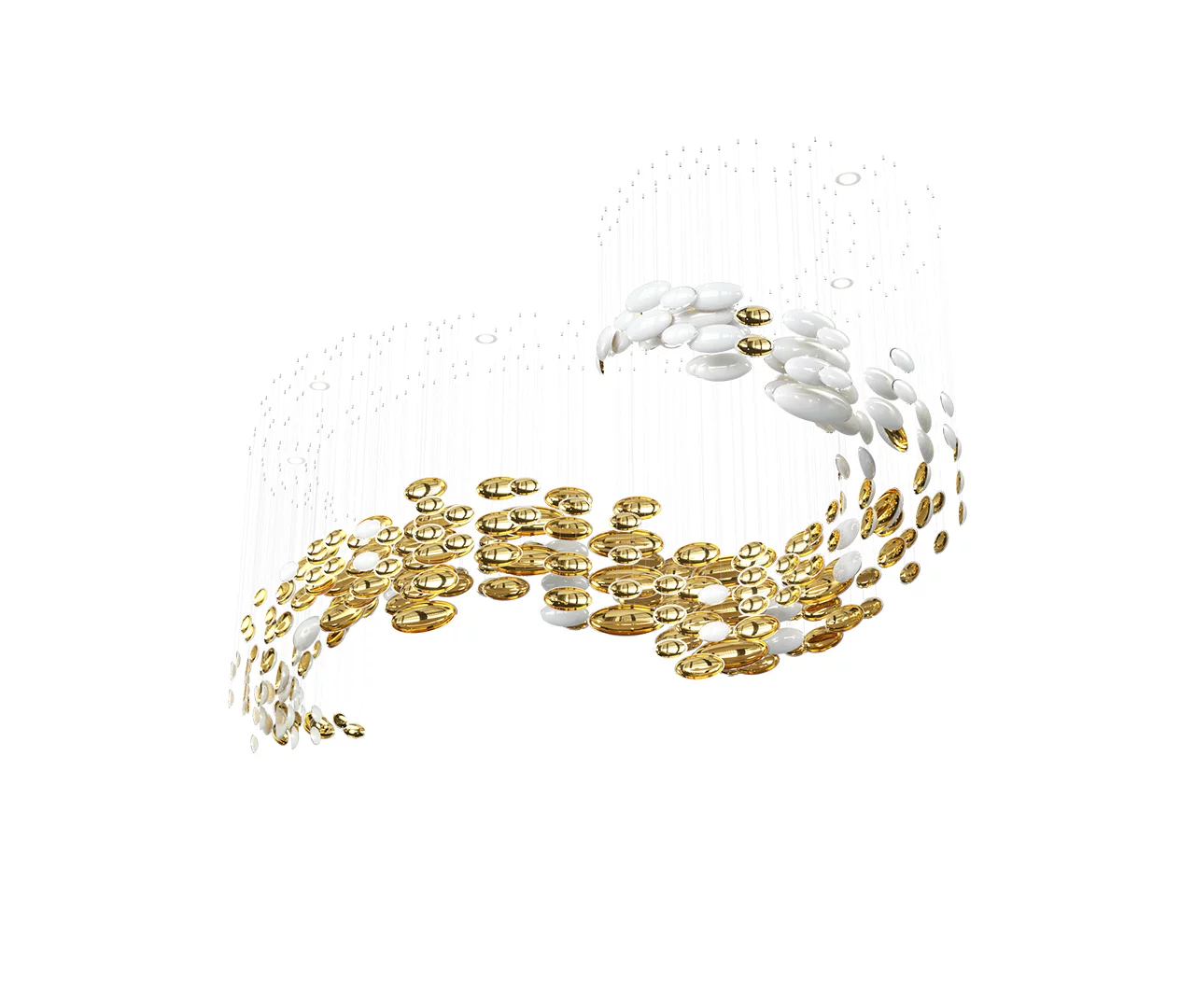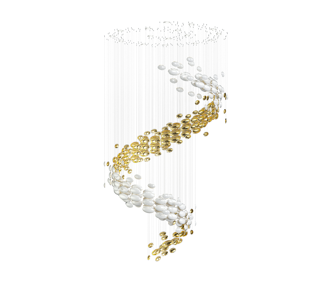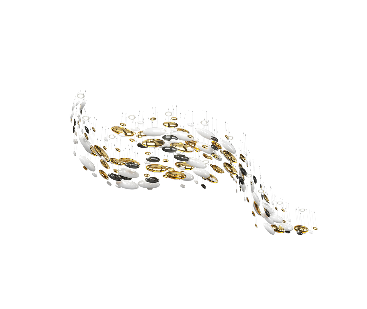 Fish – композиция подвесов округлой формы из опалового стекла с контрастной металлической отделкой. Каждый элемент выполнен профессиональными мастерами вручную и подвешивается к потолку с помощью тончайшего металлического троса. Свет исходит от потолочного крепления и преломляется через стеклянные элементы, создавая неповторимый рисунок тени. От дуновения ветра стеклянные детали приходят в движение и переливаются, напоминая стаю рыб и блеск чешуи на солнце. Инсталляция перенесет вас в подводный мир и подарит ощущение радости и спокойствия.