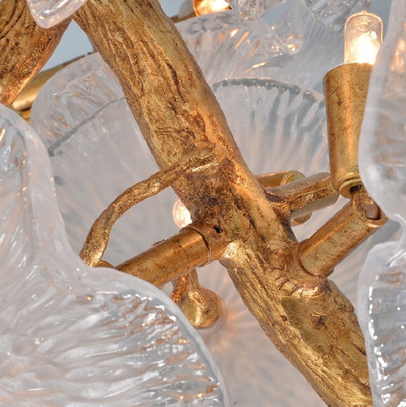 Кристально чистое стекло наполняет пространство мягким, натуральным светом, играя бликами и отражениями. Теплые золотистые элементы служат деликатными акцентами, оттеняя хрупкую красоту стеклянных форм и добавляя глубины образу.