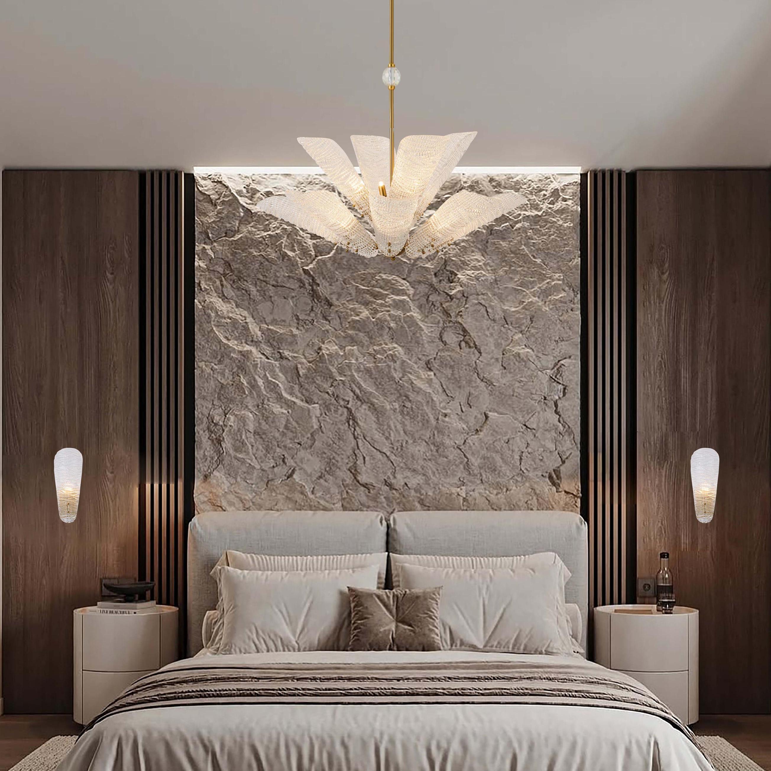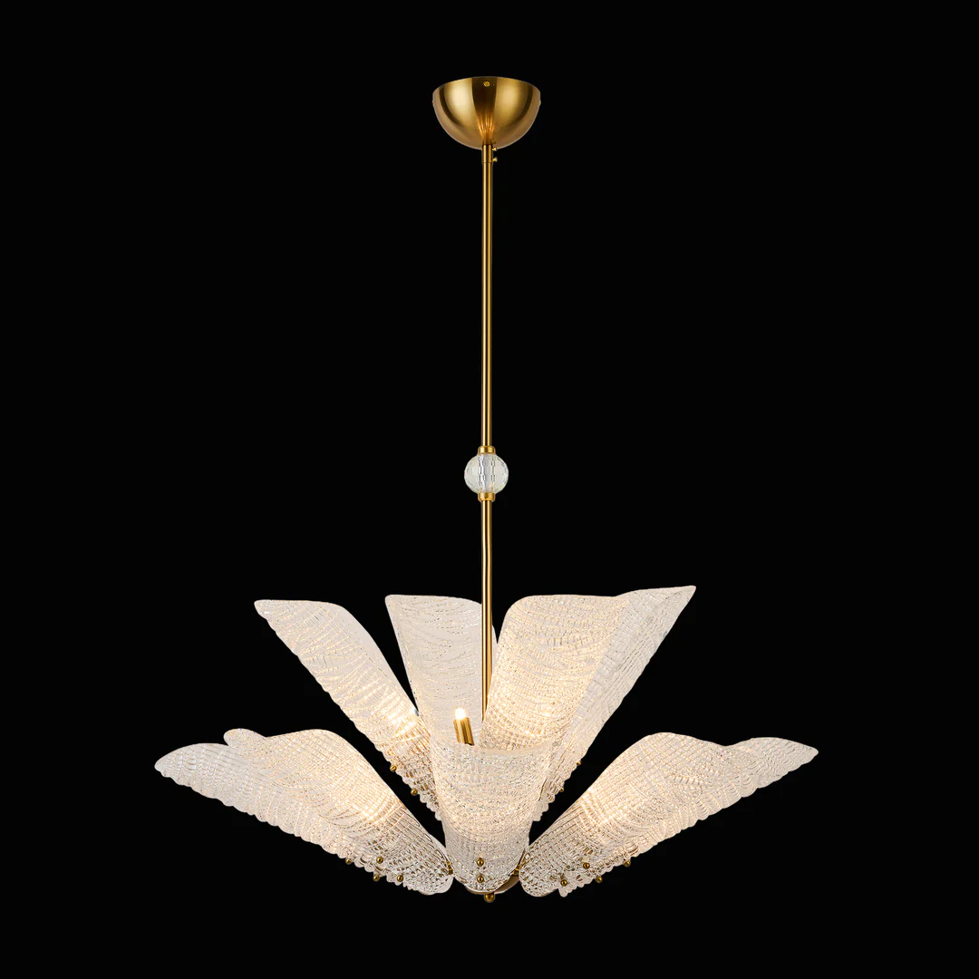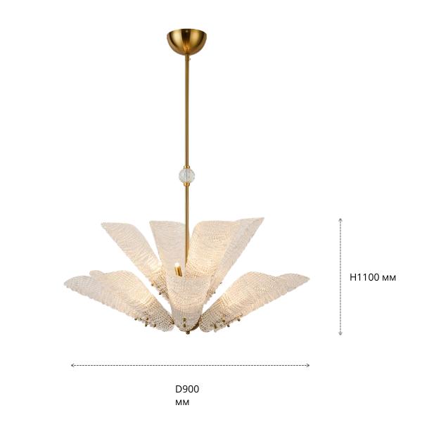 Многослойная конструкция выполнена из ручного фактурного стекла, каждый элемент которого имеет неповторимый рельеф. Лепестки крепятся на металлической основе оттенка Antique Gold, подчеркивающей их прозрачность и усиливающей мягкую игру света.