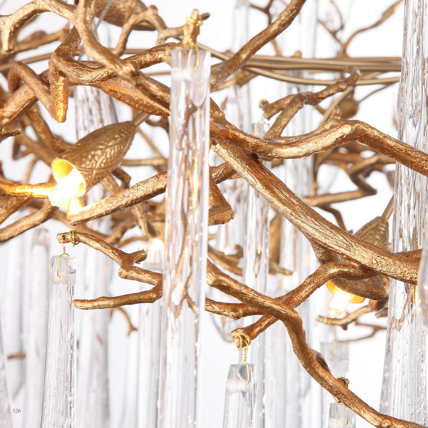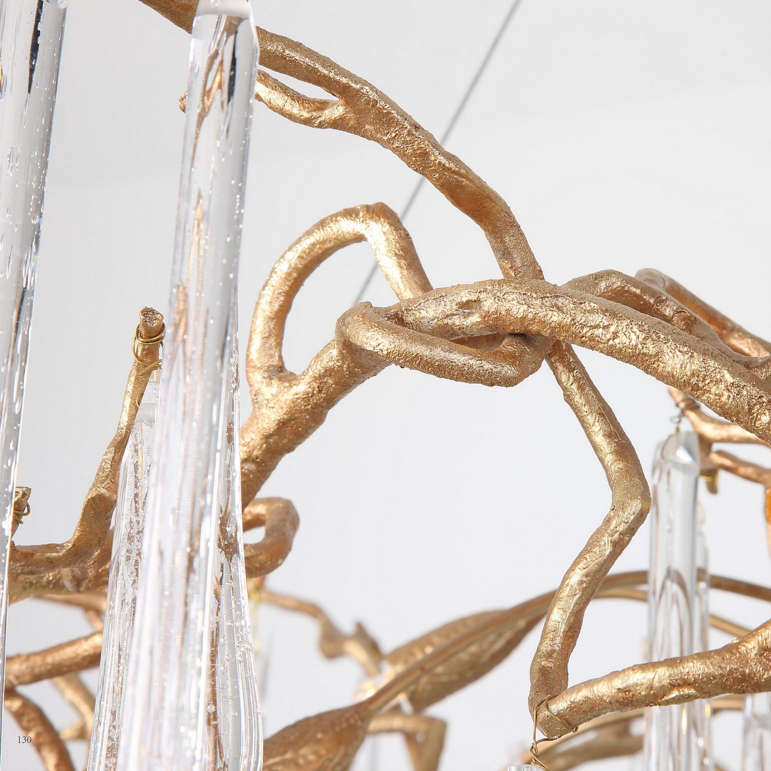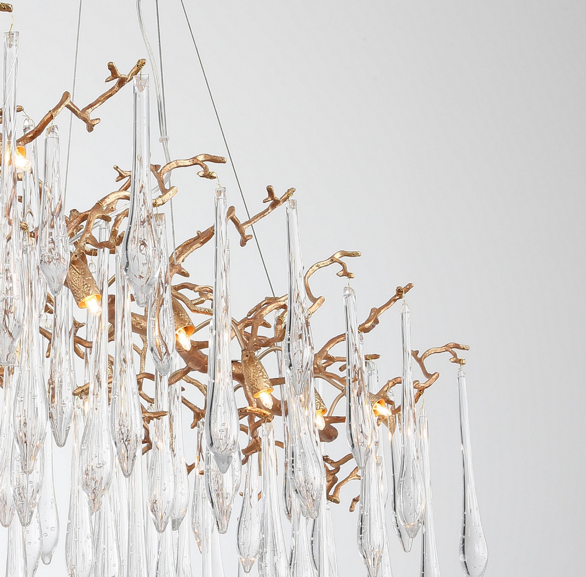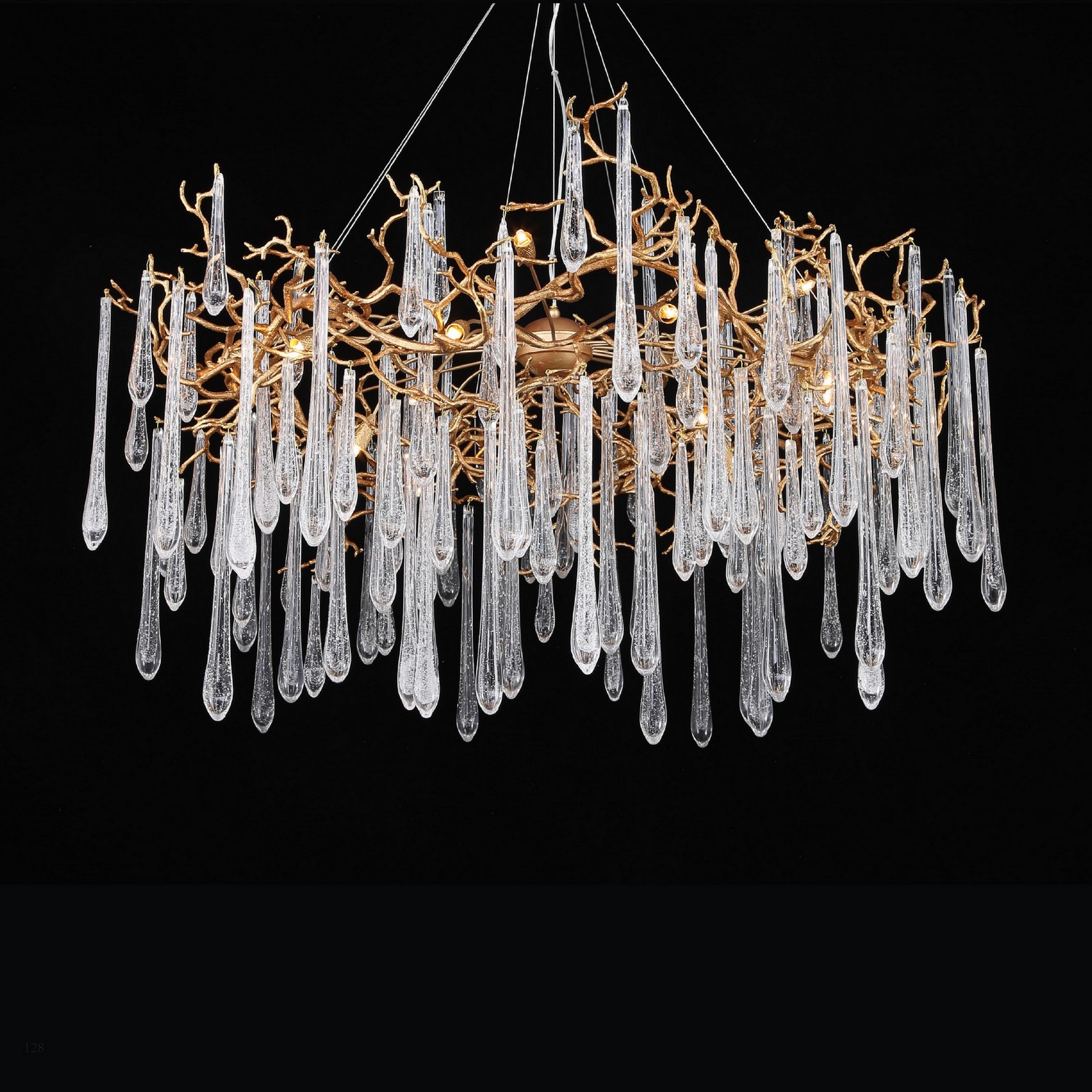 Огонь, пойманный в ледяной плен. Люстра FROZEN FIRE — воплощение невозможного, где две стихии существуют в хрупком равновесии. Десятки вытянутых стеклянных подвесов свисают бронзовых ветвей, будто пламя, внезапно обращённое в лёд.