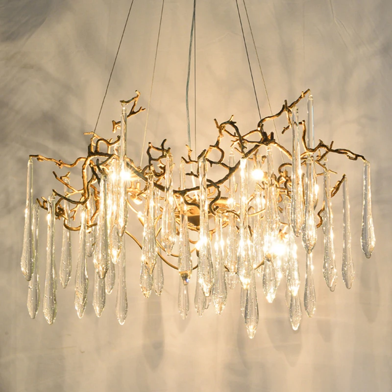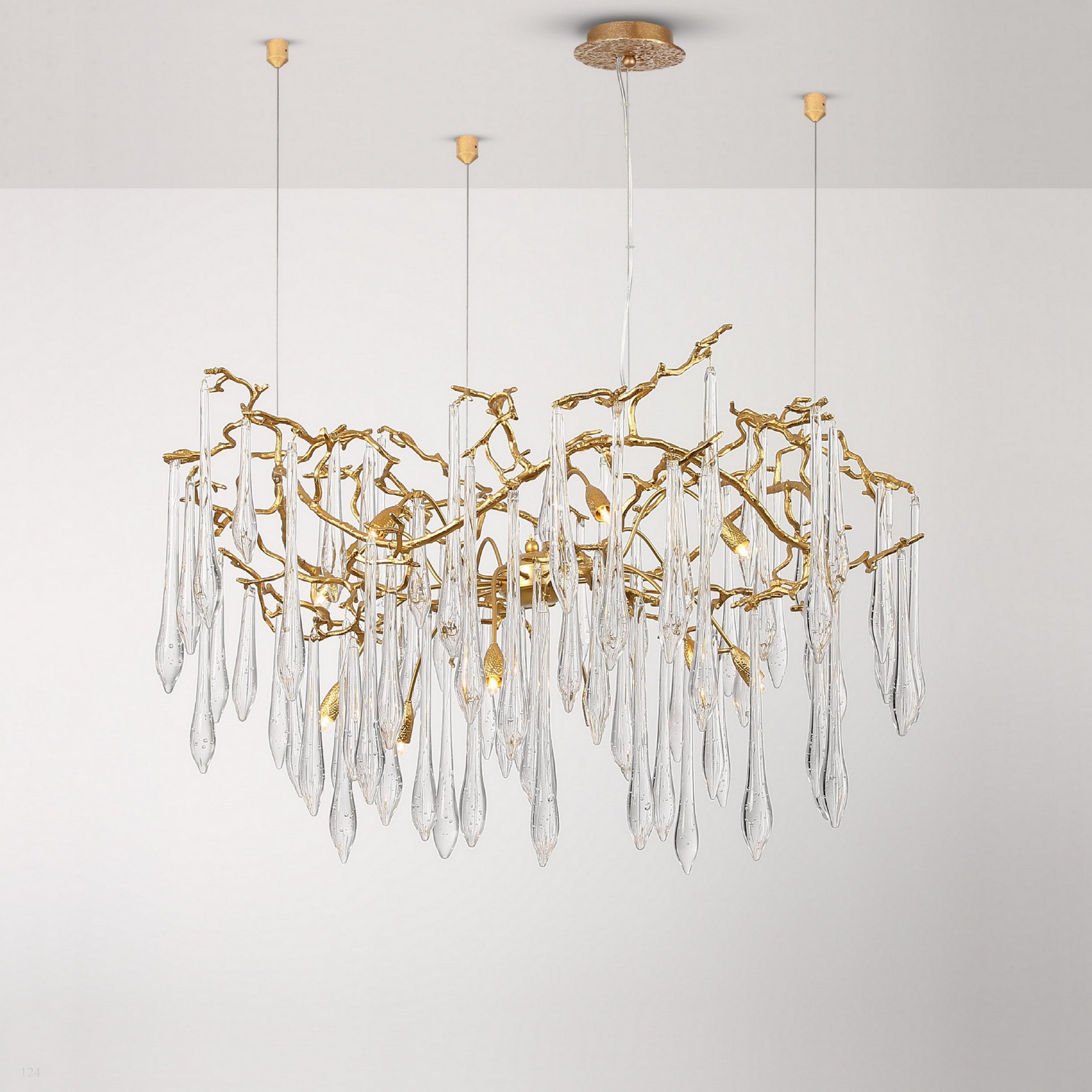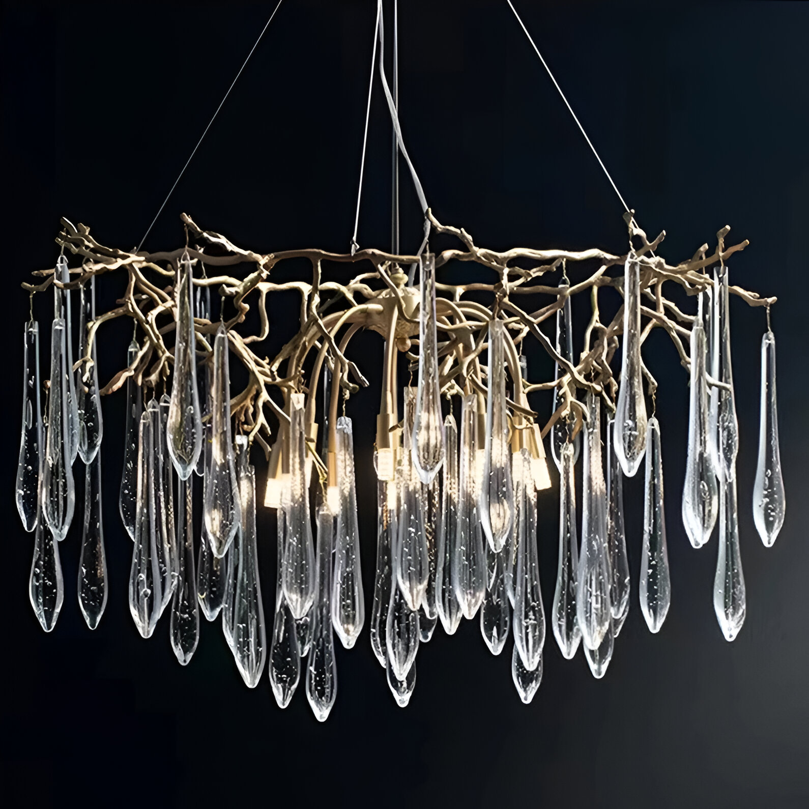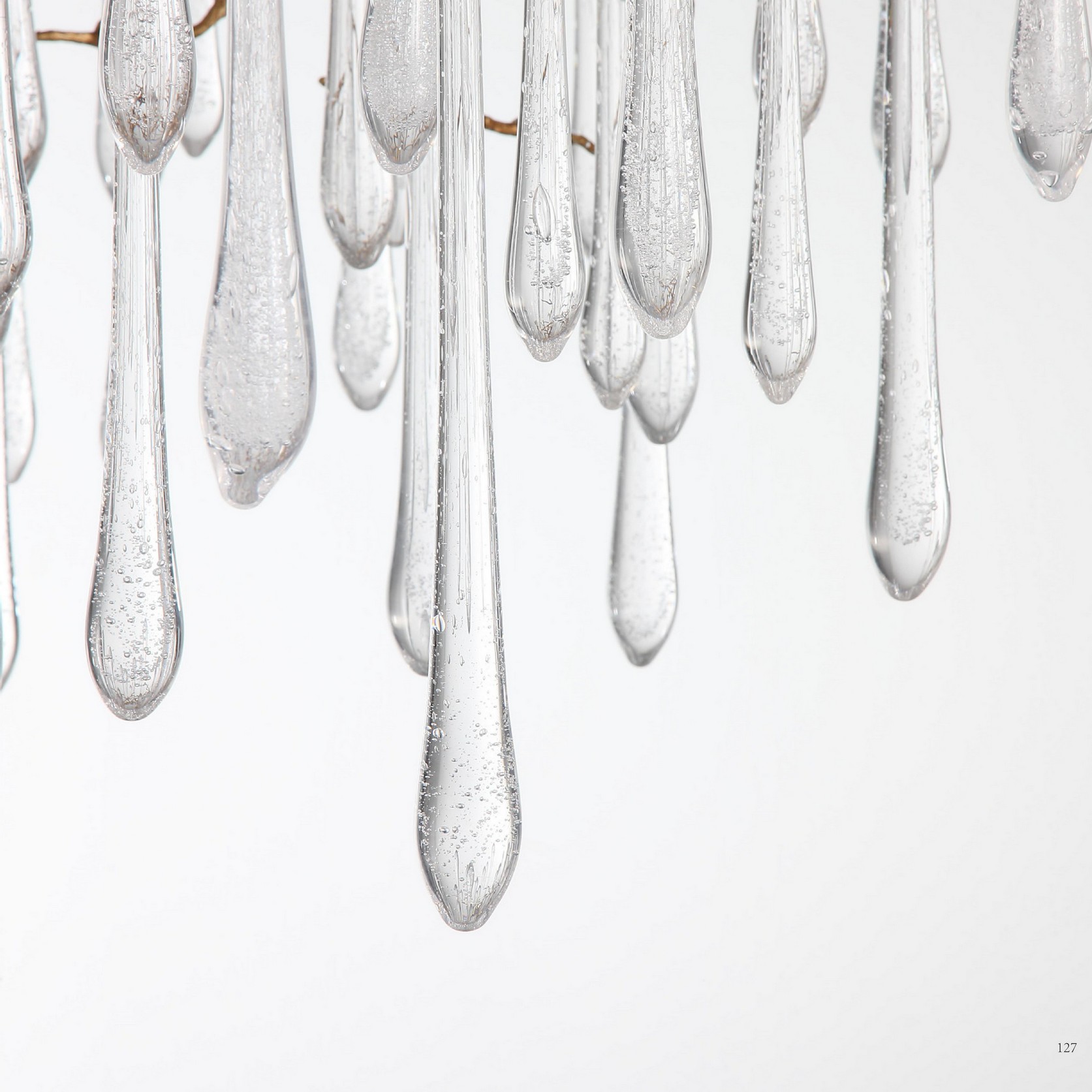 Огонь, пойманный в ледяной плен. Люстра FROZEN FIRE — воплощение невозможного, где две стихии существуют в хрупком равновесии. Десятки вытянутых стеклянных подвесов свисают бронзовых ветвей, будто пламя, внезапно обращённое в лёд.