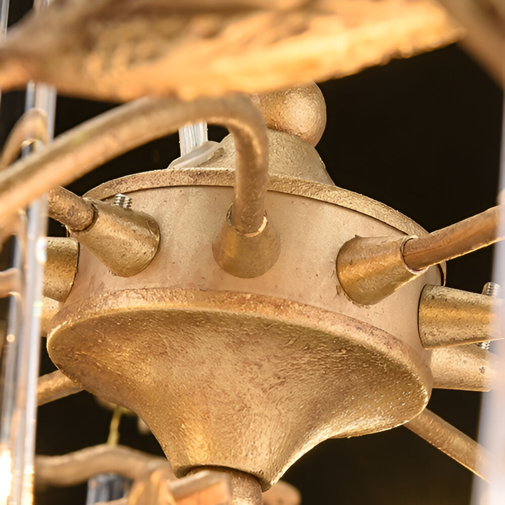 Когда свет включается, происходит чудо преображения: тёплые лучи у основания заставляют бронзовые «ветви» тлеть золотистым отблеском, в то время как хрустальные элементы остаются пронзительно холодными.