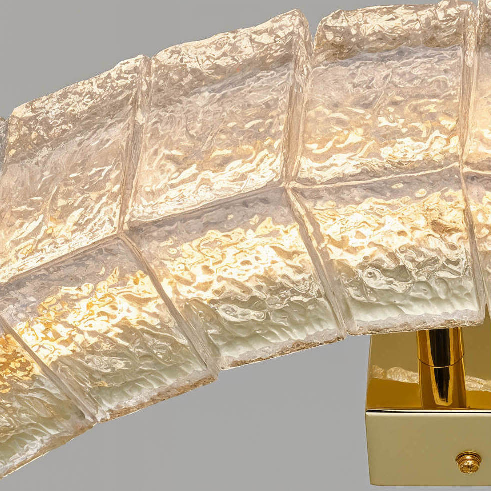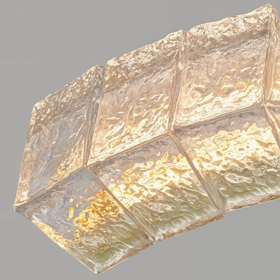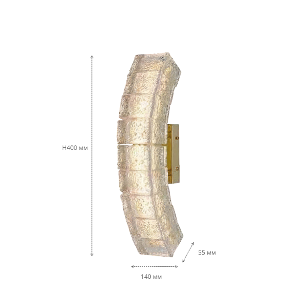 Каркас и декоративные элементы выполнены из металла цвета светлого золота с платиновым отблеском. В качестве рассеивателей используются массивные стеклянные панели ручной работы: их рельефная поверхность придаёт свечению живую текстуру и лёгкое мерцание.