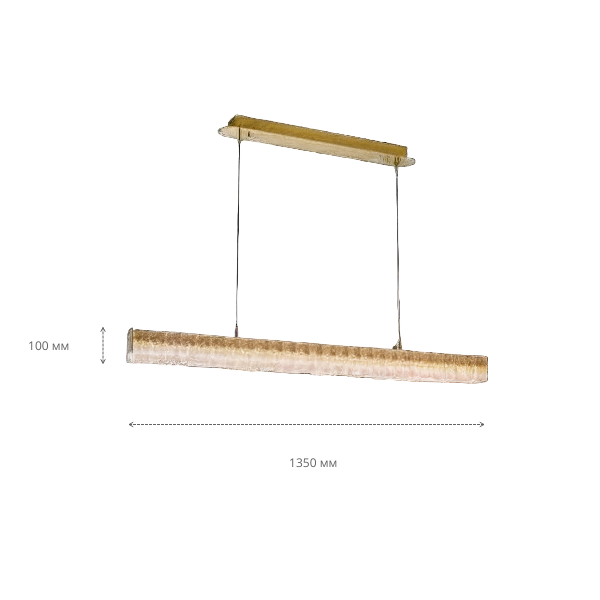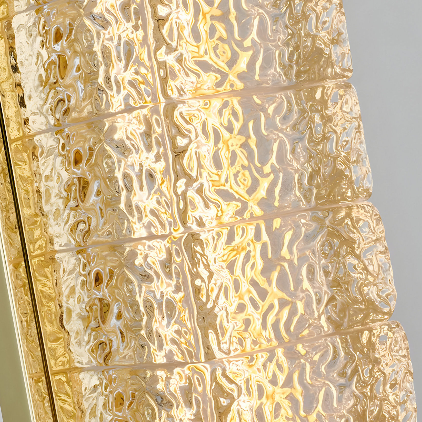 Каркас и декоративные элементы выполнены из металла цвета светлого золота с платиновым отблеском. В качестве рассеивателей используются массивные стеклянные панели ручной работы: их рельефная поверхность придаёт свечению живую текстуру и лёгкое мерцание.