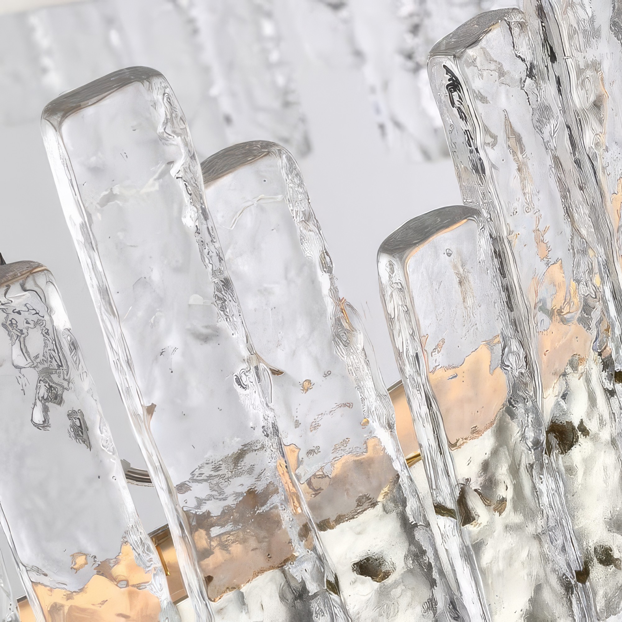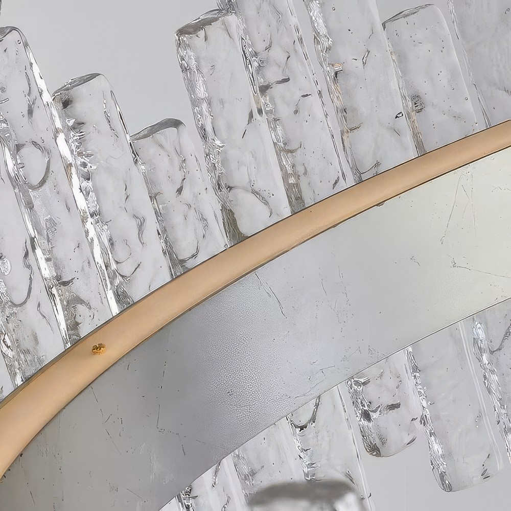 В основе каждого светильника — сочетание металла и стеклянных блоков. Под воздействием высокой температуры стекло приобретает уникальную фактуру: поверхности волнуются, как застывшие водные потоки, а LED-подсветка заставляет структуру сиять изнутри. Каждый элемент выполнен вручную, что гарантирует неповторимость деталей и естественные индивидуальные неровности.