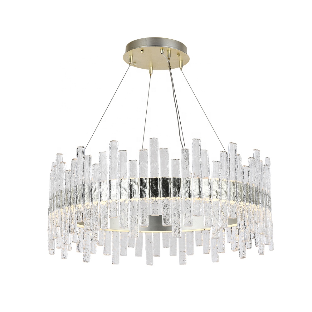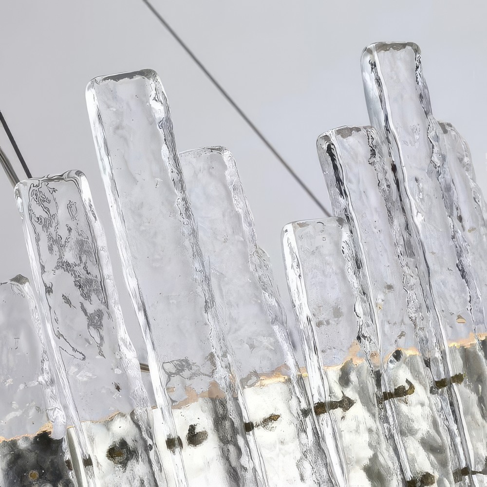 В основе каждого светильника — сочетание металла и стеклянных блоков. Под воздействием высокой температуры стекло приобретает уникальную фактуру: поверхности волнуются, как застывшие водные потоки, а LED-подсветка заставляет структуру сиять изнутри. Каждый элемент выполнен вручную, что гарантирует неповторимость деталей и естественные индивидуальные неровности.