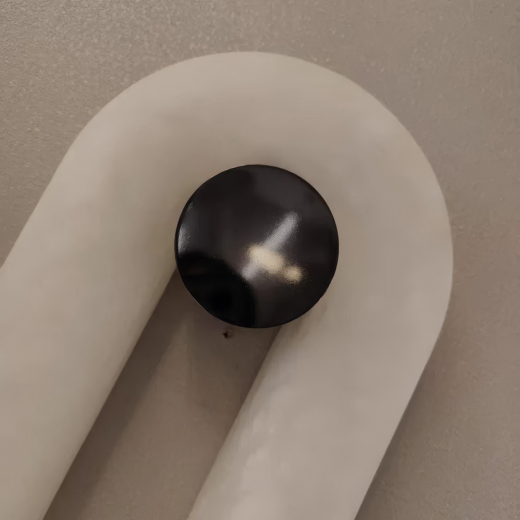 Графичный черный элемент, расположенный в центре, визуально поддерживает форму и добавляет композиции современный акцент. Эта деталь подчеркивает минималистичную эстетику и служит выразительным контрастом теплому свечению алебастра.