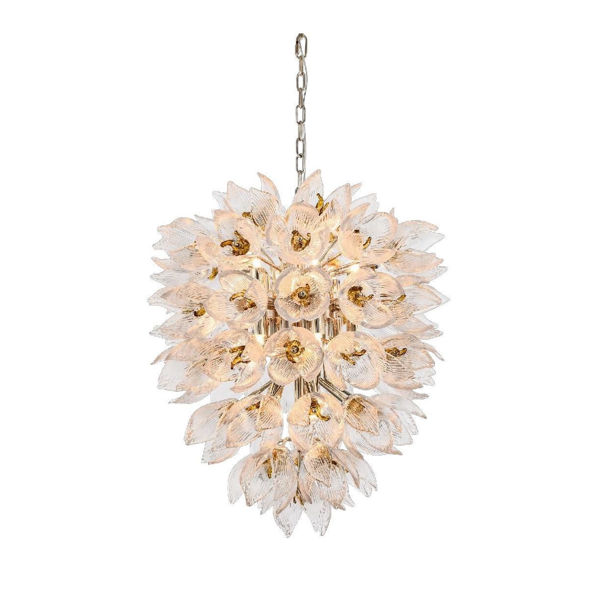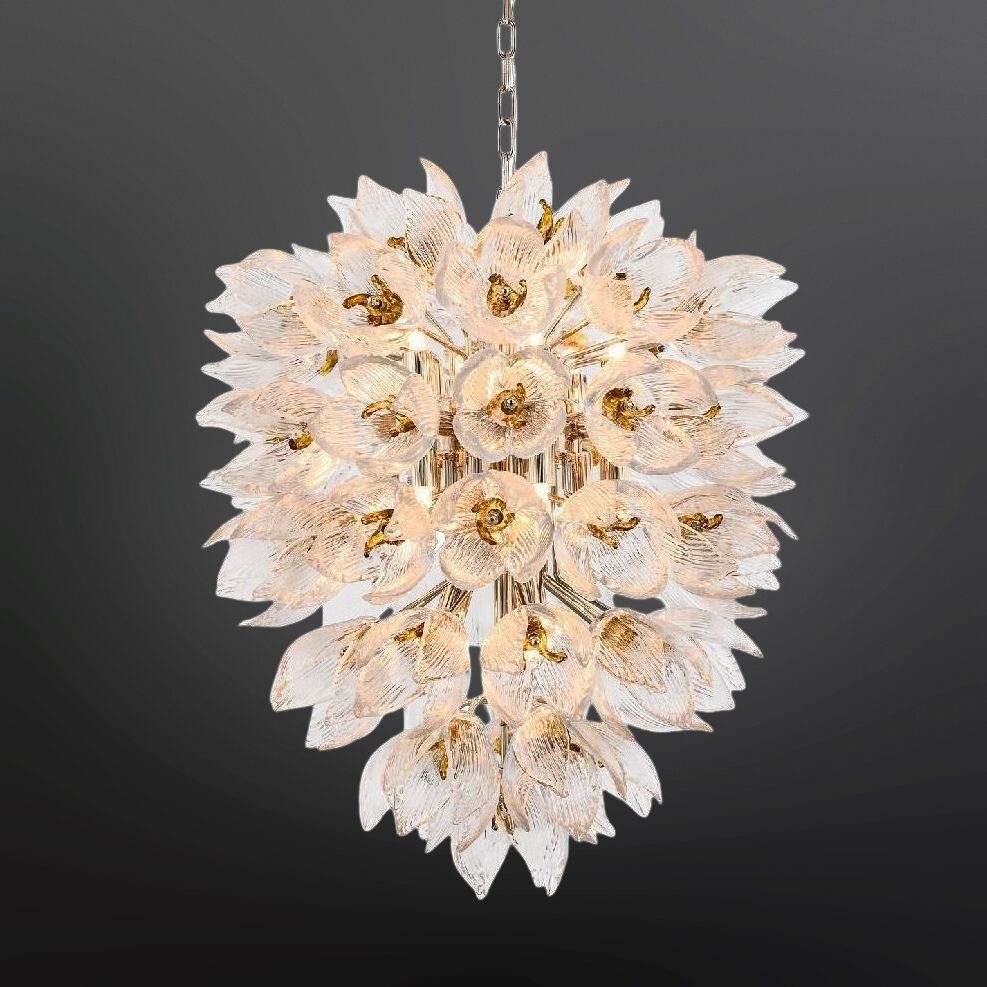 Центральный металлический стержень служит основой для филигранных бутонов с золотистыми сердцевинами и изящными стеклянными лепестками. Каждый лепесток уникален — в форме и прожилках видна ручная работа и живая динамика природы. Включённый свет мягко рассеивается через стекло, наполняя пространство волшебным сиянием и создавая игру теней.