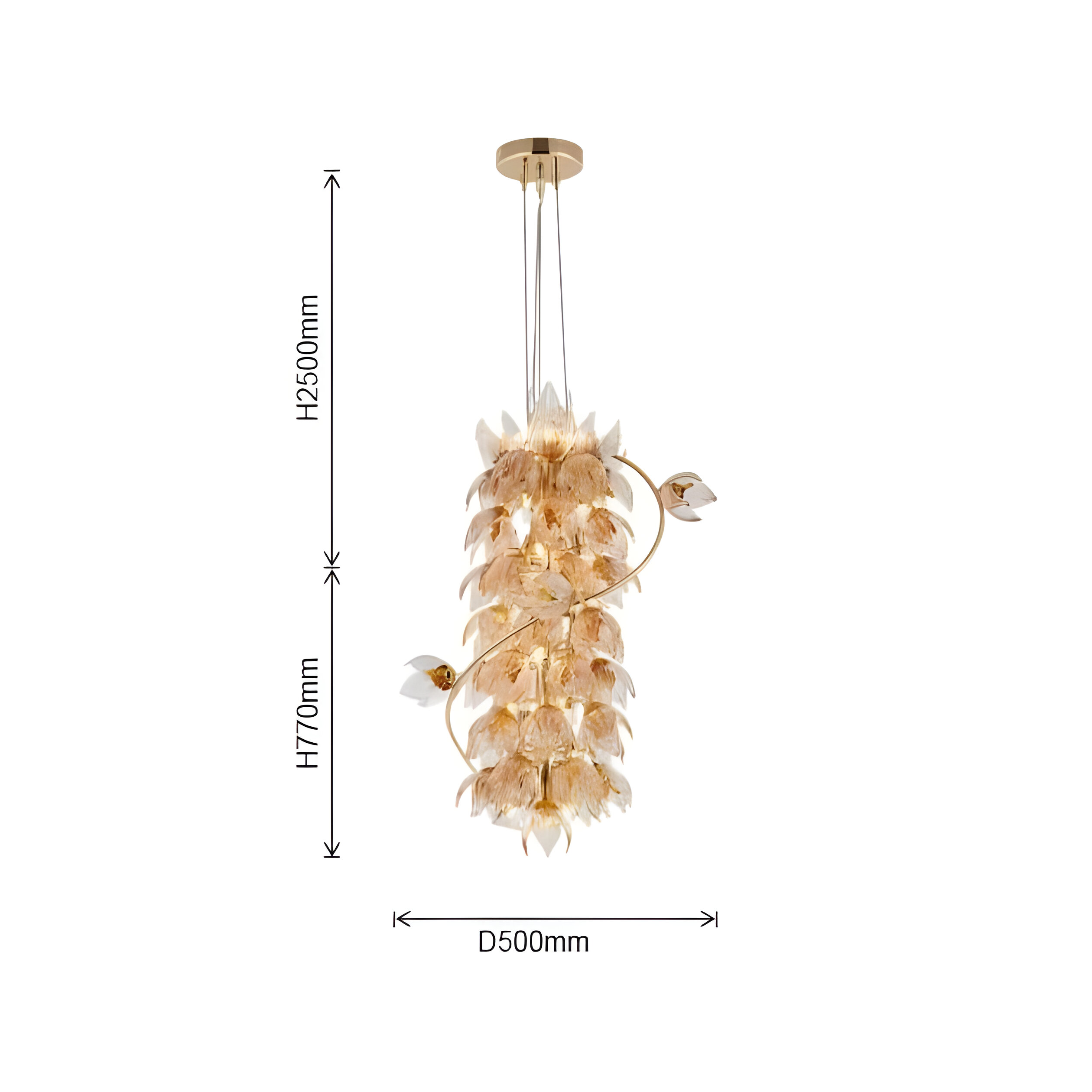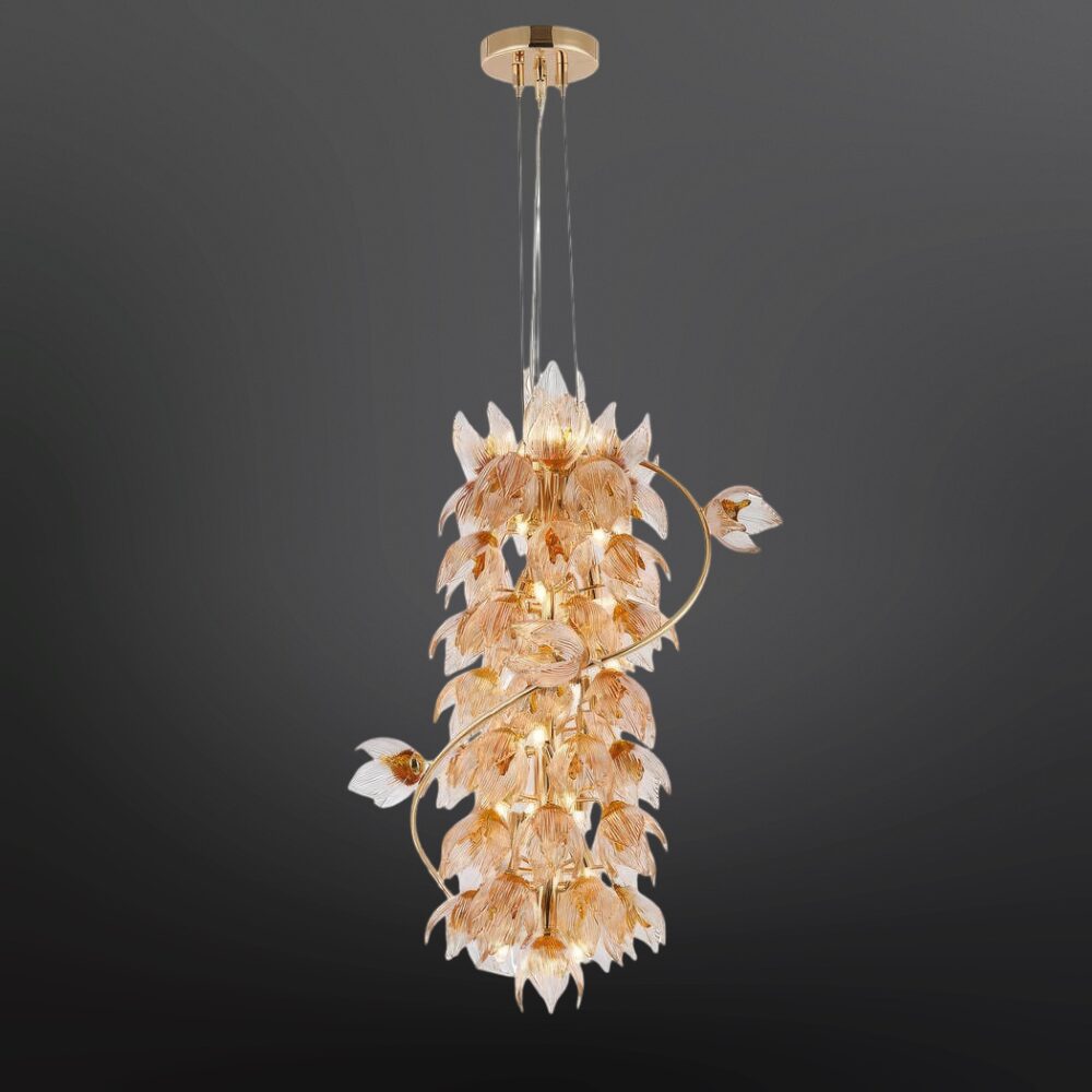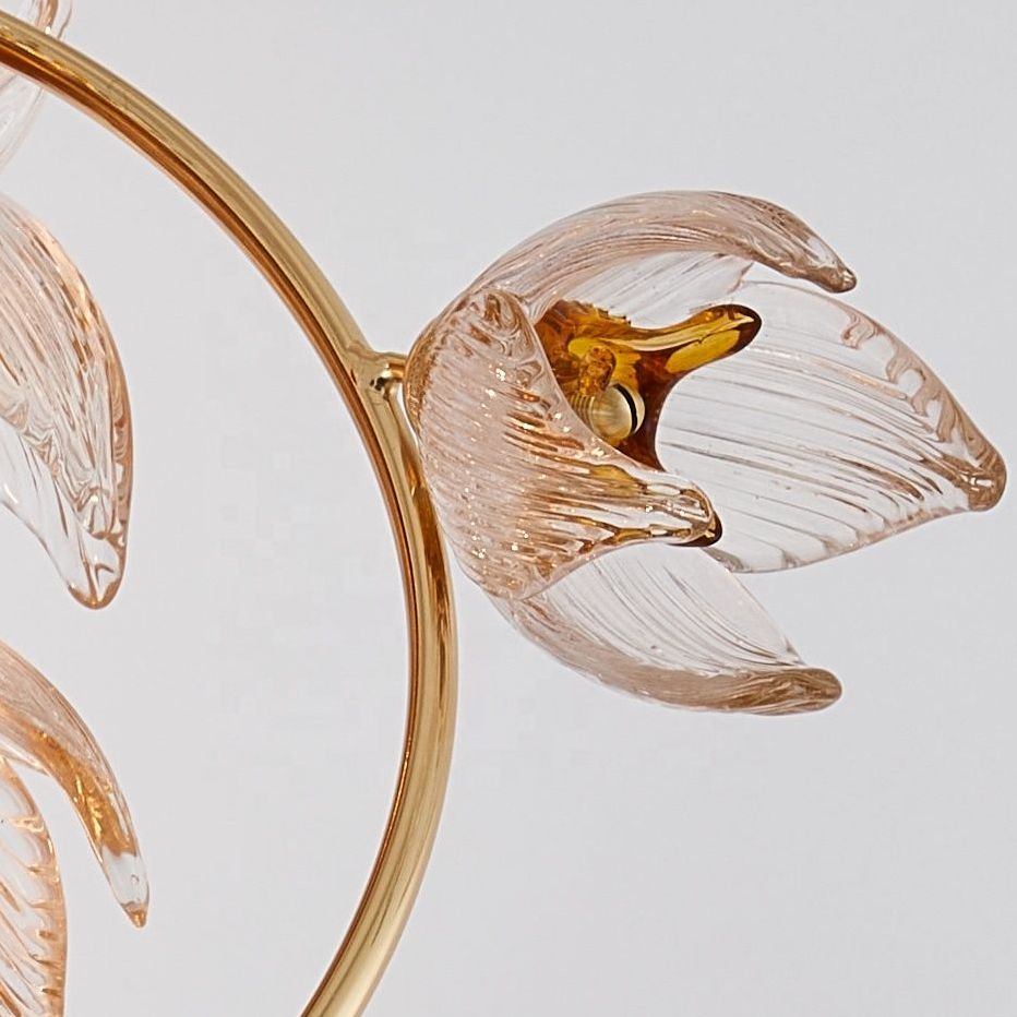 Центральный металлический стержень служит основой для филигранных бутонов с золотистыми сердцевинами и изящными стеклянными лепестками. Каждый лепесток уникален — в форме и прожилках видна ручная работа и живая динамика природы. Включённый свет мягко рассеивается через стекло, наполняя пространство волшебным сиянием и создавая игру теней.