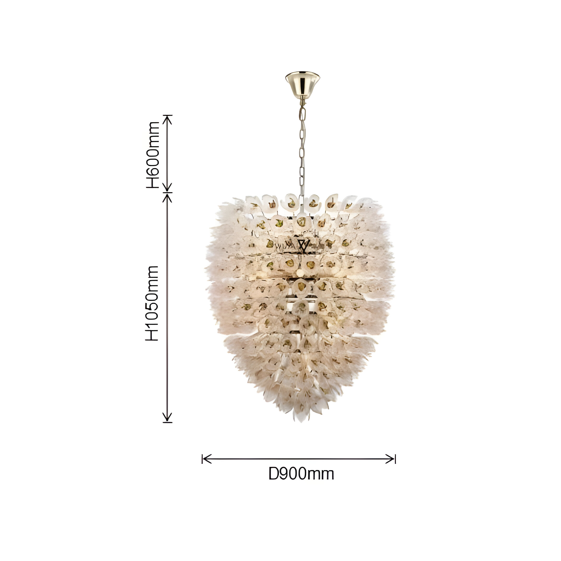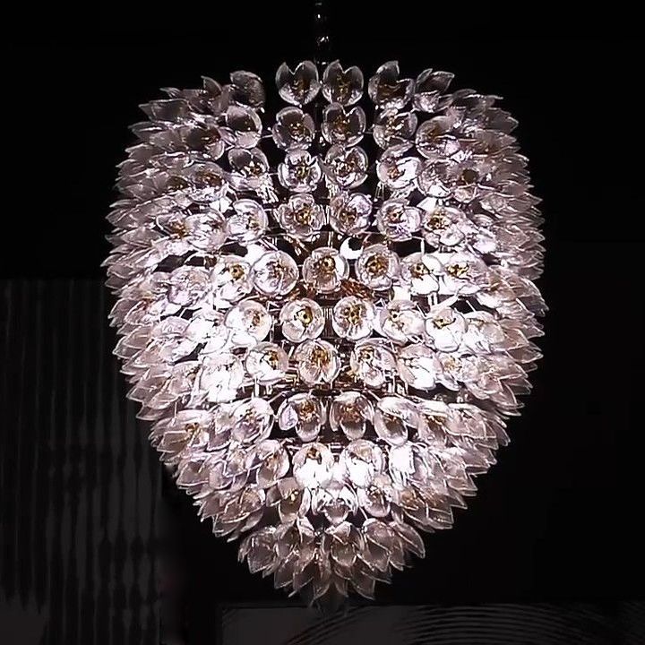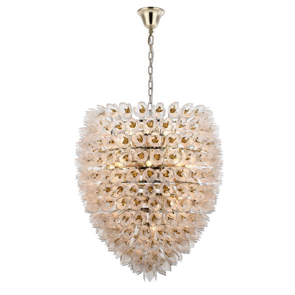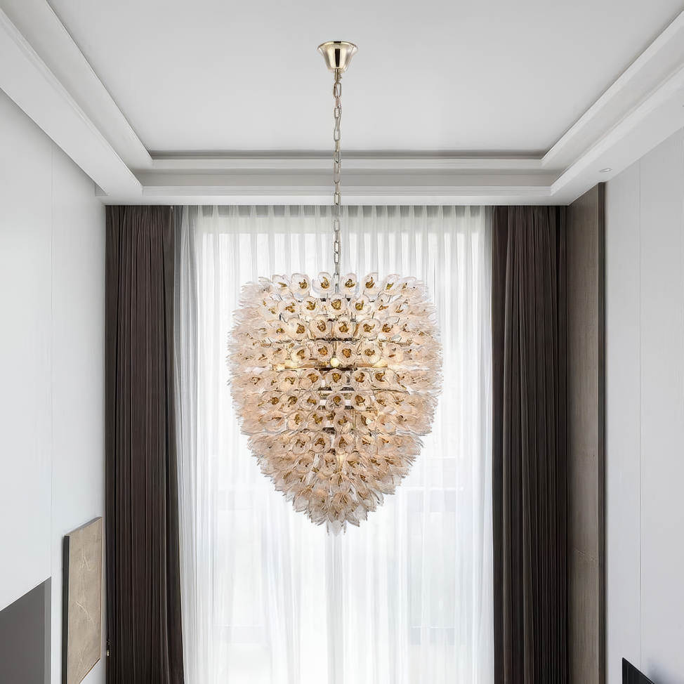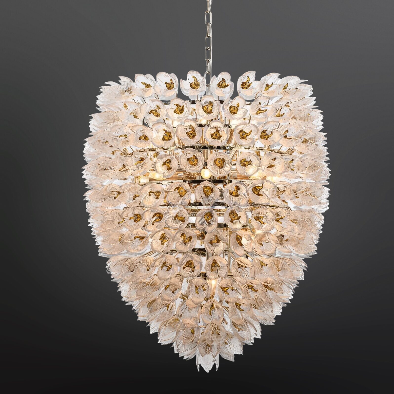 Центральный металлический стержень служит основой для филигранных бутонов с золотистыми сердцевинами и изящными стеклянными лепестками. Каждый лепесток уникален — в форме и прожилках видна ручная работа и живая динамика природы. Включённый свет мягко рассеивается через стекло, наполняя пространство волшебным сиянием и создавая игру теней.