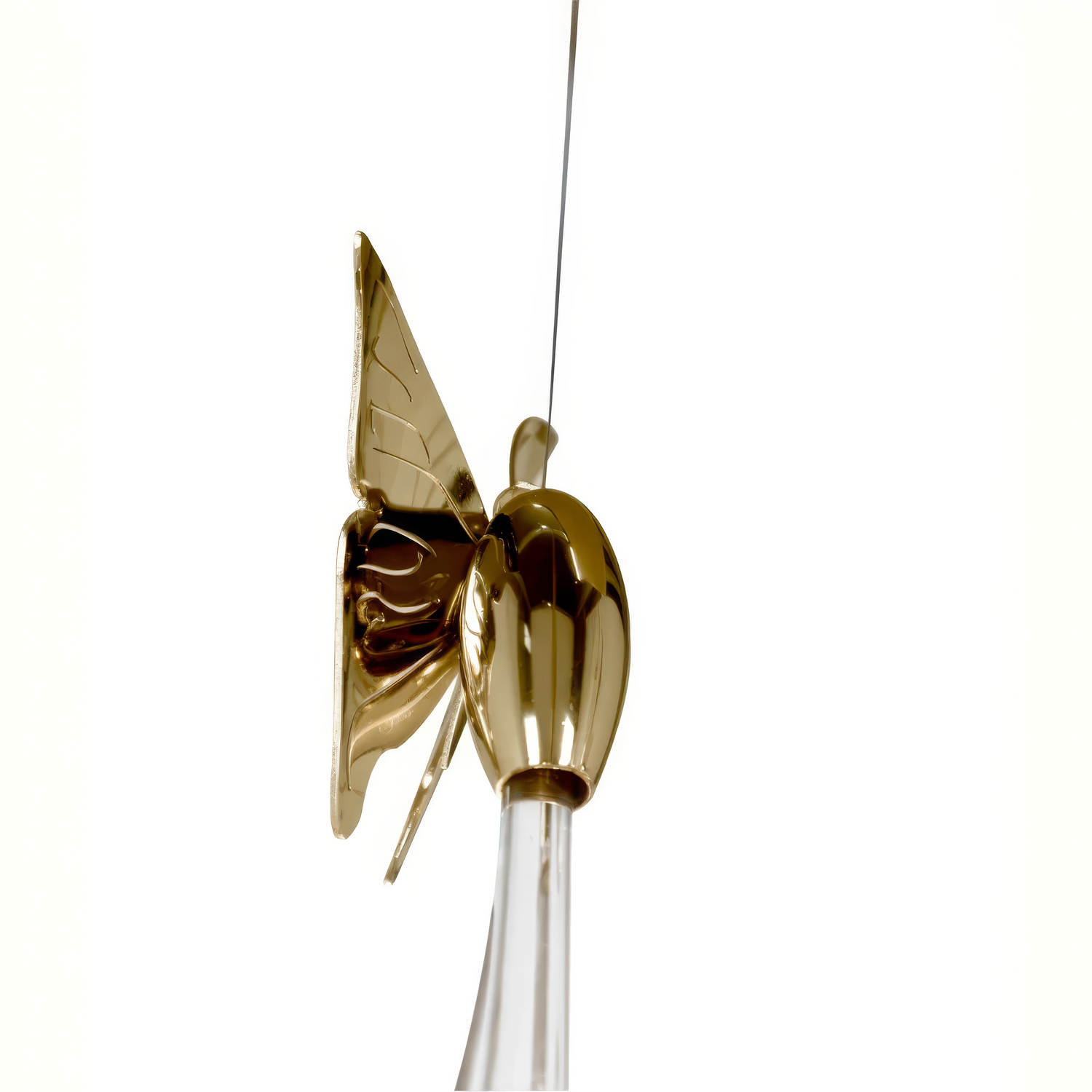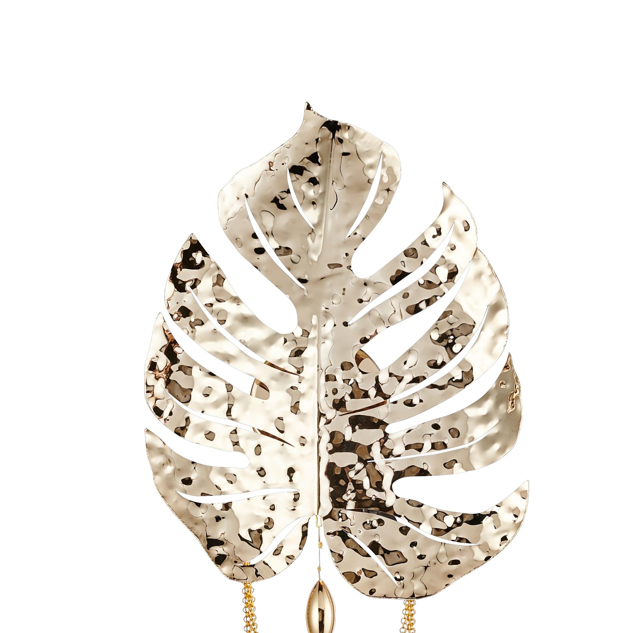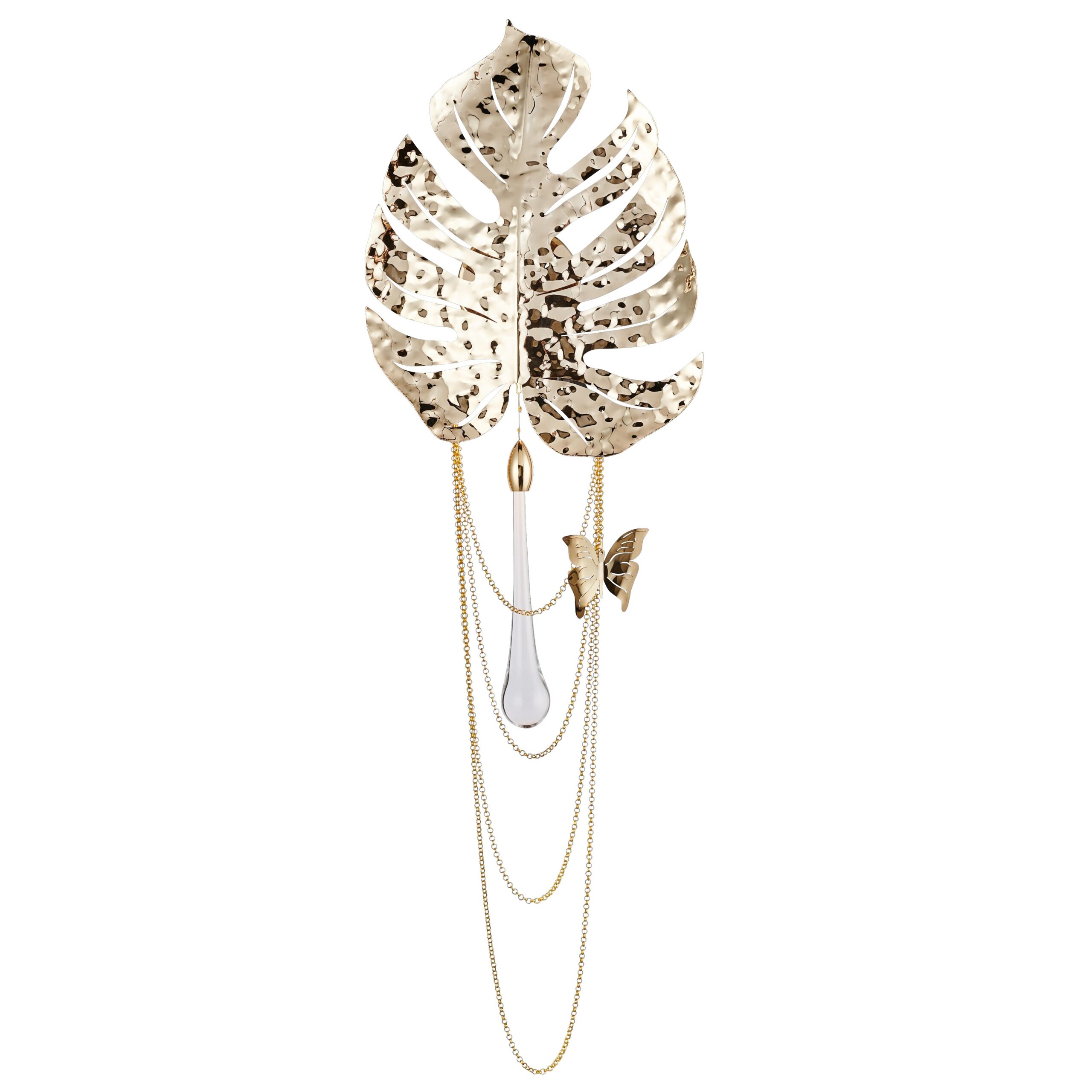 Доступны два варианта исполнения: изящная композиция из металлических листьев или более сложная версия с добавлением стеклянных элементов ручной работы. Металлические пластины обработаны мягким градиентом от светлой платины к бронзе; переход усиливает объёмность и подчёркивает изгибы листа. Стеклянные капсулы выдуваются вручную, имеют вытянутую форму и внутри слегка искрящуюся «песочную» текстуру, которая деликатно рассеивает свет.