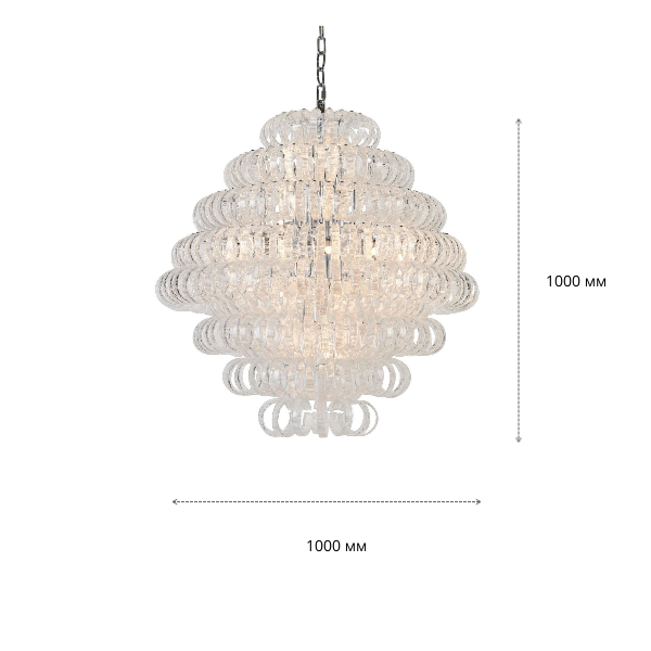 Структура светильника построена на многослойности: кольца разного диаметра собираются в ярусы, формируя выразительный силуэт. Стекло с рифлёной поверхностью преломляет свет с мягким свечением, а хромированные детали придают графичный блеск и современную точность.