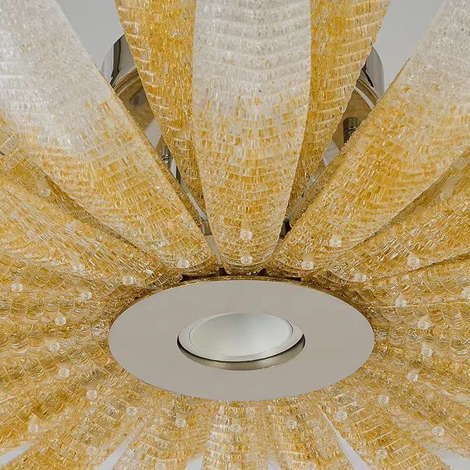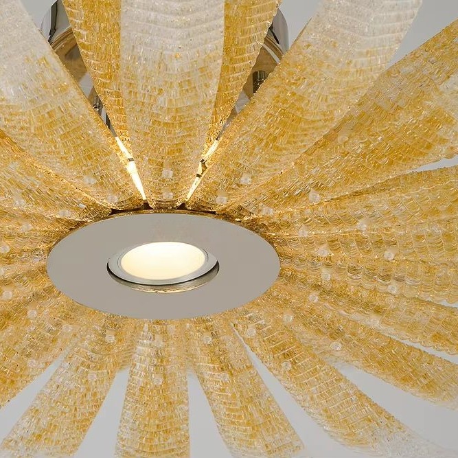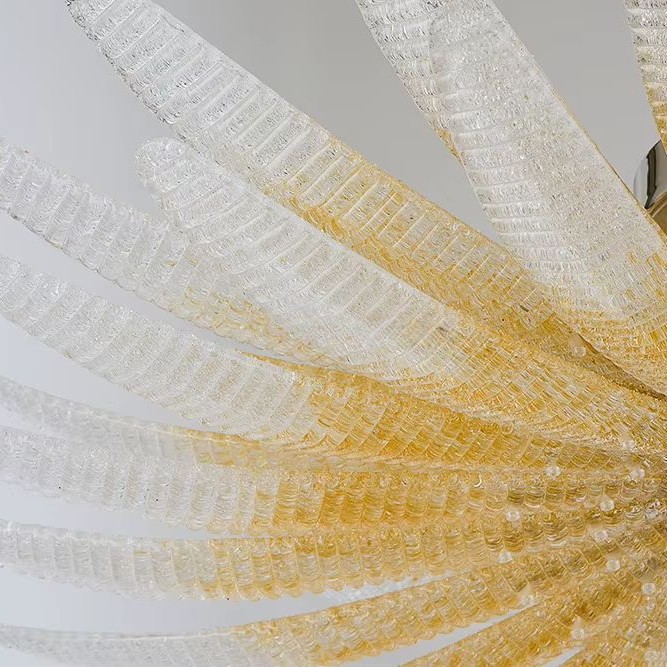 Сегменты выполнены из рельефного стекла с поперечной фактурой и прозрачной зернистостью. Градиент от молочно-белого к золотистому оттенку плавно меняет тональность света: золотистая часть даёт тёплое свечение, белые кончики — более холодное, воздушное. В толще стекла мерцает «песочная» текстура, добавляющая глубину и мягкость светового объёма. Основания и крепления — хромированные, с аккуратной полировкой.