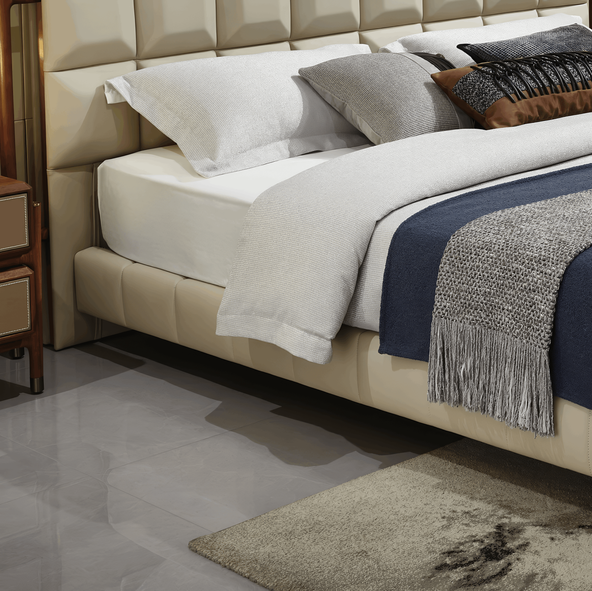 Кровать изготовлена из прочного американского черного дерева ореха, которое отличается своей долговечностью и уникальной текстурой. Обивка из кожи бувола придаёт дизайну роскошный вид и удивительную мягкость. Каждый элемент тщательно проработан, что делает эту кровать высоким произведением искусства.