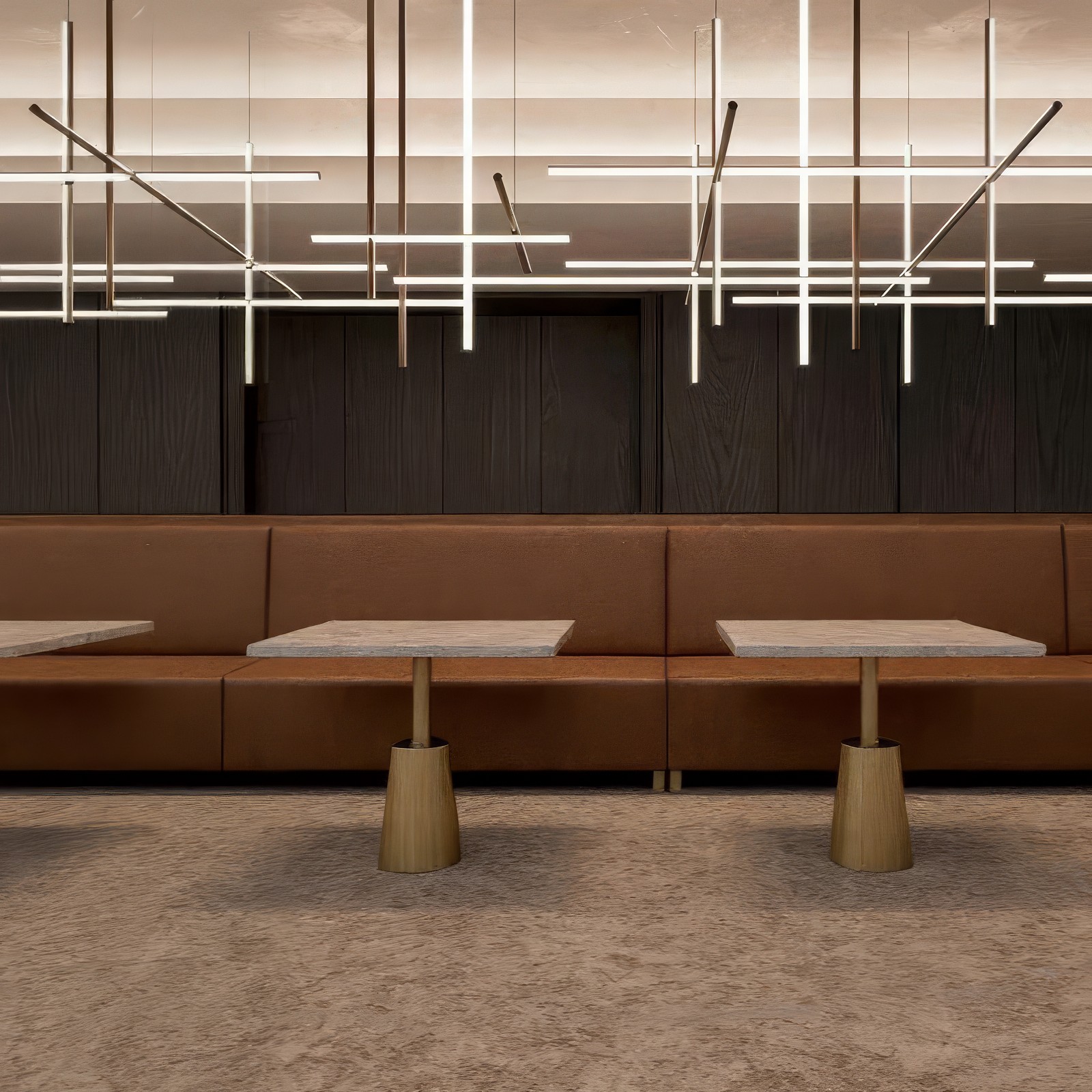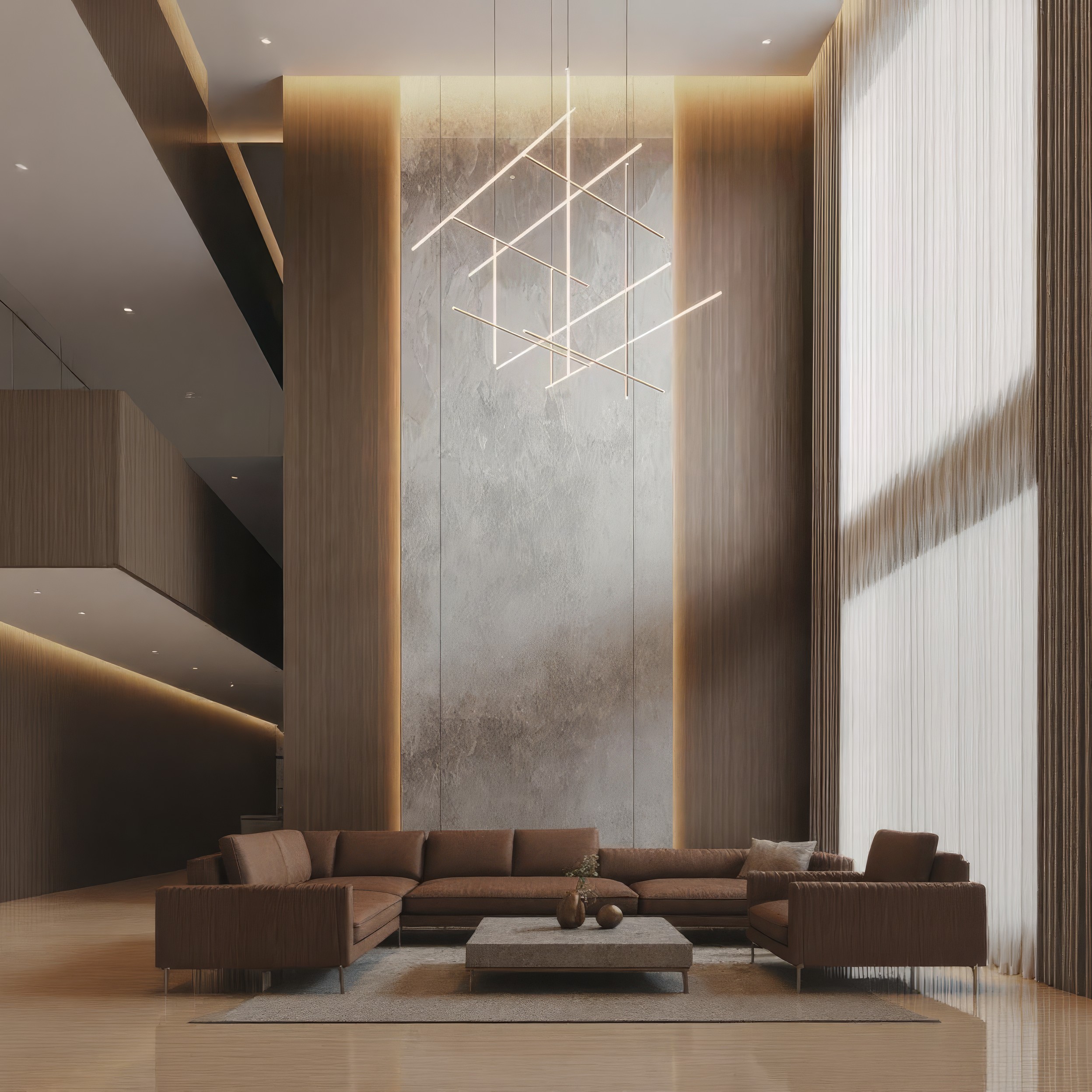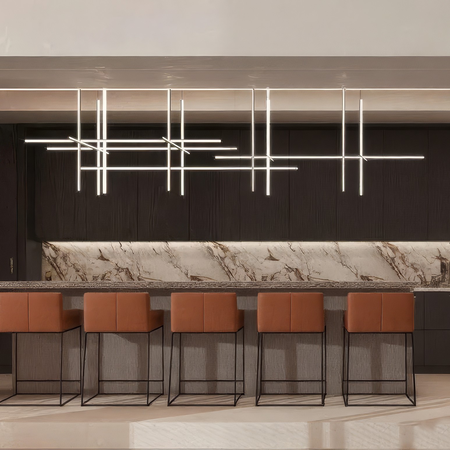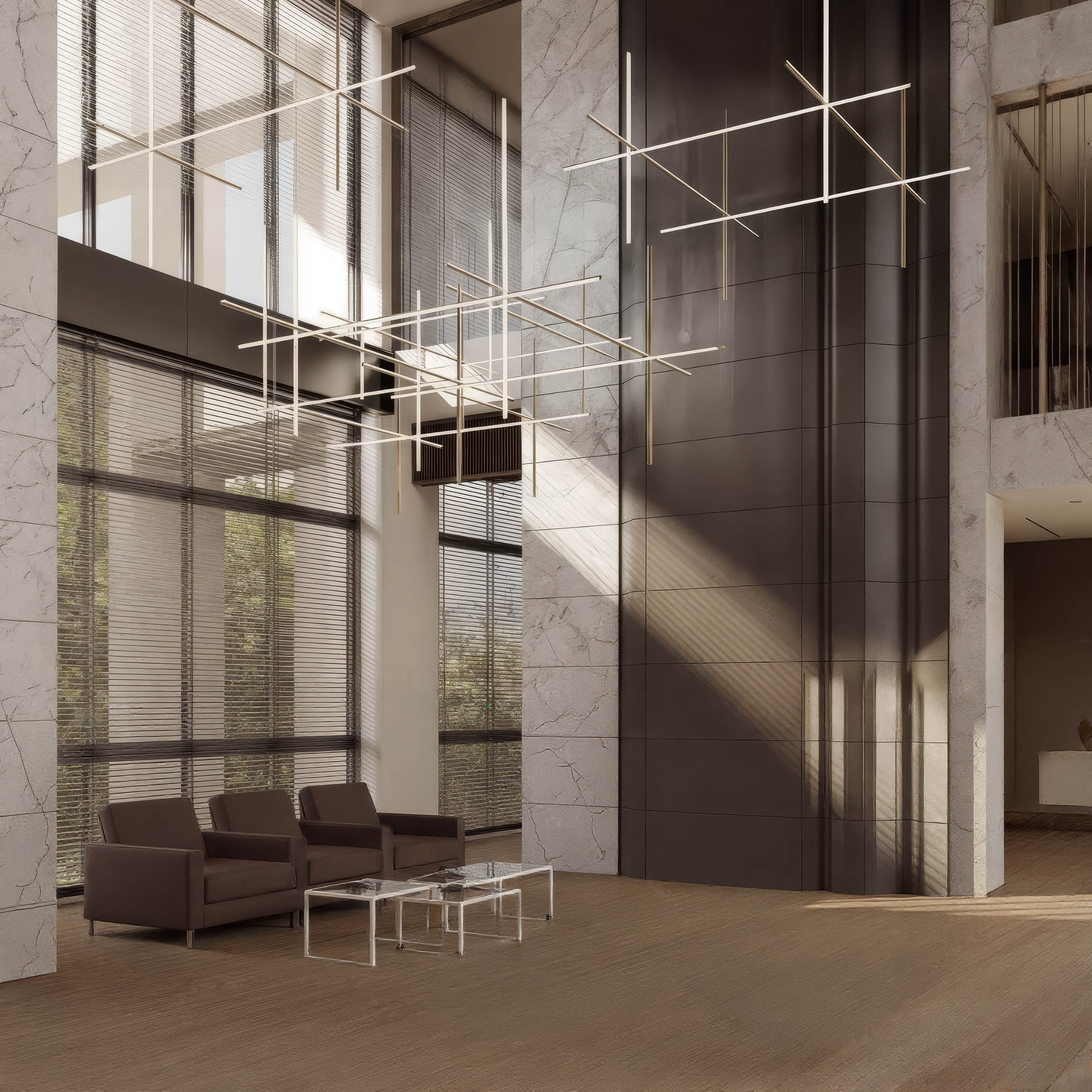Решётка из горизонтальных и вертикальных светящихся линий формирует воздушный объём, в котором свет становится частью архитектуры. Мягкое рассеянное свечение подчёркивает чёткость формы и одновременно создаёт тёплую атмосферу. Конструкция кажется невесомой благодаря скрытым креплениям и отсутствию визуального подвеса.