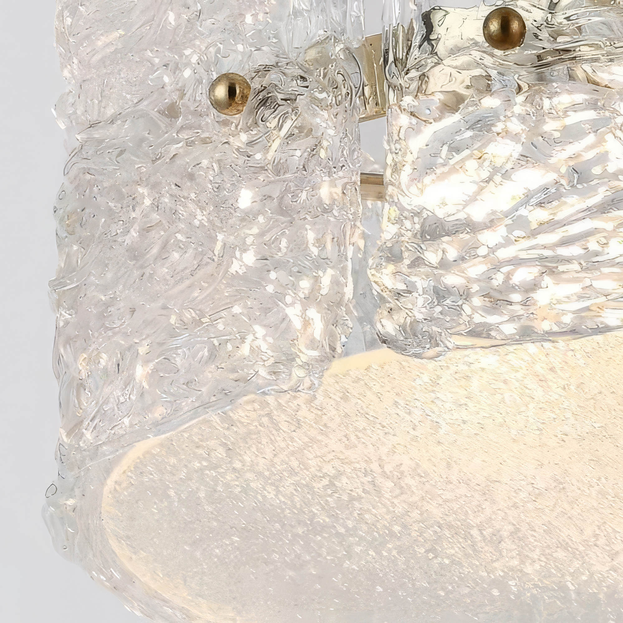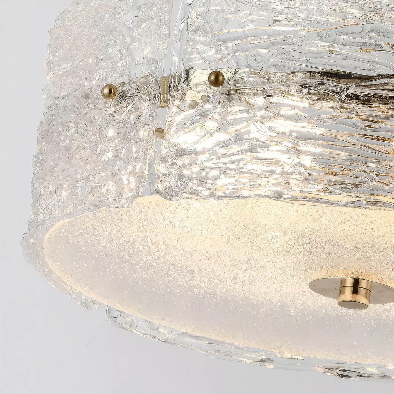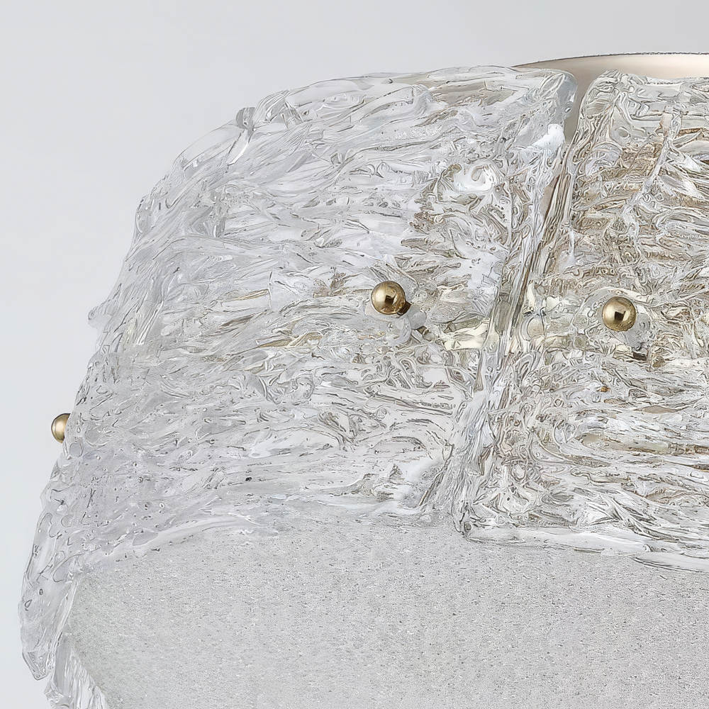 Каркас выполнен из металла с глянцевой платиновой отделкой, подвесы – тонкие и почти невидимые, поддерживают конструкцию в воздухе. Декоративный контур сформирован из массивных сегментов ручного стекла с выразительной фактурой – каждый элемент уникален, с неровными полосами и наплывами, будто следами застывающего потока. Нижняя часть закрыта матовым рассеивателем, мягко распределяющим свет по всему объёму.