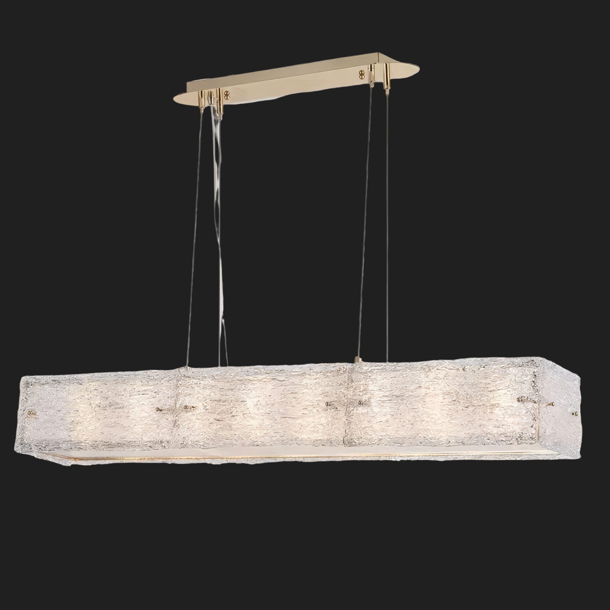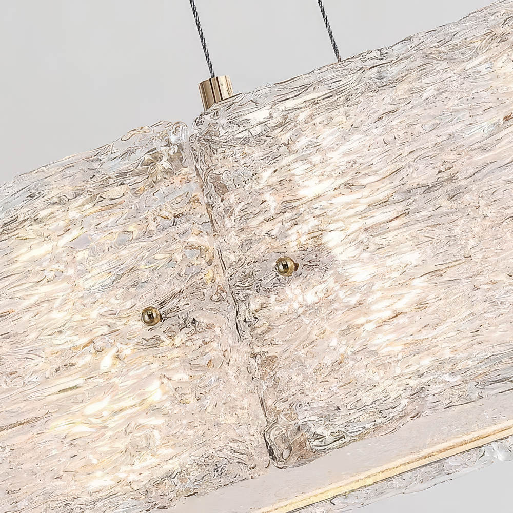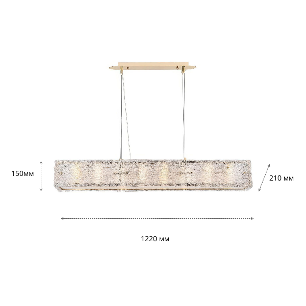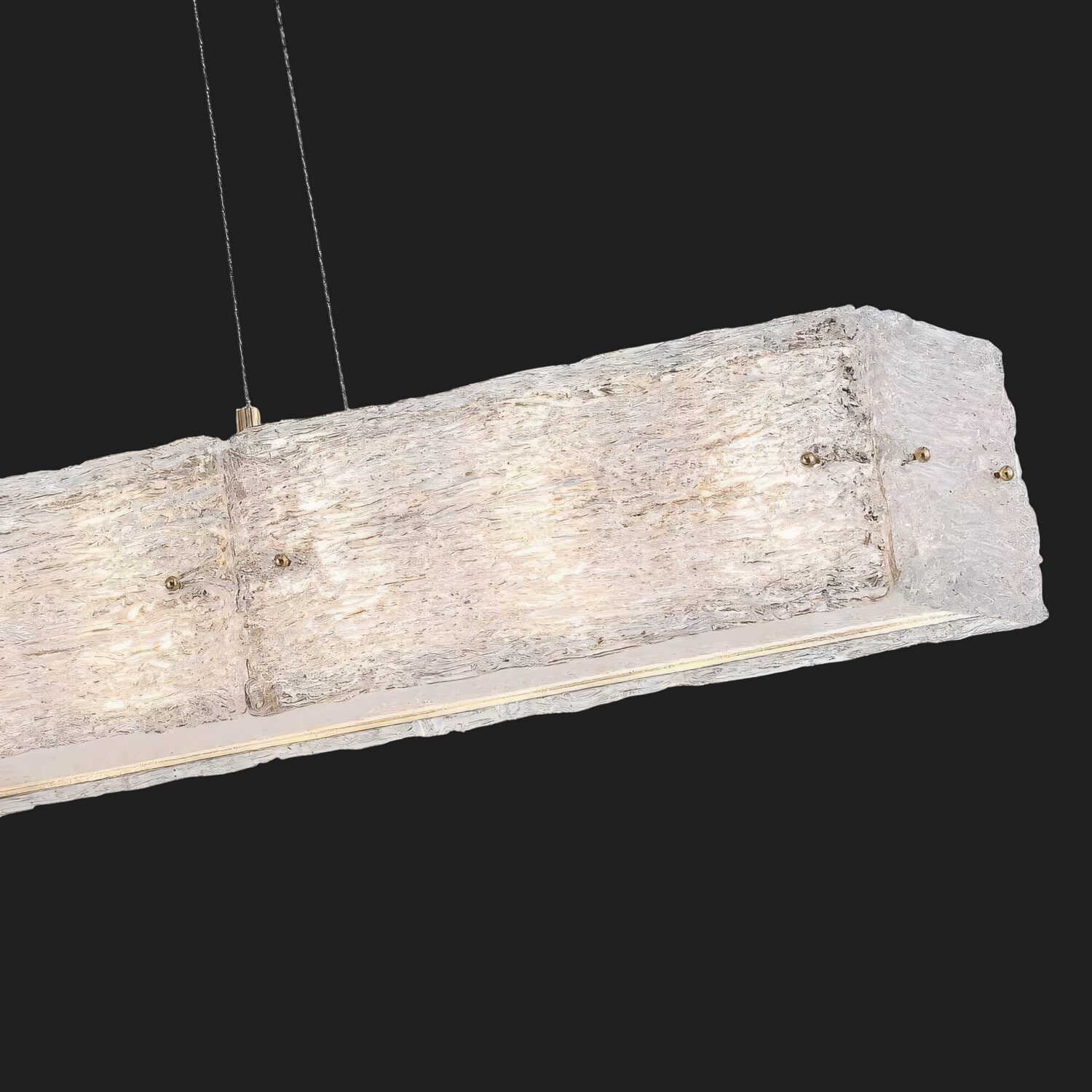 Каркас выполнен из металла с глянцевой платиновой отделкой, подвесы – тонкие и почти невидимые, поддерживают конструкцию в воздухе. Декоративный контур сформирован из массивных сегментов ручного стекла с выразительной фактурой – каждый элемент уникален, с неровными полосами и наплывами, будто следами застывающего потока. Нижняя часть закрыта матовым рассеивателем, мягко распределяющим свет по всему объёму.
