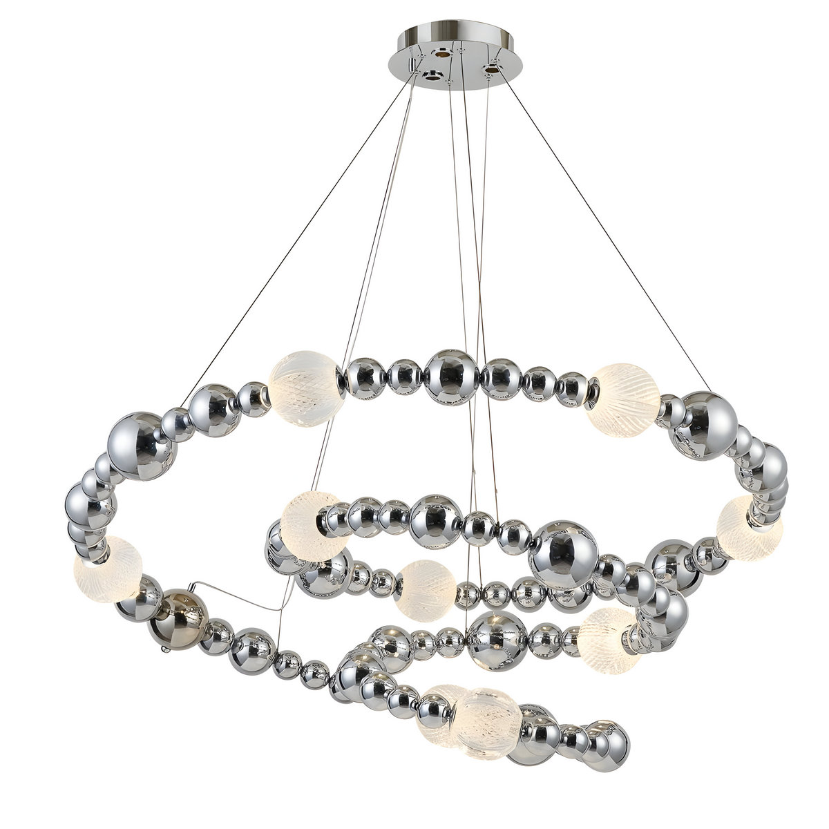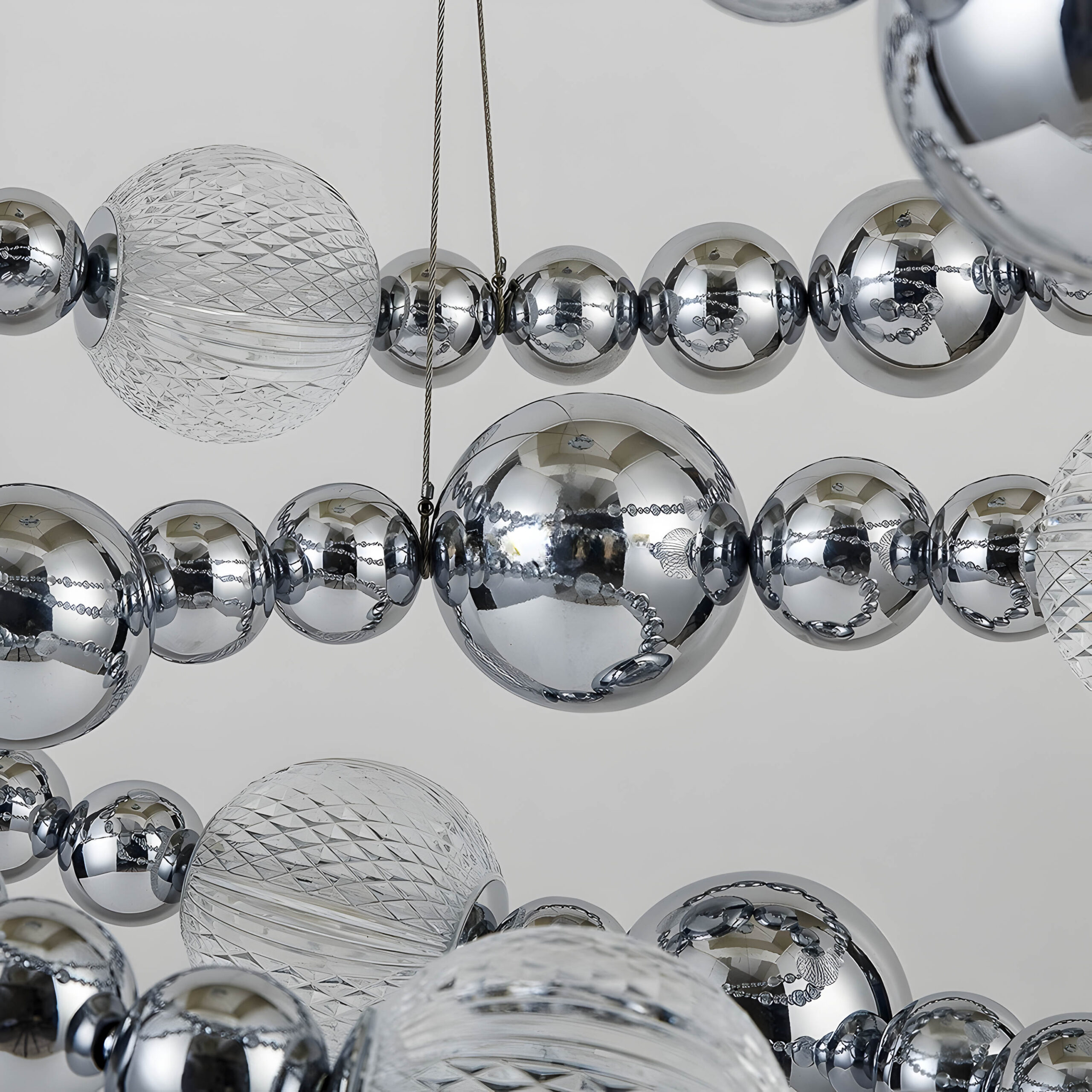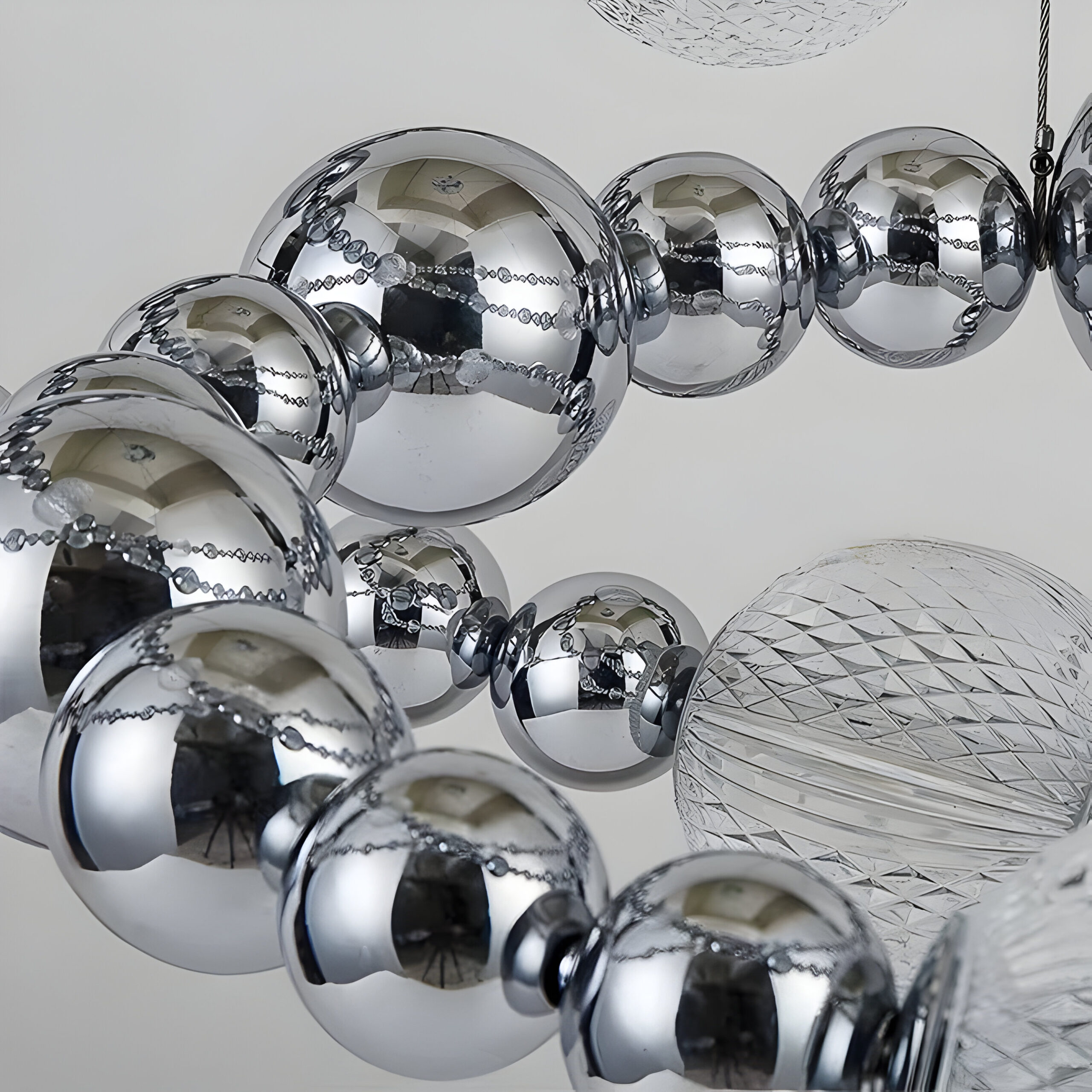 Каркас и декоративные элементы выполнены из нержавеющей стали с зеркальной полировкой и отделкой в трёх вариантах: тёплое «титан-золото», холодный «хром» и приглушённый чёрный с мягким металлическим отблеском. Светящиеся шары доступны в двух типах: из прозрачного плексигласа с тонкой внутренней гравировкой, создающей сетчатый рисунок рассеянного света, и из гладкого поликарбоната, дающего более ровное мягкое свечение.