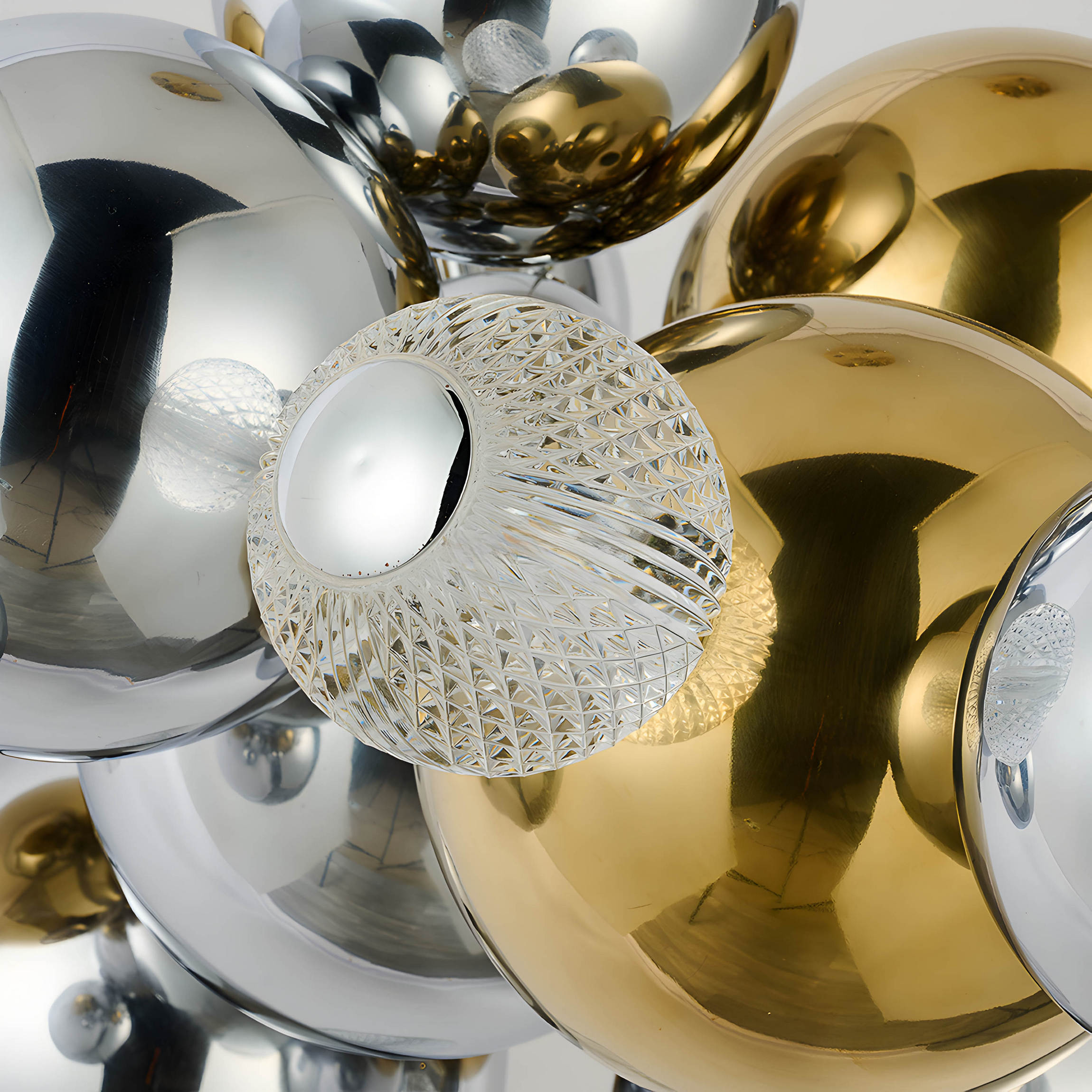 METAL BLOOM — серия, в которой металл перестаёт быть статичным. Отражающие сферы собираются в объемные конструкции, а встроенные источники света подчеркивают их контуры, создавая ощущение, что форма «раскрывается» прямо в пространстве. Свет мягко преломляется, скользит по граням и множится в зеркальных поверхностях, создавая ощущение энергии, динамики и современного ритма.
