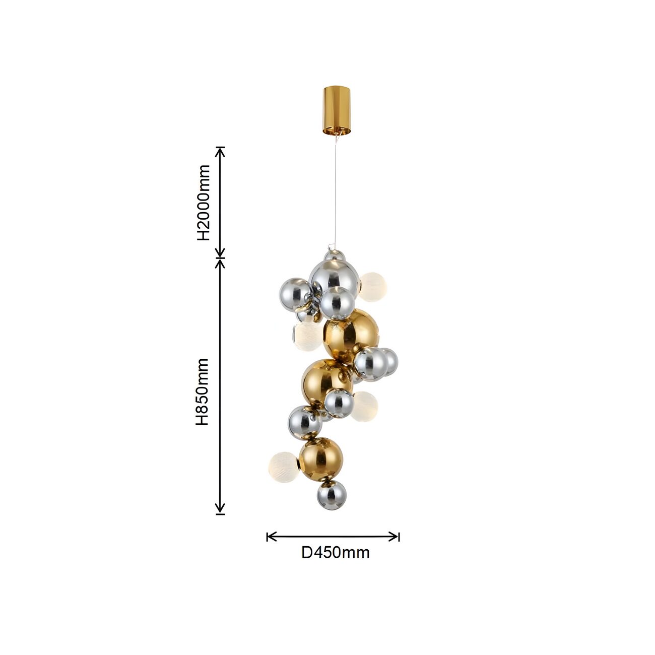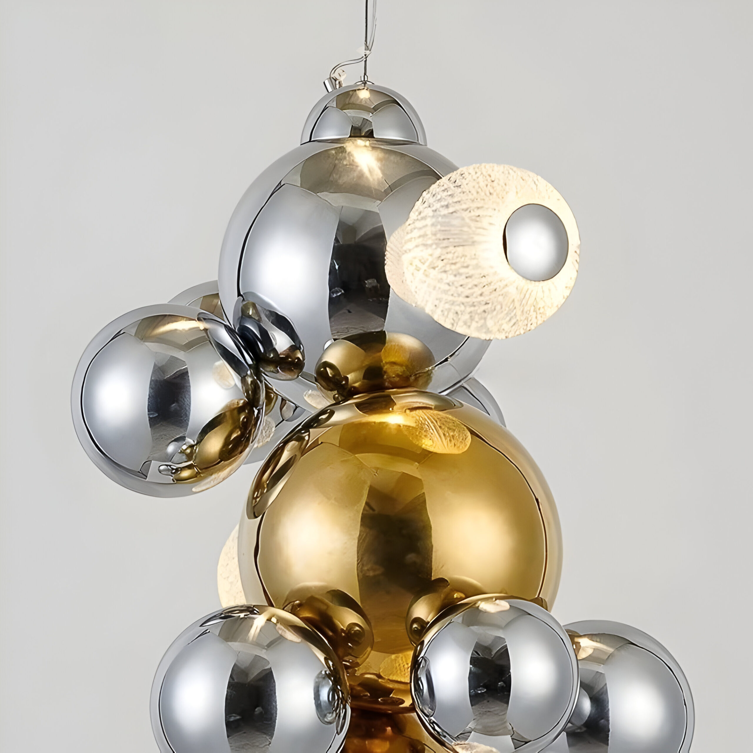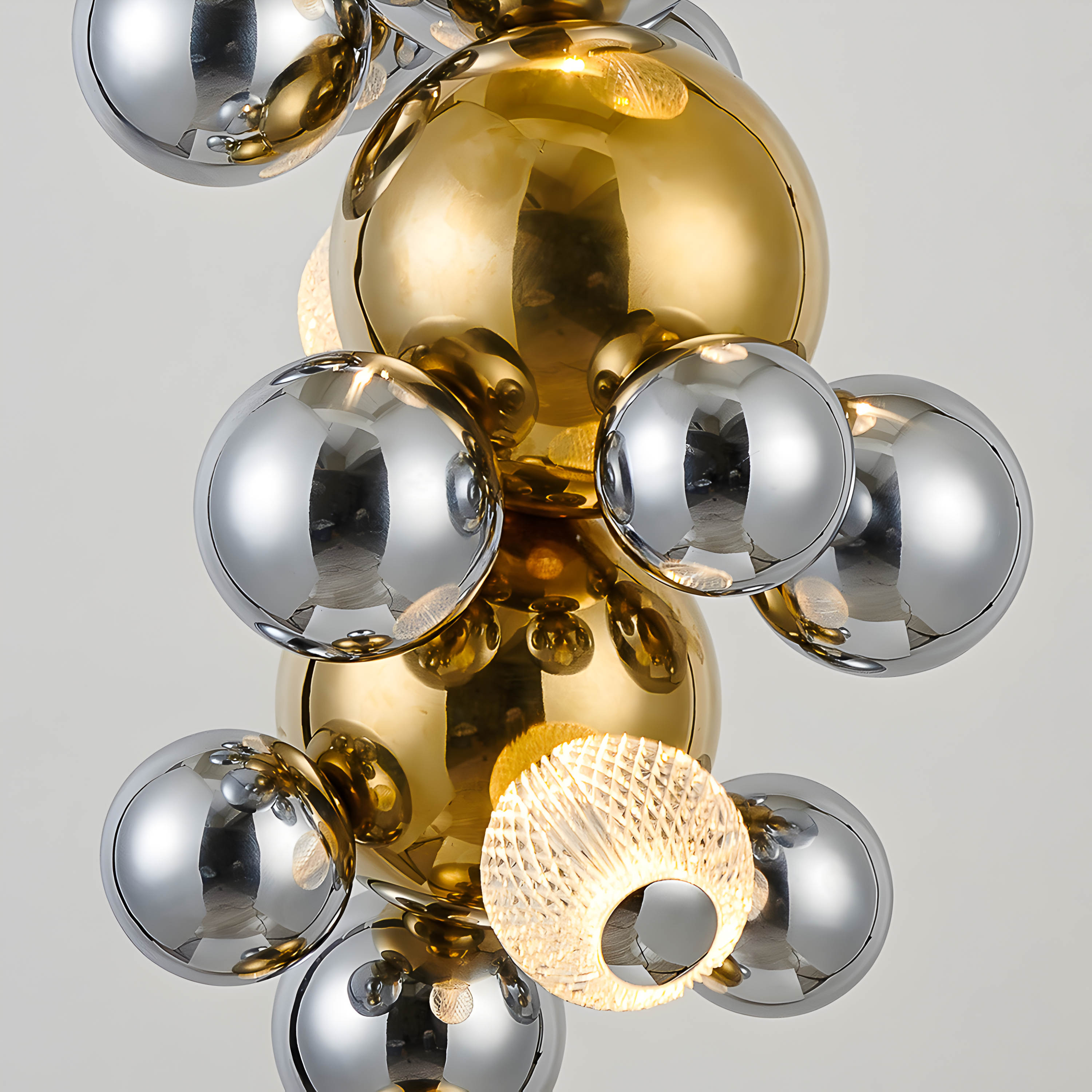 Каркас и декоративные элементы выполнены из нержавеющей стали с зеркальной полировкой и отделкой в трёх вариантах: тёплое «титан-золото», холодный «хром» и приглушённый чёрный с мягким металлическим отблеском. Светящиеся шары доступны в двух типах: из прозрачного плексигласа с тонкой внутренней гравировкой, создающей сетчатый рисунок рассеянного света, и из гладкого поликарбоната, дающего более ровное мягкое свечение.