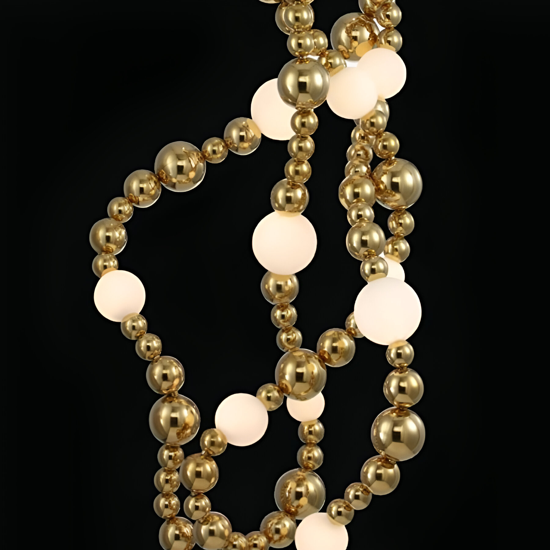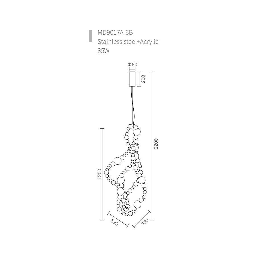 Каркас и декоративные элементы выполнены из нержавеющей стали с зеркальной полировкой и отделкой в трёх вариантах: тёплое «титан-золото», холодный «хром» и приглушённый чёрный с мягким металлическим отблеском. Светящиеся шары доступны в двух типах: из прозрачного плексигласа с тонкой внутренней гравировкой, создающей сетчатый рисунок рассеянного света, и из гладкого поликарбоната, дающего более ровное мягкое свечение.