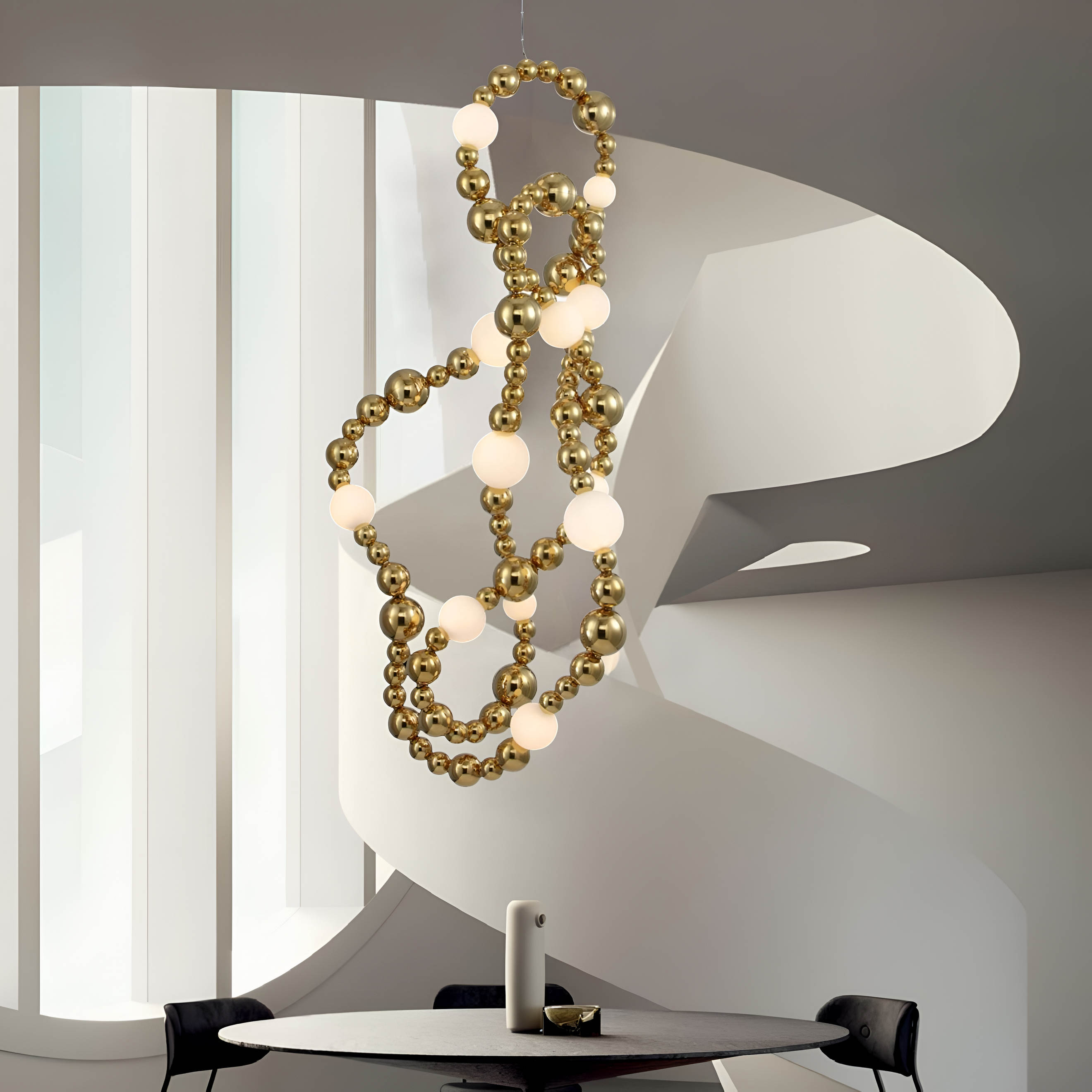 Серия METAL BLOOM включает потолочные люстры различных форм: от компактных кластеров, напоминающих облака, до многорядных колец и динамичных спиралей, идеально подходящих для высоких залов. Вариативность размеров и геометрий, а также наличие бра и торшера позволяют легко интегрировать светильники в проекты любого масштаба — от уютных интерьеров до масштабных общественных пространств.