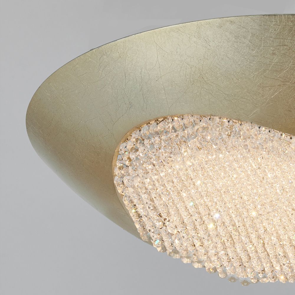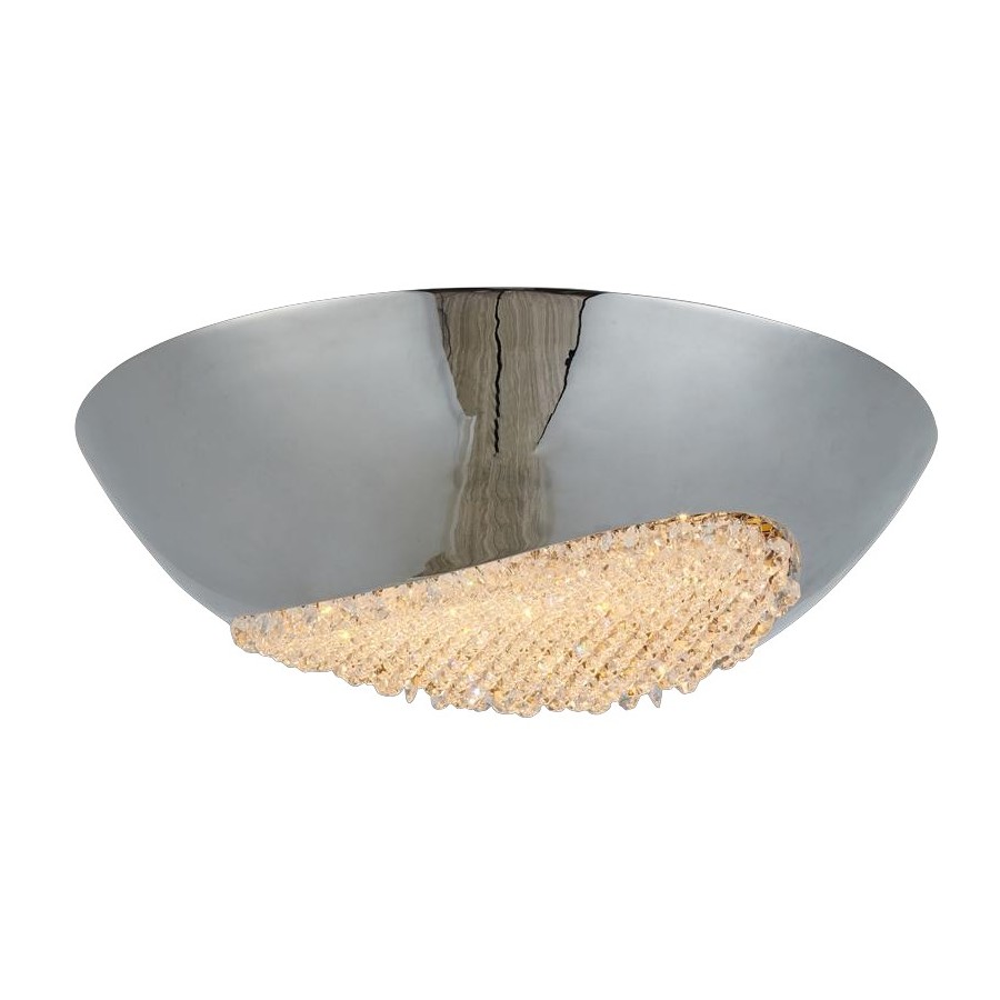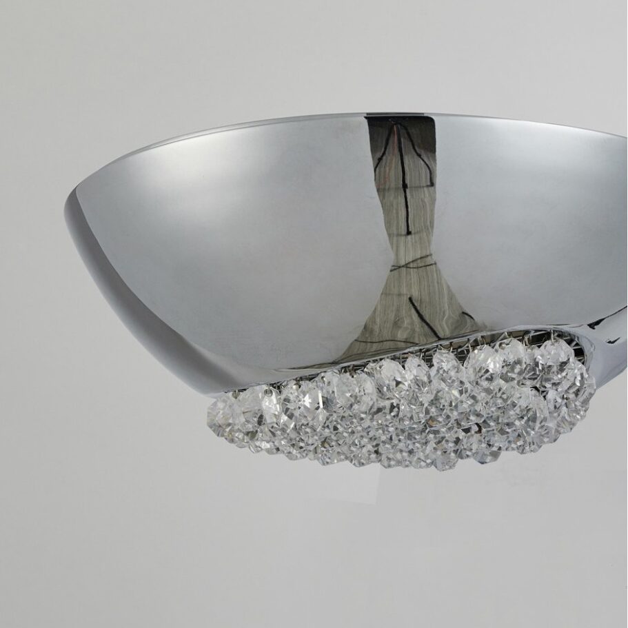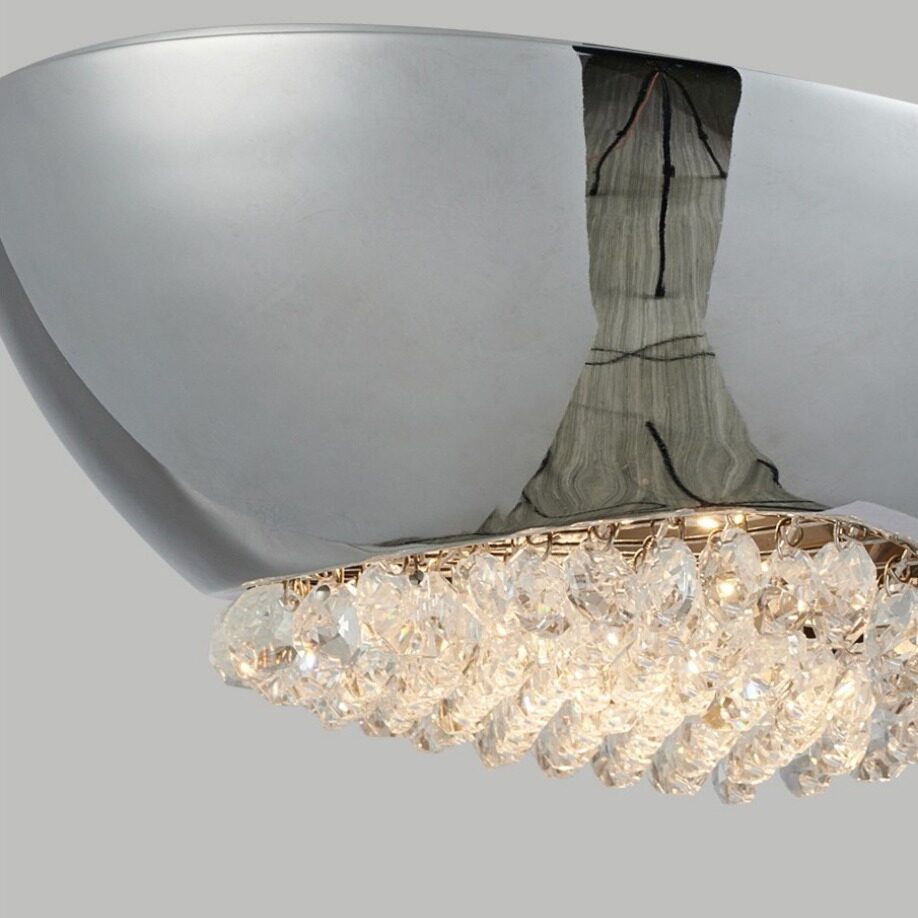 Корпус светильников выполнен в форме идеальной полусферы, напоминающей классическое «летающее блюдце». Верхняя часть — из металла с эффектным финишем: блестящий хром, золото и шампань с матовым фольгированным покрытием. Внутри — каскад гранёных кристаллов K9, собранных так, что они формируют волнообразную структуру и создают мощное, рассеянное сияние.