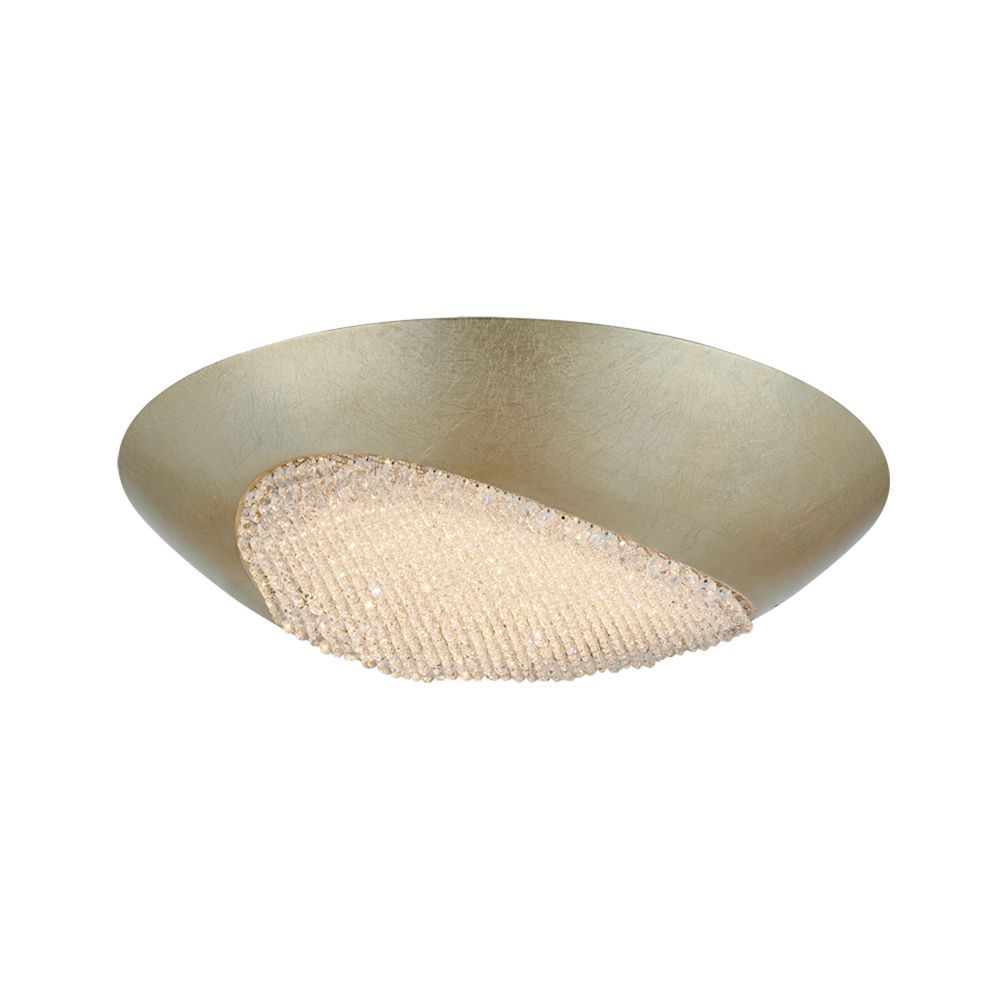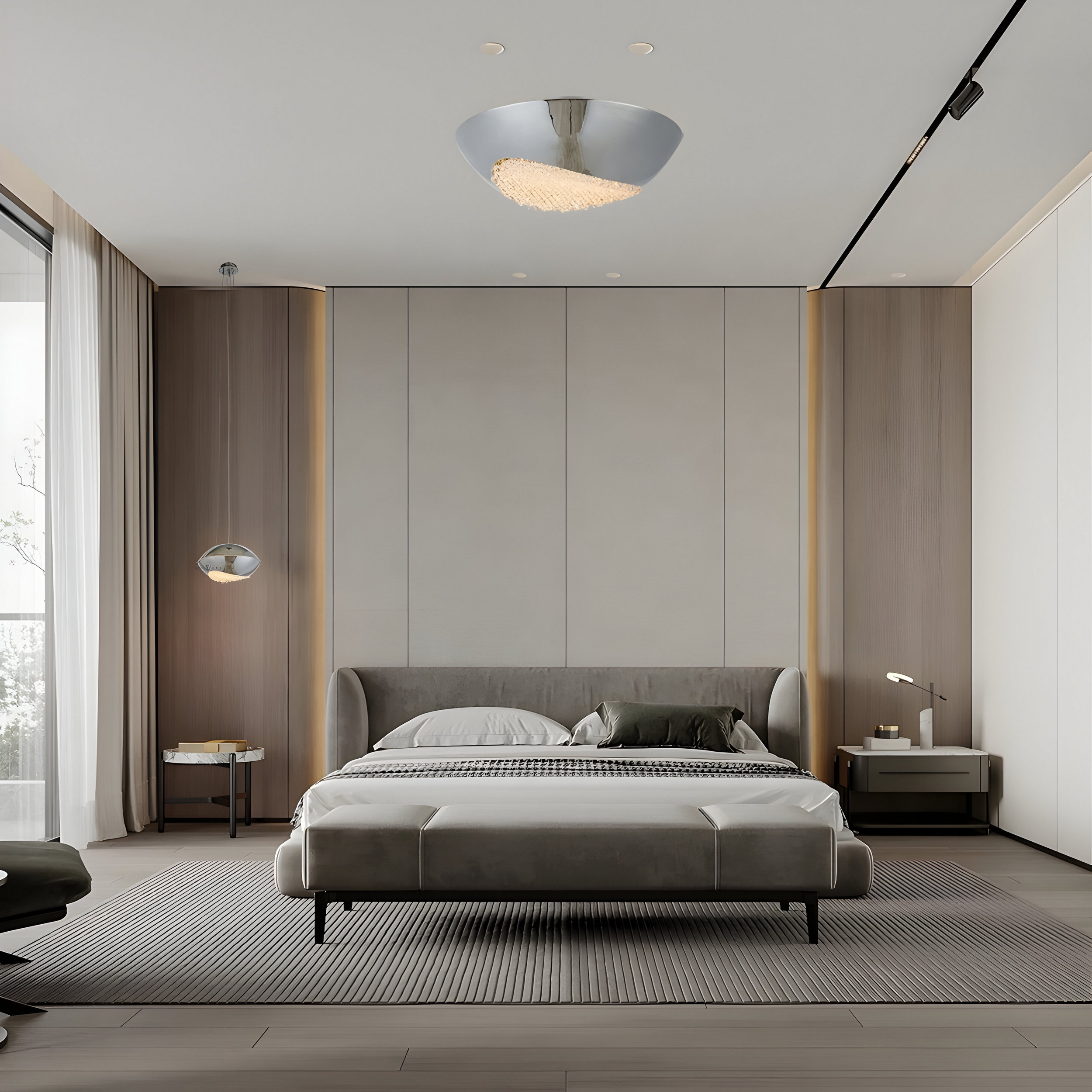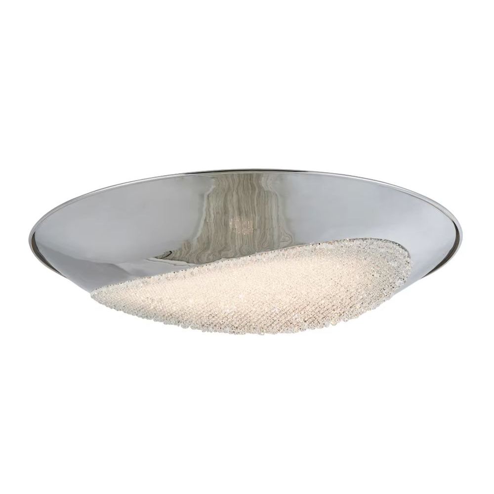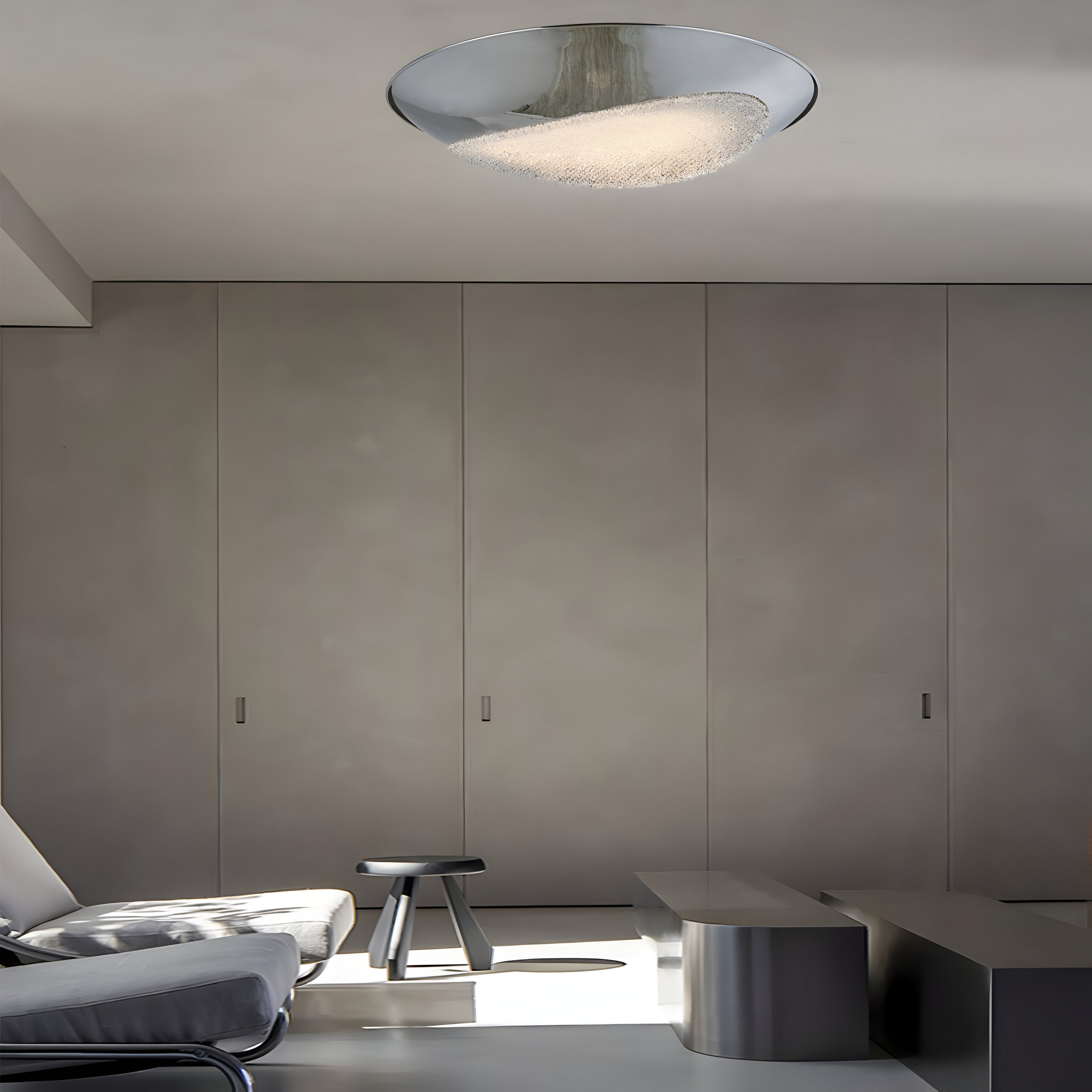 Корпус светильников выполнен в форме идеальной полусферы, напоминающей классическое «летающее блюдце». Верхняя часть — из металла с эффектным финишем: блестящий хром, золото и шампань с матовым фольгированным покрытием. Внутри — каскад гранёных кристаллов K9, собранных так, что они формируют волнообразную структуру и создают мощное, рассеянное сияние.