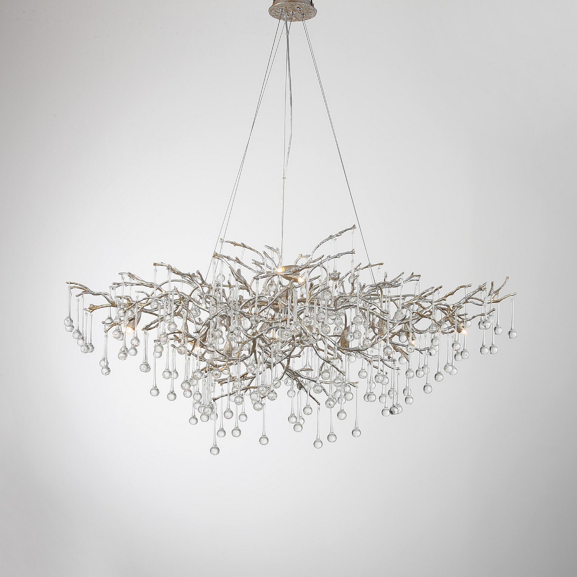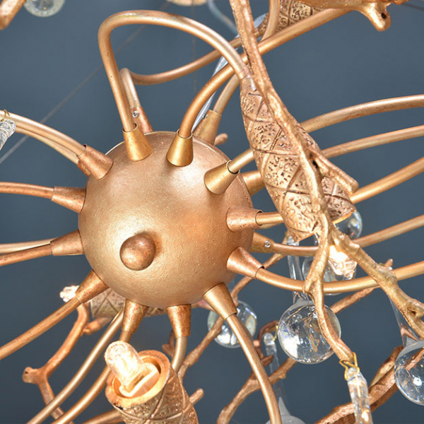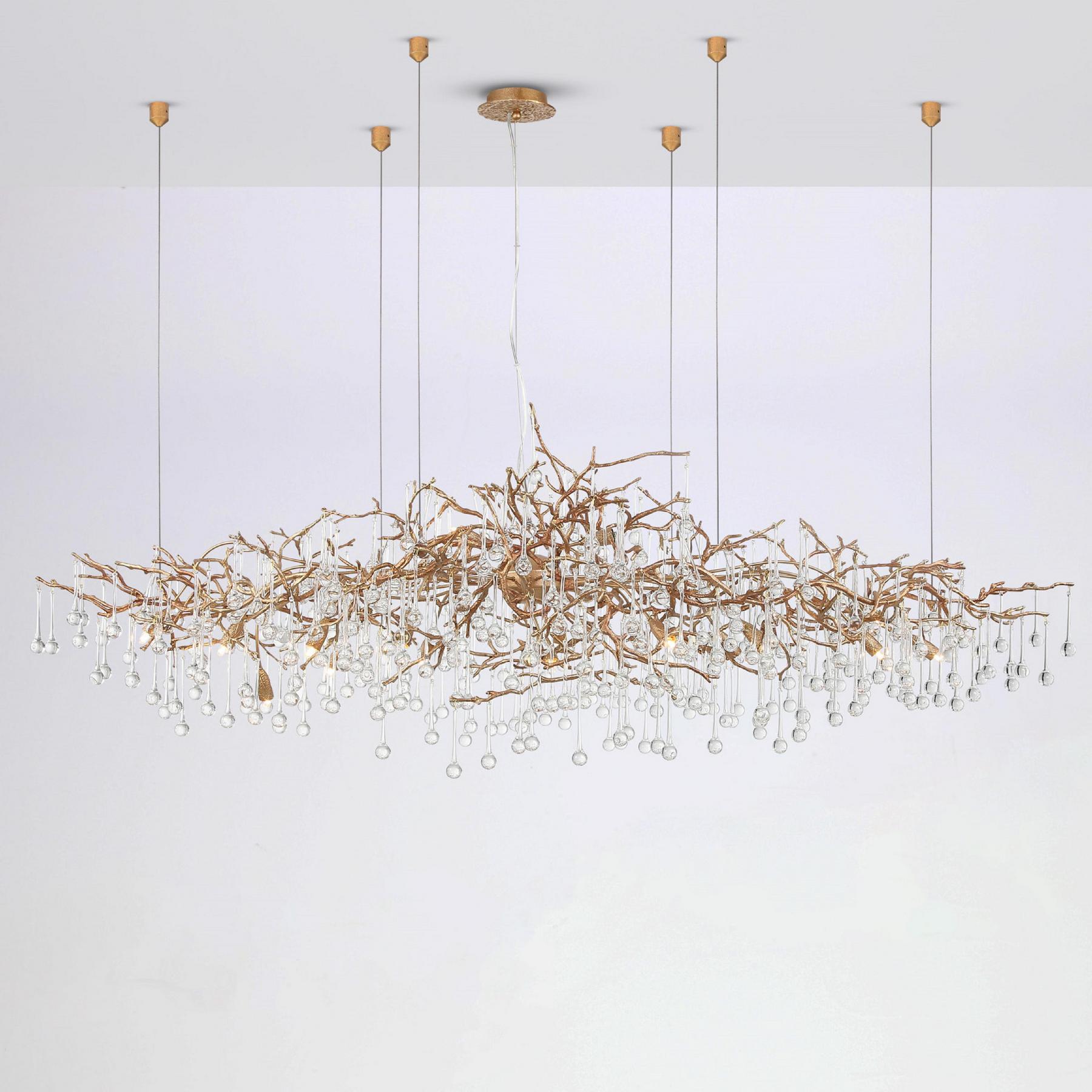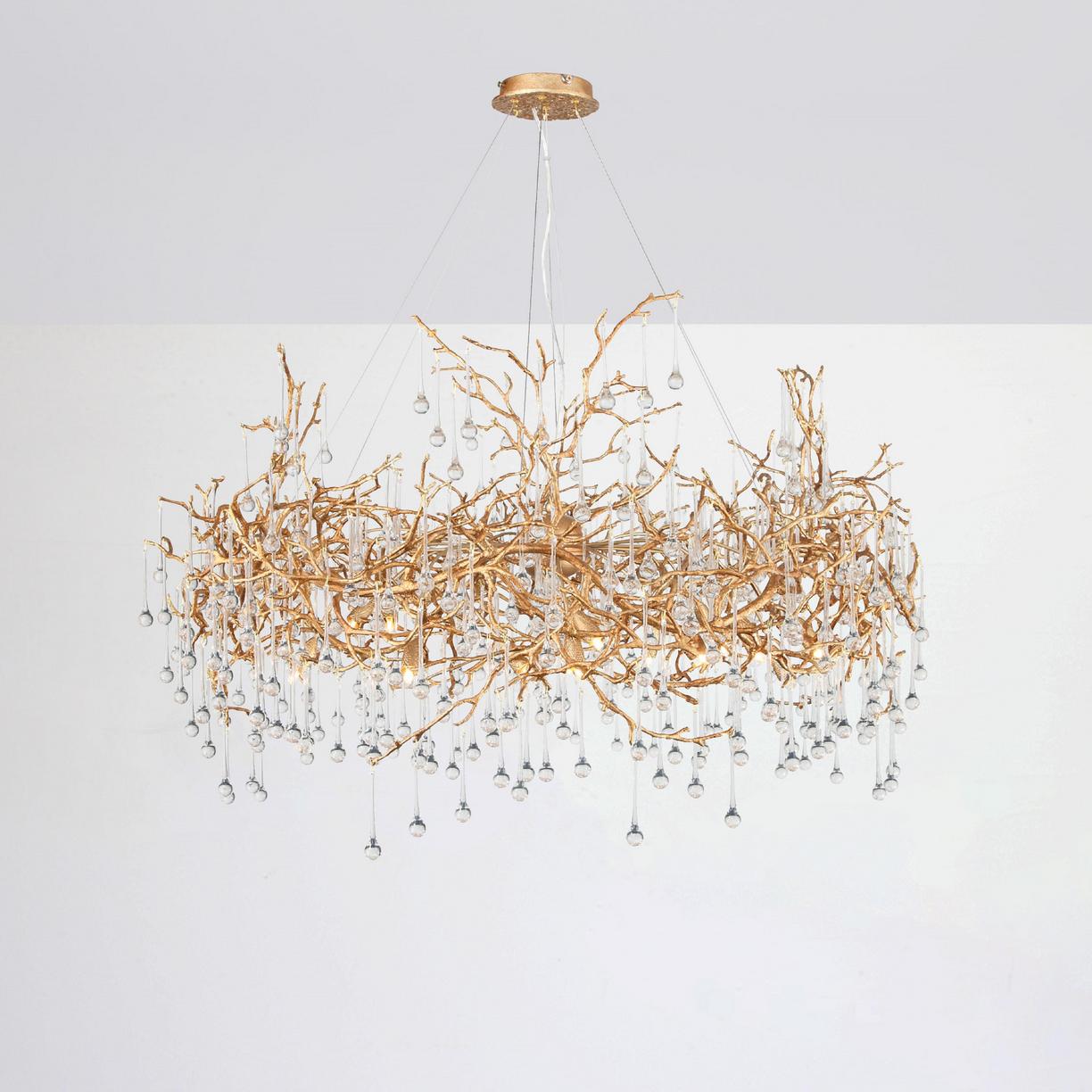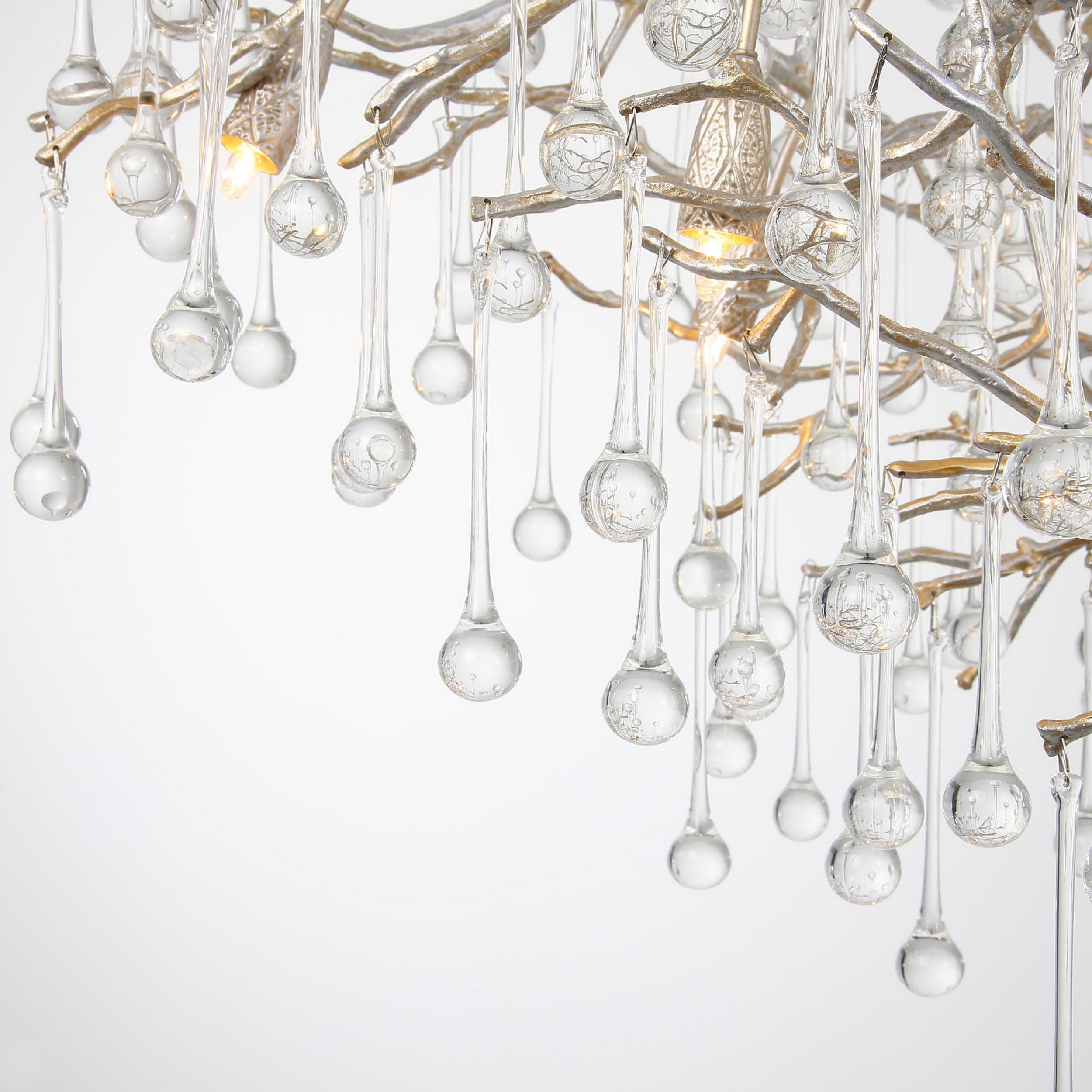 Скрытые лампы оживляют композицию: свет струится по металлу, подчёркивая текстуру ветвей, а стеклянные элементы вспыхивают сотнями бликов, превращая люстру в светящийся дождь. В медном исполнении люстра излучает тёплое золотистое сияние, а в алюминиевом — холодное лунное мерцание.