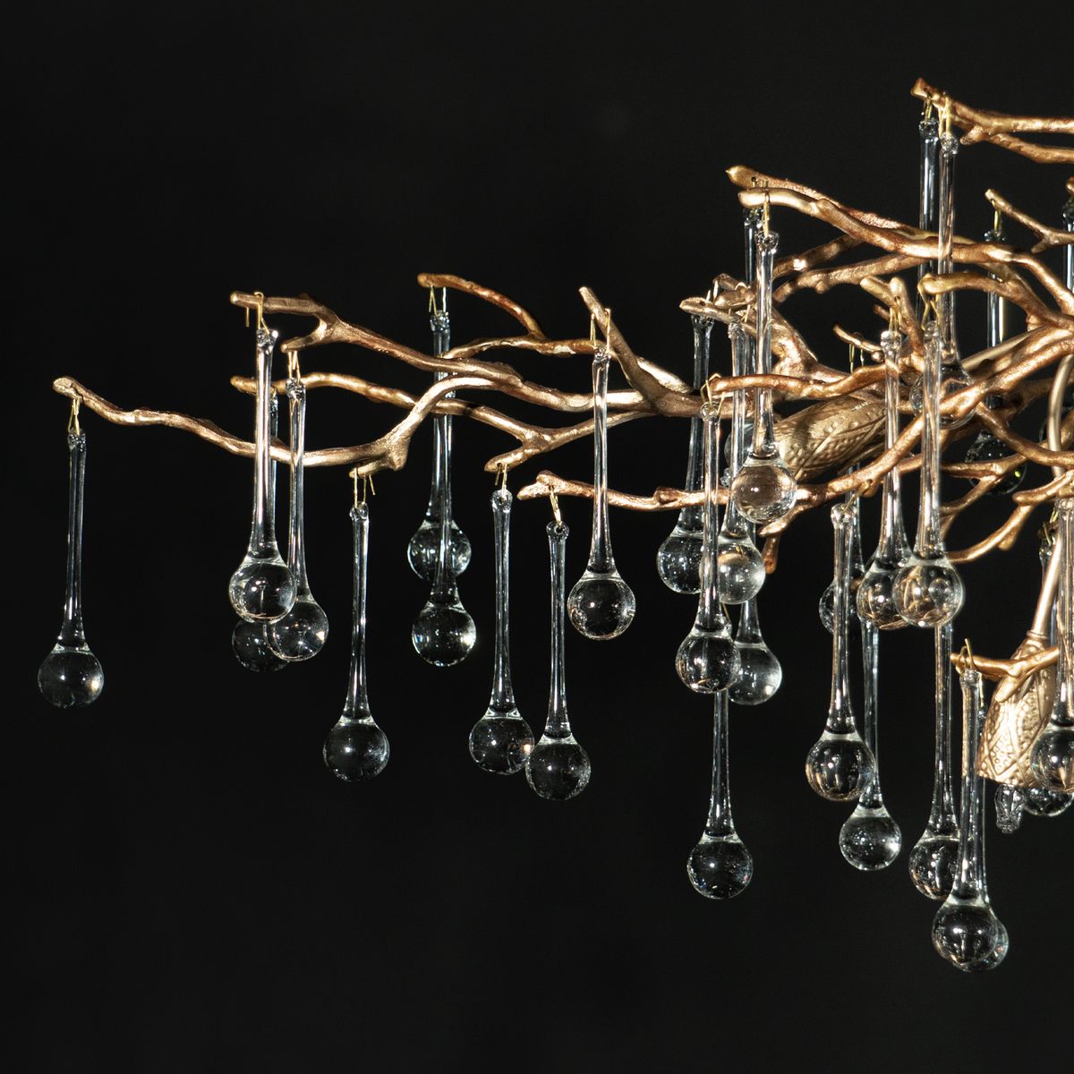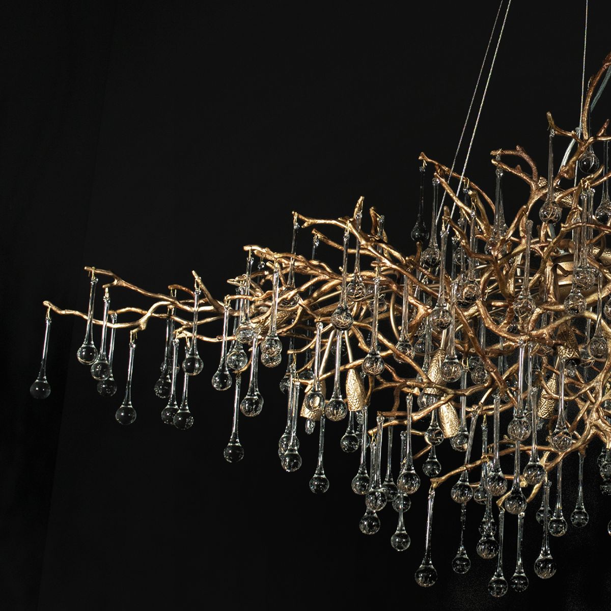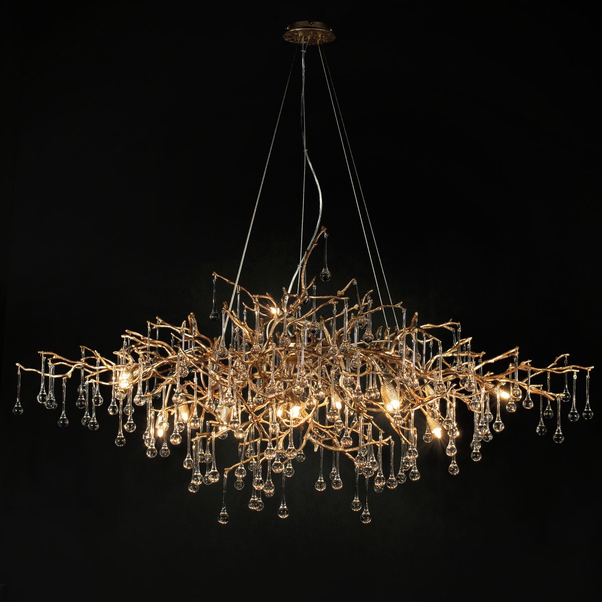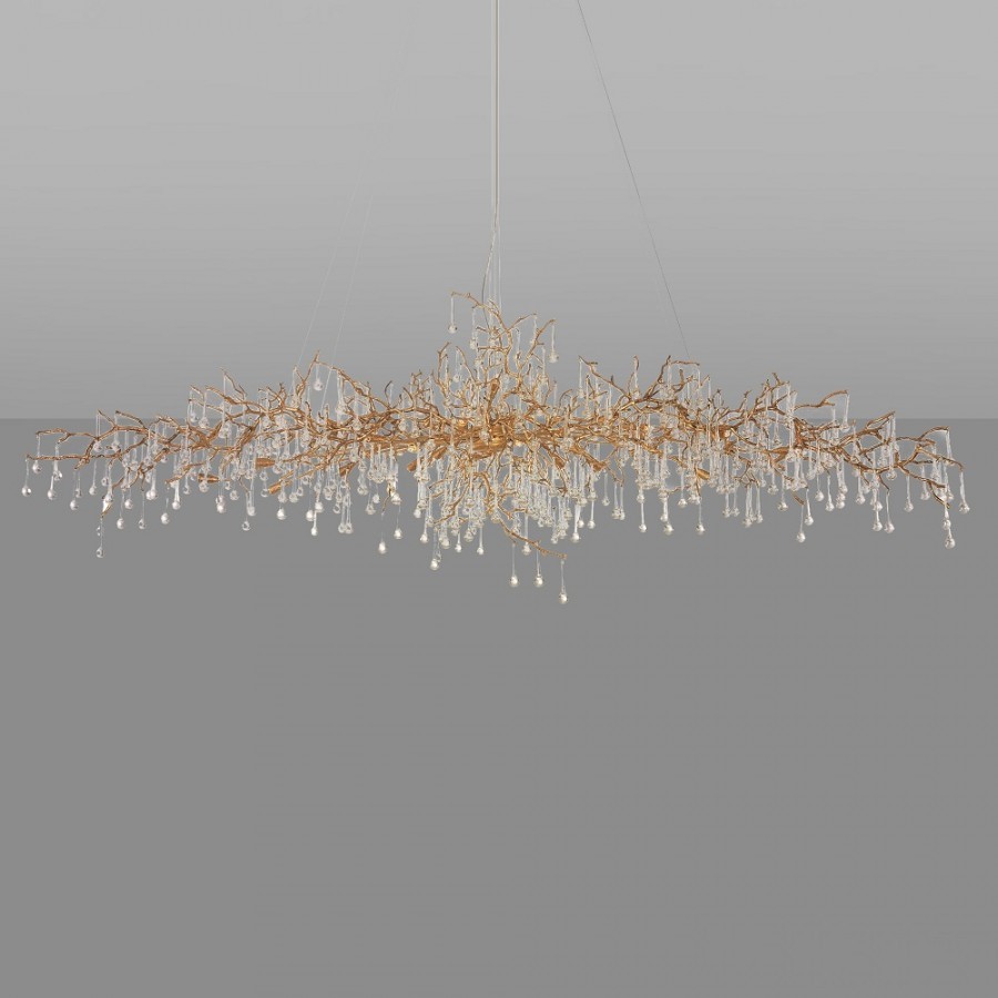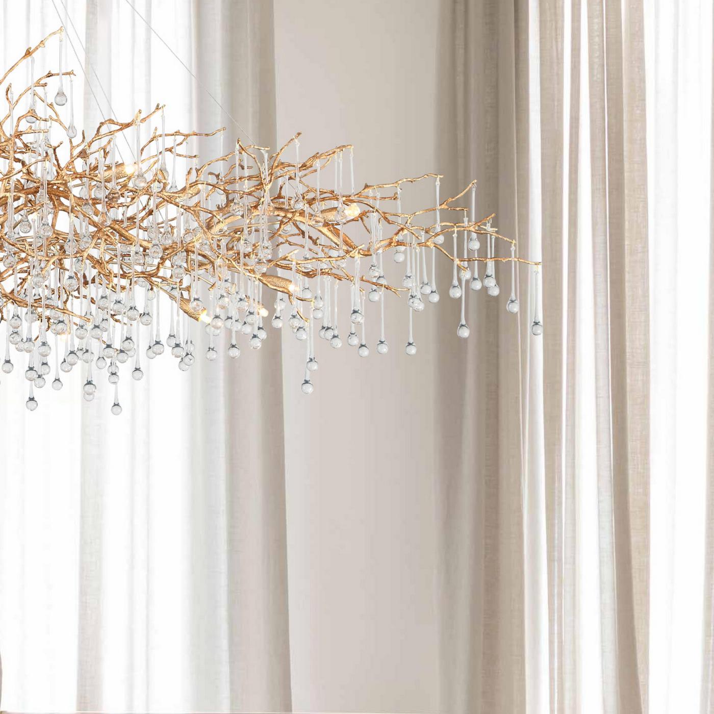 Скрытые лампы оживляют композицию: свет струится по металлу, подчёркивая текстуру ветвей, а стеклянные элементы вспыхивают сотнями бликов, превращая люстру в светящийся дождь. В медном исполнении люстра излучает тёплое золотистое сияние, а в алюминиевом — холодное лунное мерцание.