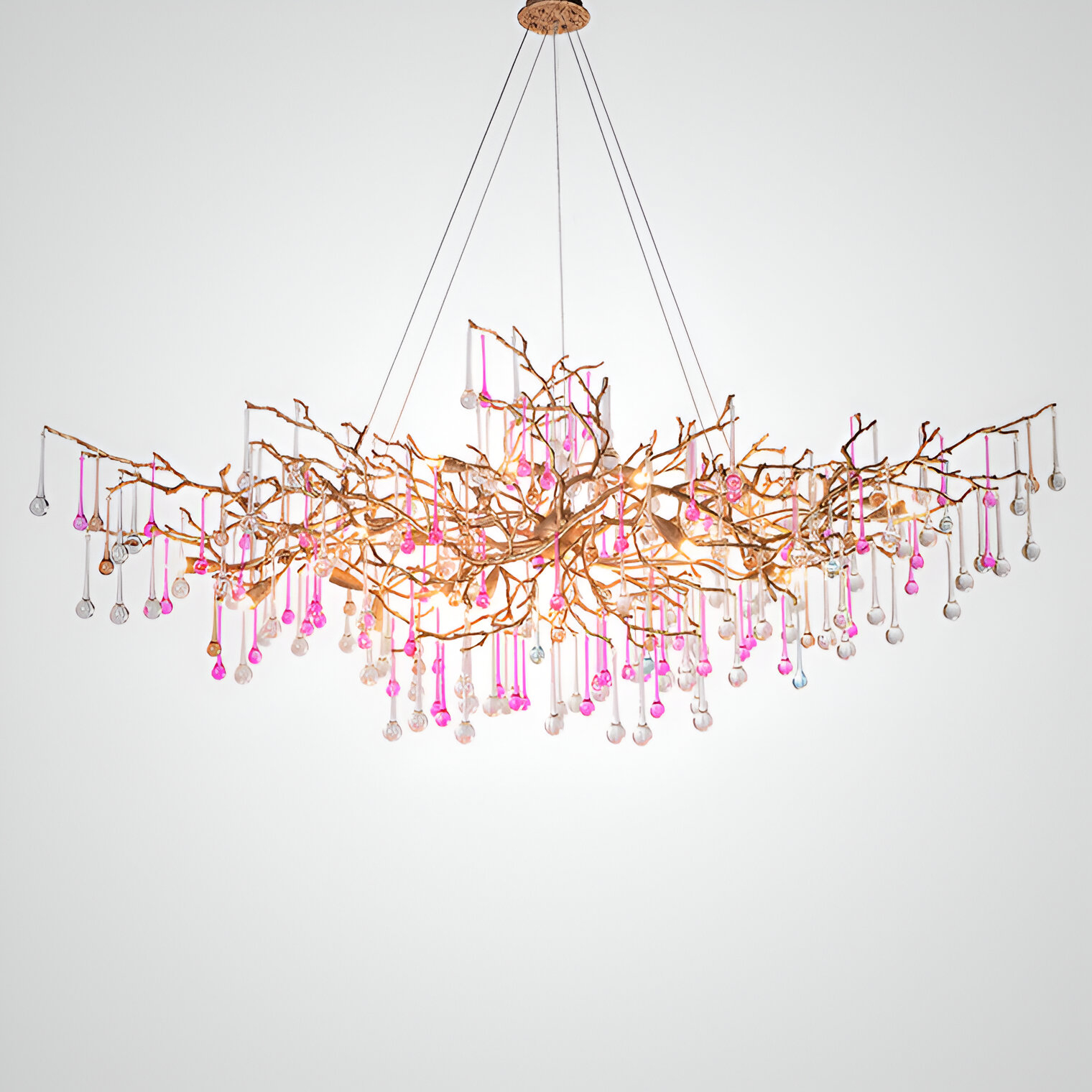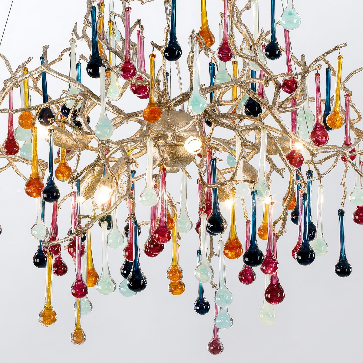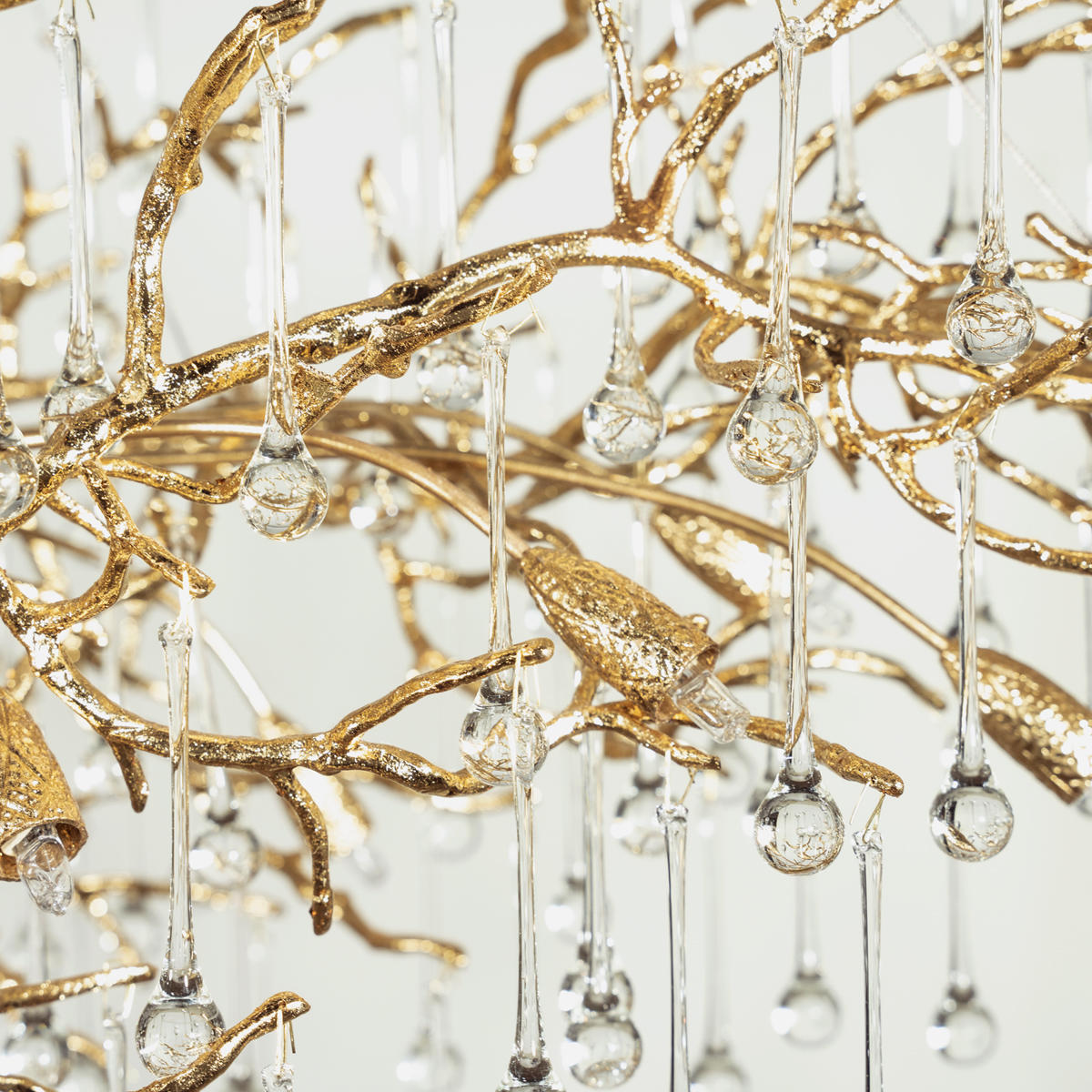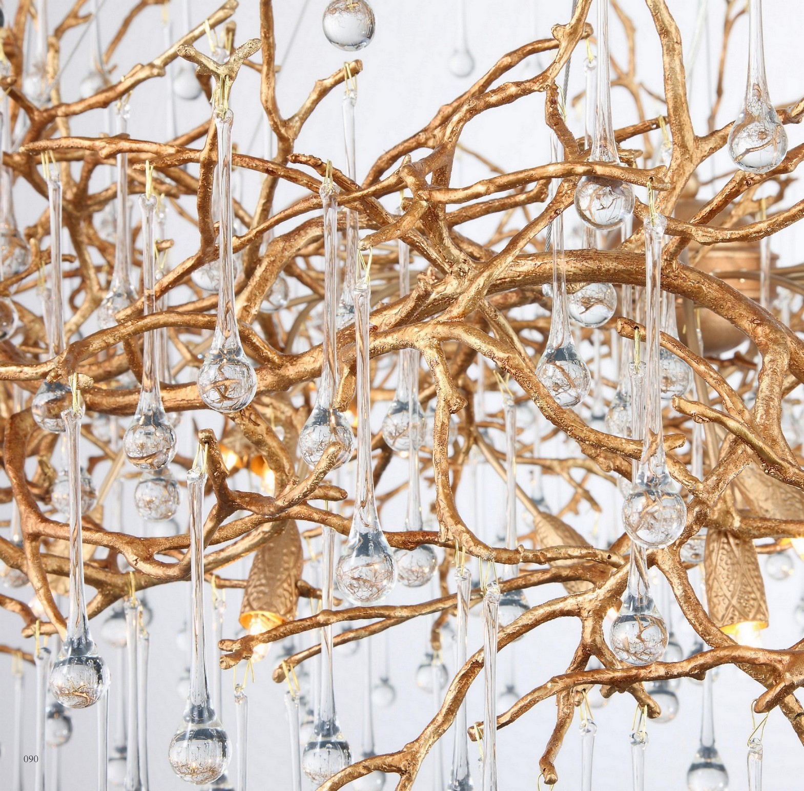 Скрытые лампы оживляют композицию: свет струится по металлу, подчёркивая текстуру ветвей, а стеклянные элементы вспыхивают сотнями бликов, превращая люстру в светящийся дождь. В медном исполнении люстра излучает тёплое золотистое сияние, а в алюминиевом — холодное лунное мерцание.