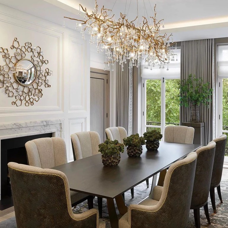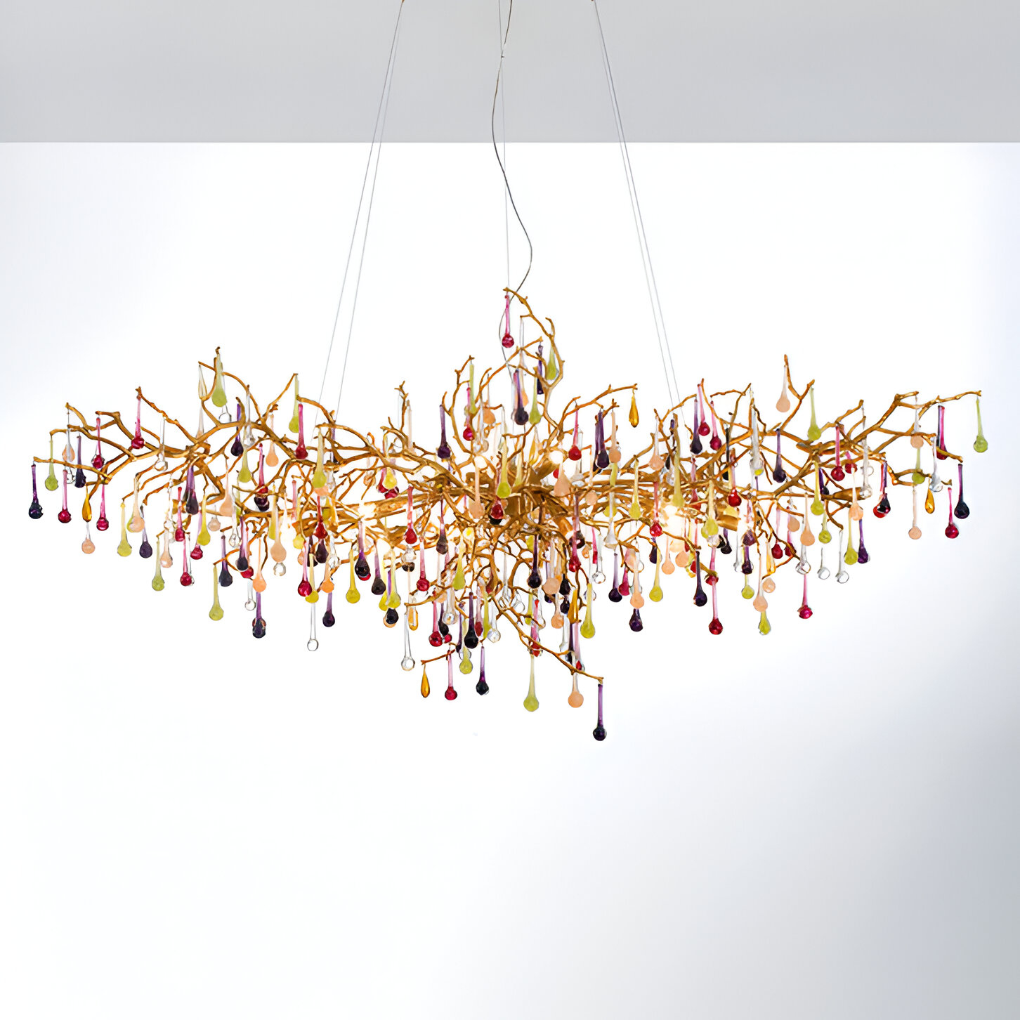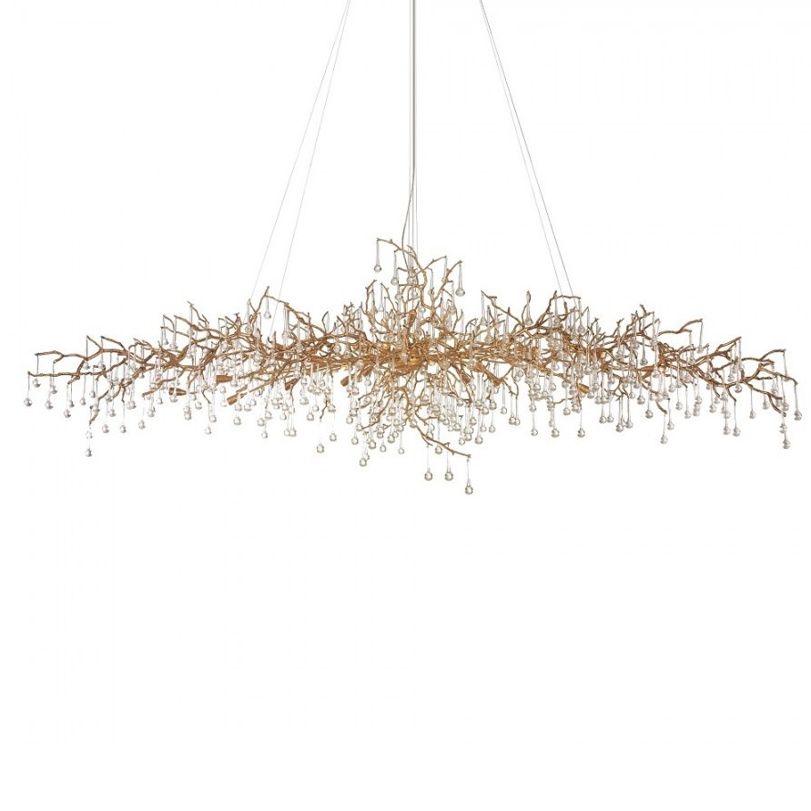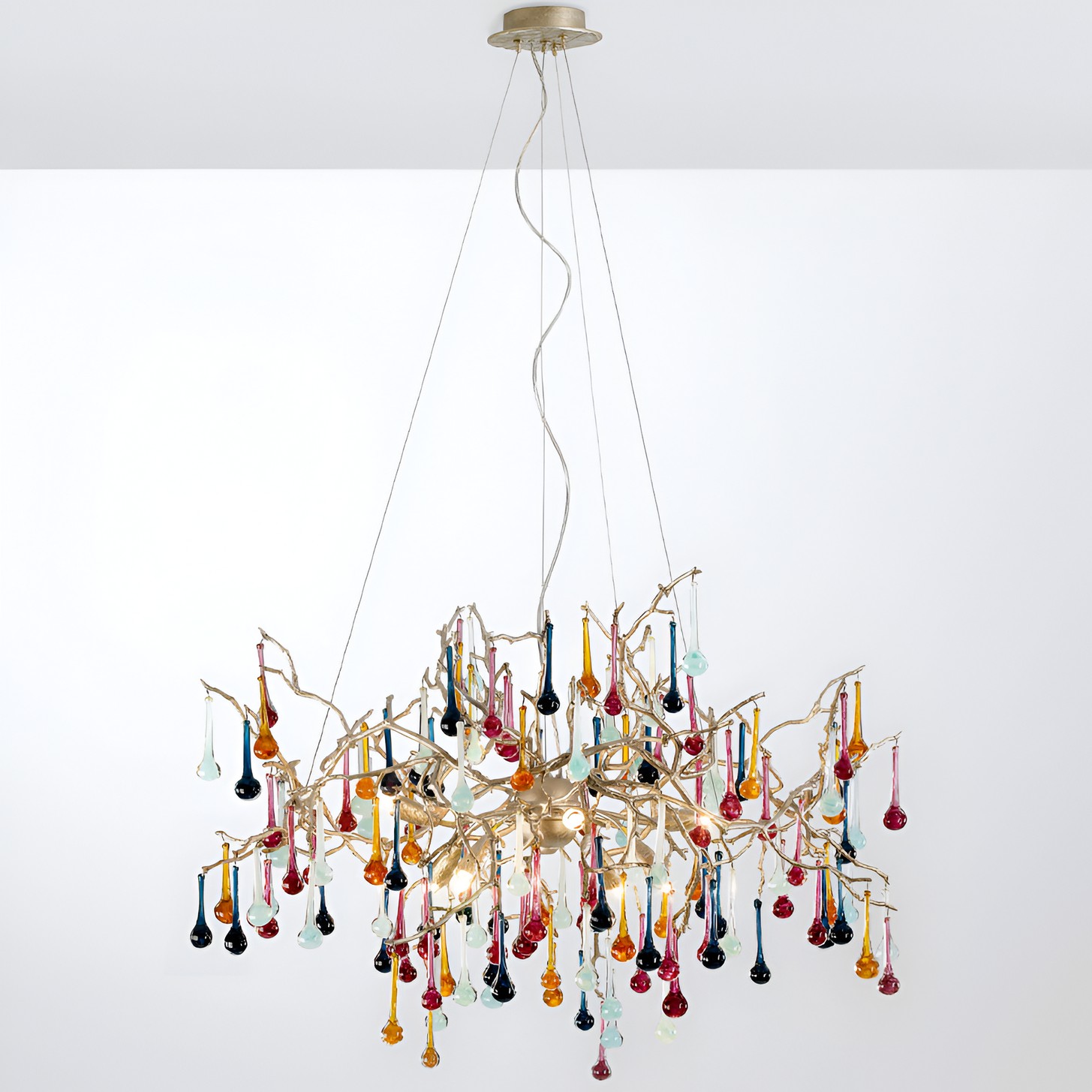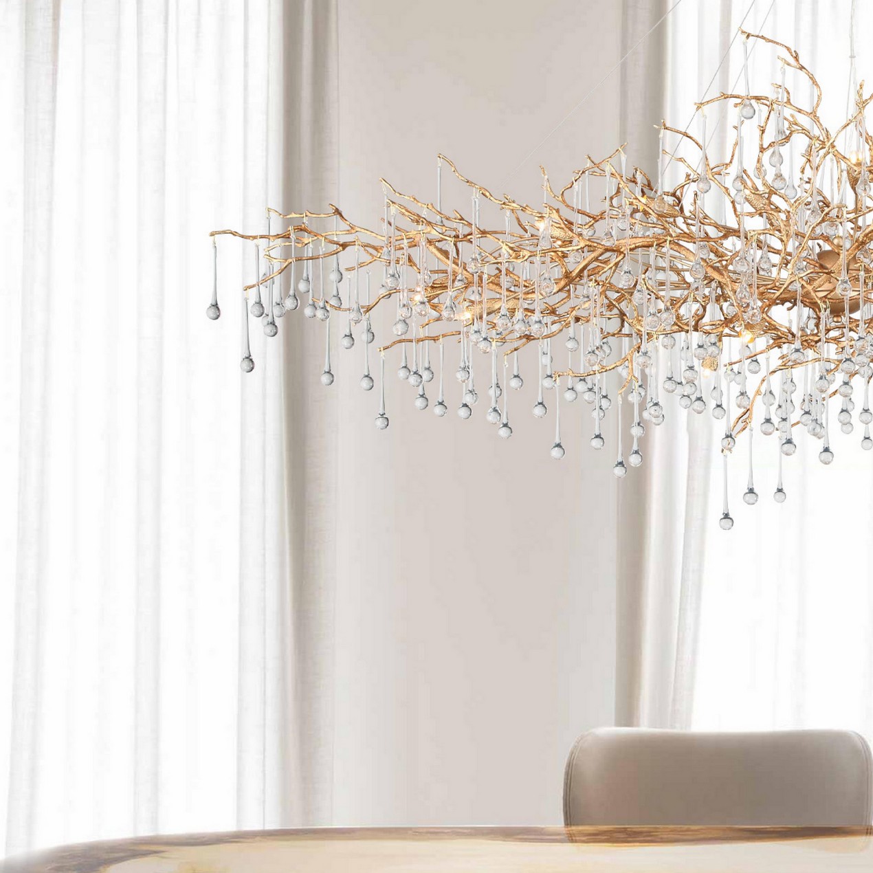 Скрытые лампы оживляют композицию: свет струится по металлу, подчёркивая текстуру ветвей, а стеклянные элементы вспыхивают сотнями бликов, превращая люстру в светящийся дождь. В медном исполнении люстра излучает тёплое золотистое сияние, а в алюминиевом — холодное лунное мерцание.