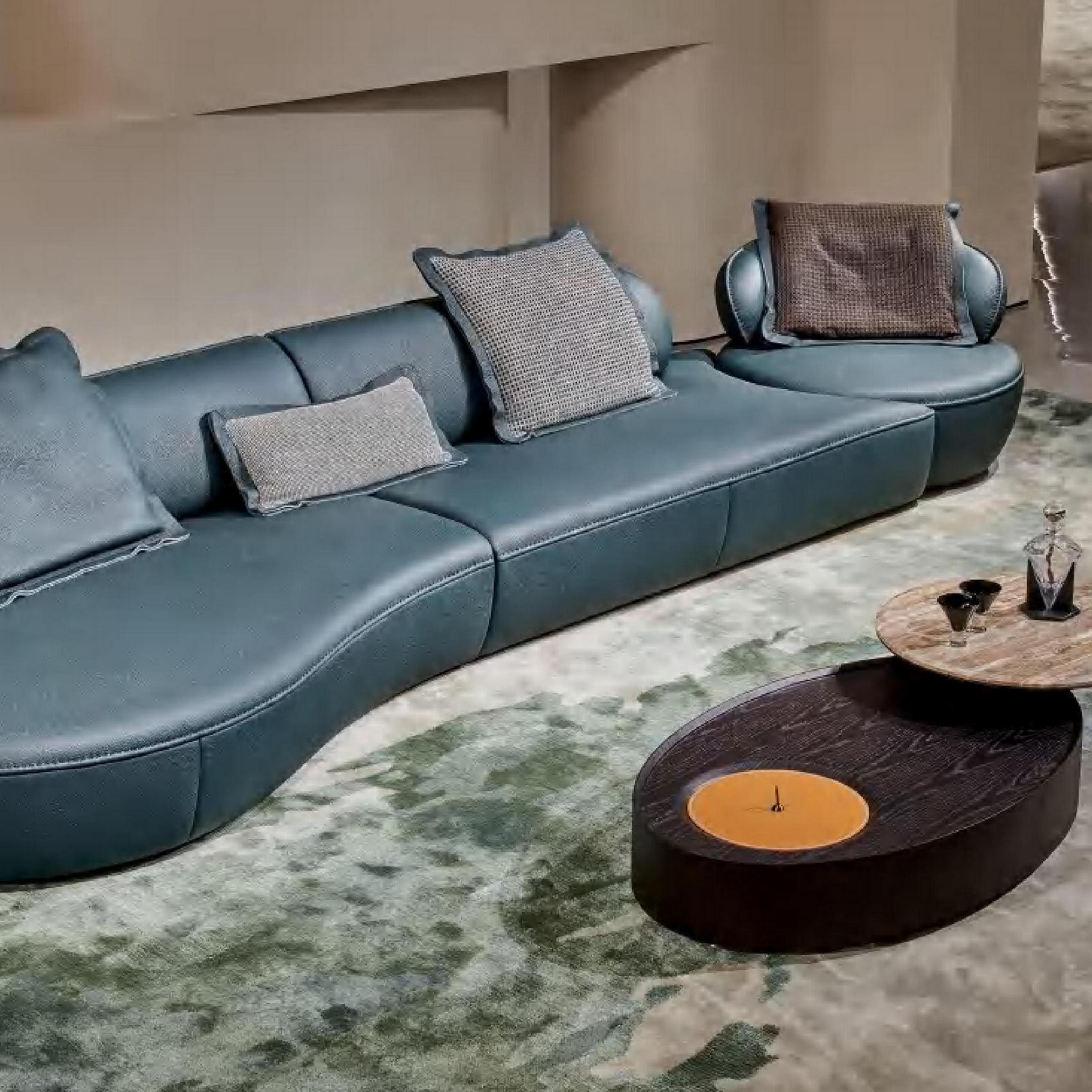 Пример интерьера: представьте современную гостиную, где центральное место занимает кожаный диван Neptune глубокого бирюзового оттенка. Рядом — круглые кофейные столики, которые добавляют пространству легкости и гармонии.