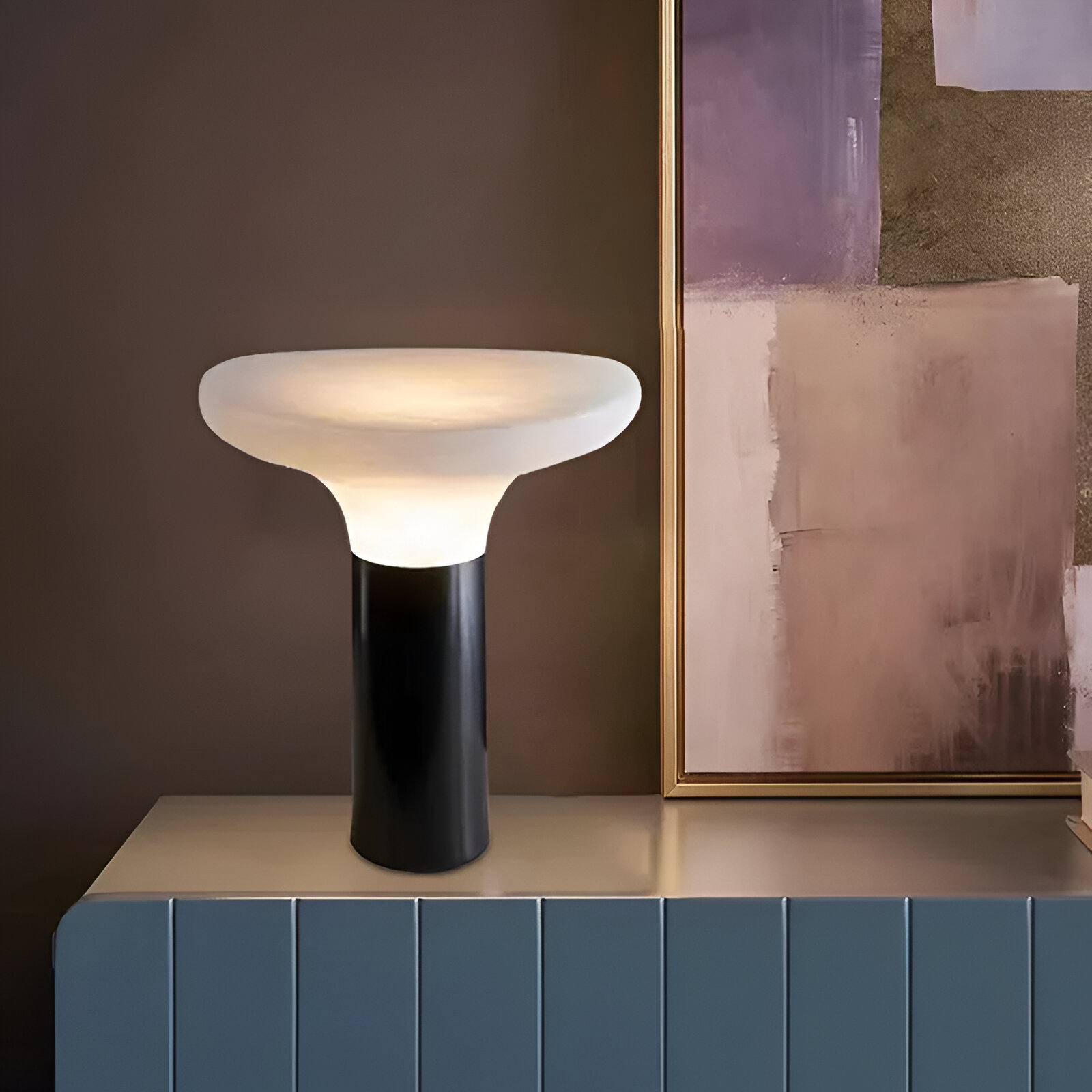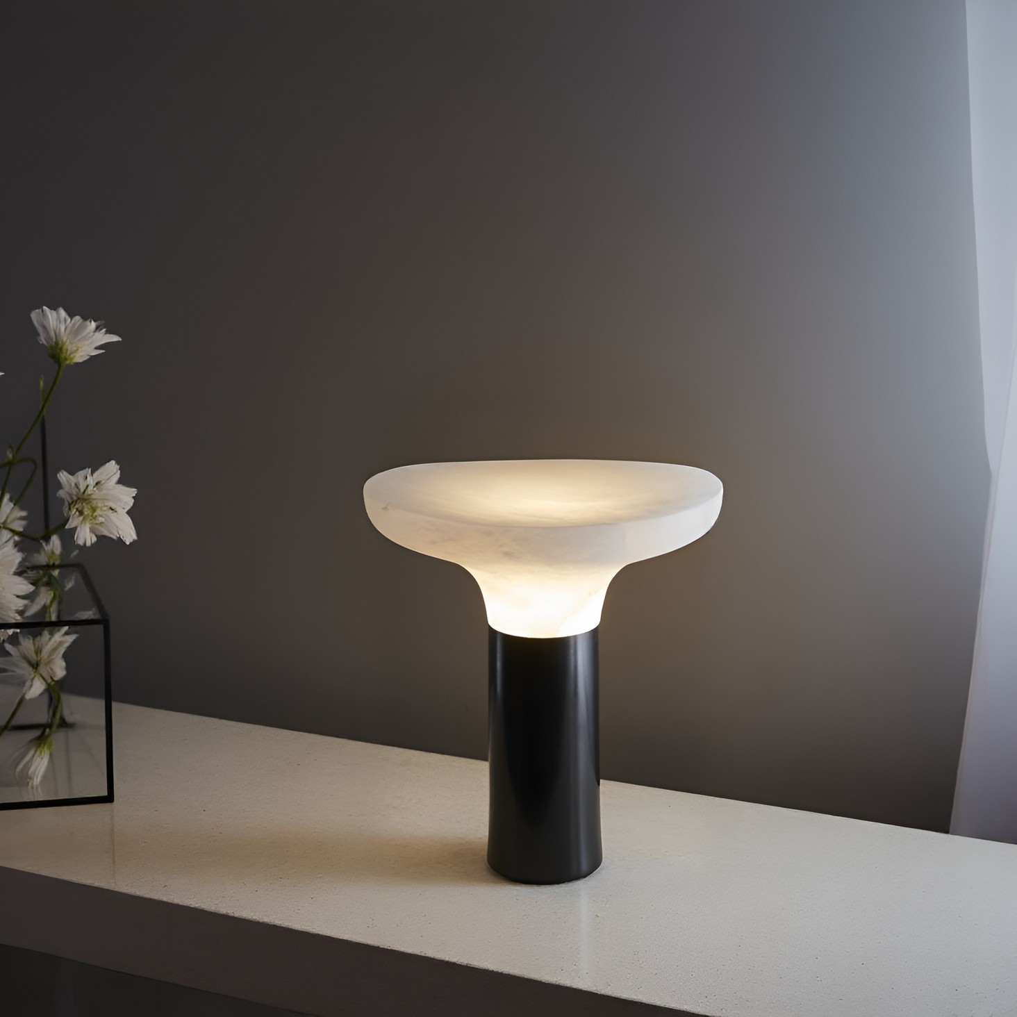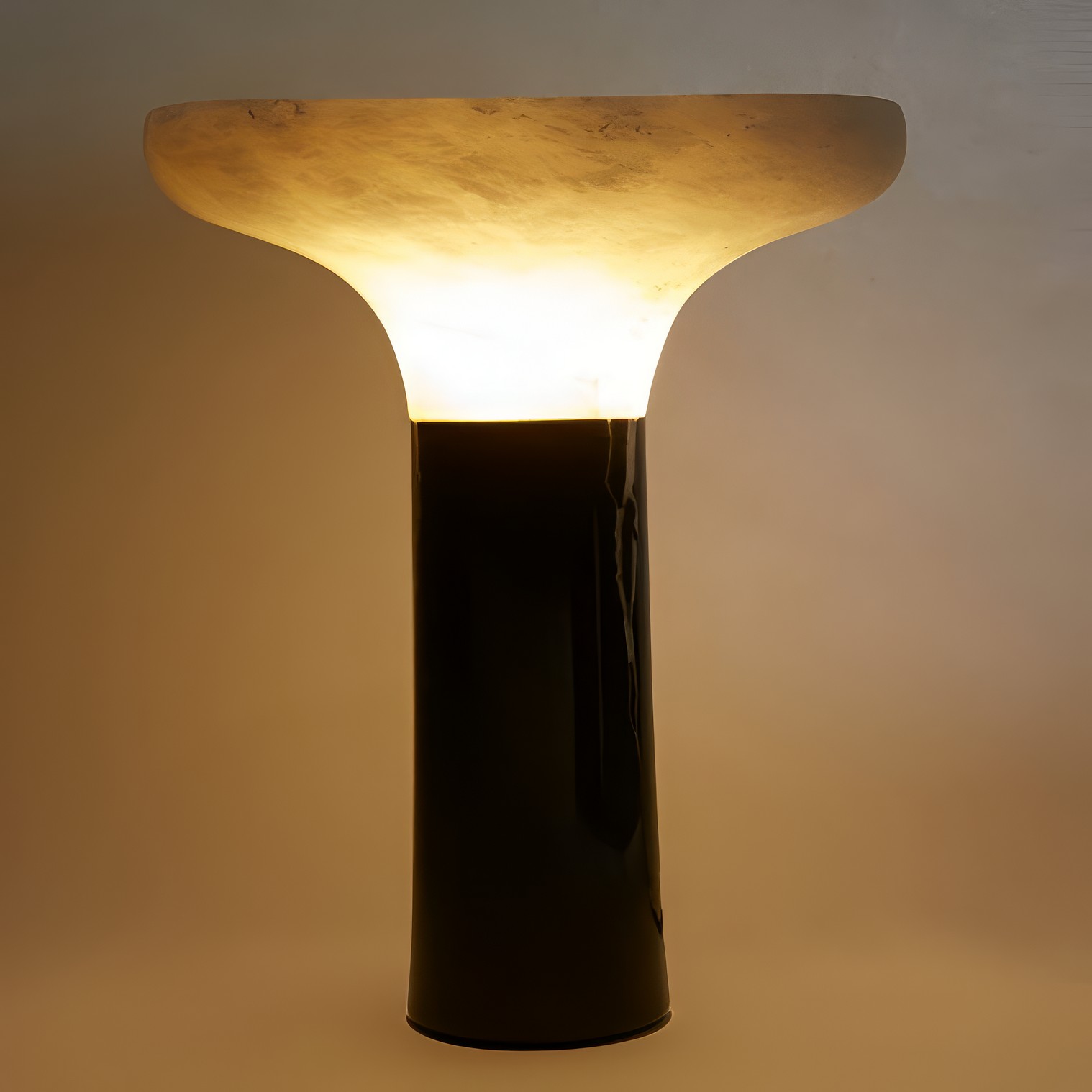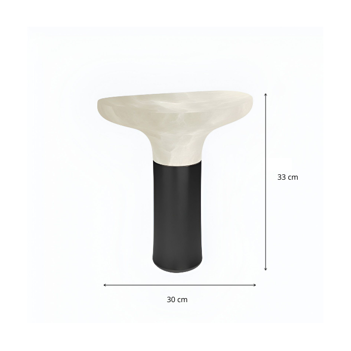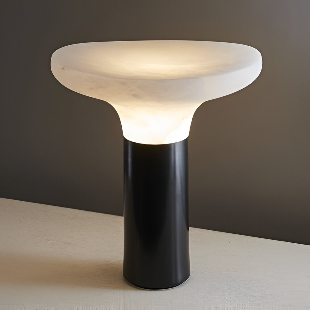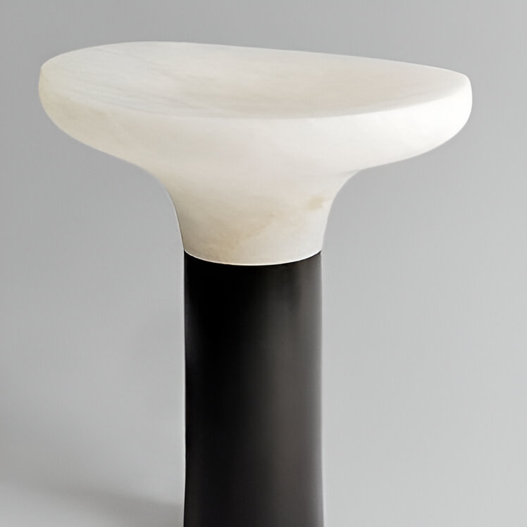 NIMBUS — светильник, где минимализм встречается с природной пластикой. Его форма напоминает диковинный лесной гриб, застывший в момент роста: полупрозрачная каменная шляпка мягко рассеивает свет, создавая атмосферу уединённого уголка. Гладкая цилиндрическая основа контрастирует с органичными изгибами верхней части, подчёркивая диалог между геометрией и природной хаотичностью.
