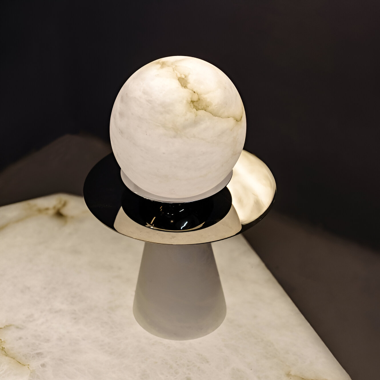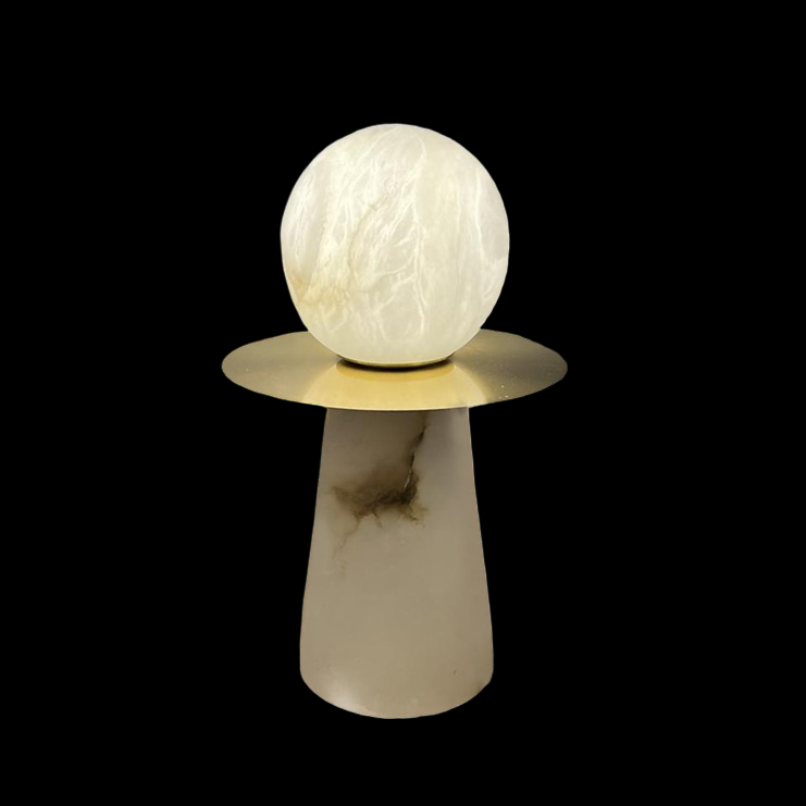 Алебастровая сфера, словно миниатюрная планета, парит над золотистым металлическим диском, создавая эффект космического тела в невесомости. Плавные линии конусовидного основания придают композиции устойчивость и завершенность.