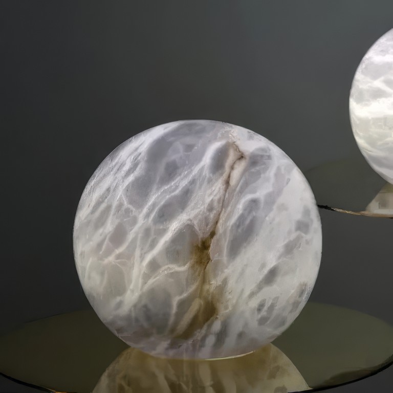 Полупрозрачная структура камня мягко фильтрует свет, наполняя пространство теплым рассеянным свечением. Природные прожилки алебастра образуют уникальный рисунок, который оживает в лучах света, меняя восприятие формы в течение дня.