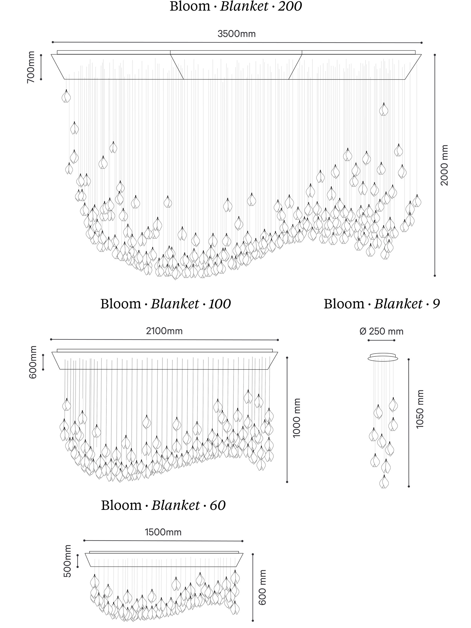 Инсталляция доступна в трёх размерах. Полупрозрачные фарфоровые бутоны представлены в глянцевом и матовом белом цвете. Тонкие кабели, по которым идет питание, покрыты шелковой оплеткой светло-золотого или серебряного цвета. Они крепятся к светильнику с помощью специально разработанных латунных втулок, покрытых золотом или никелем. На потолке каждый подвес крепится на минимальную панель, покрытую порошковой краской. Возможно выполнение композиций по индивидуальному заказу с другими размерами и видами креплений. Качество изделий подтверждено сертификатами СЕ.