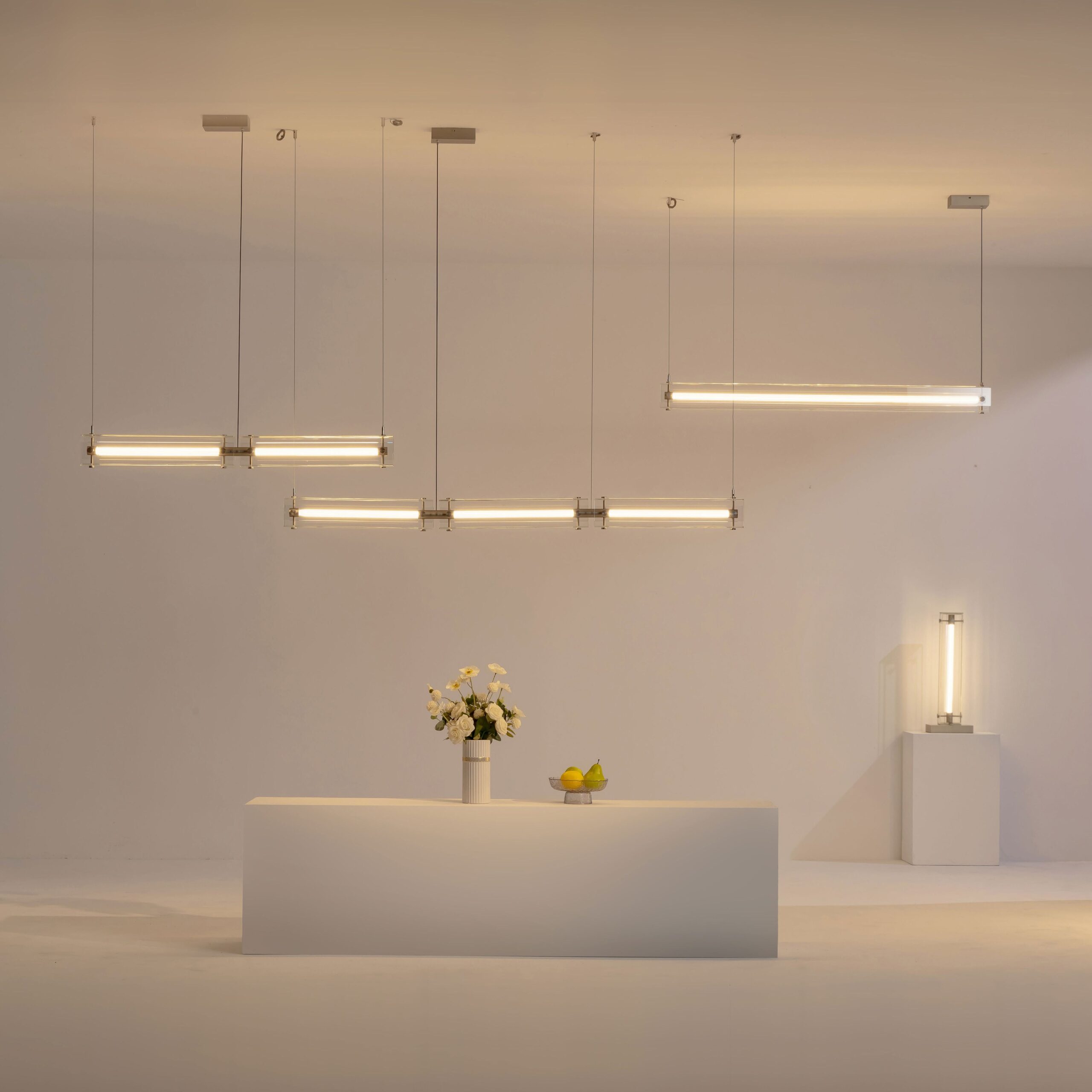 Современная серия STRING, рождённая под вдохновением музыки и искусства, отличается изысканным и лаконичным дизайном. Её строгие линии и стройная структура напоминают лёгкие струны инструмента, создавая ощущение динамики и ритма. Прозрачные стеклянные элементы в сочетании с металлическим каркасом наполняют пространство тёплым светом, придавая ему артистичный вид концертного зала.