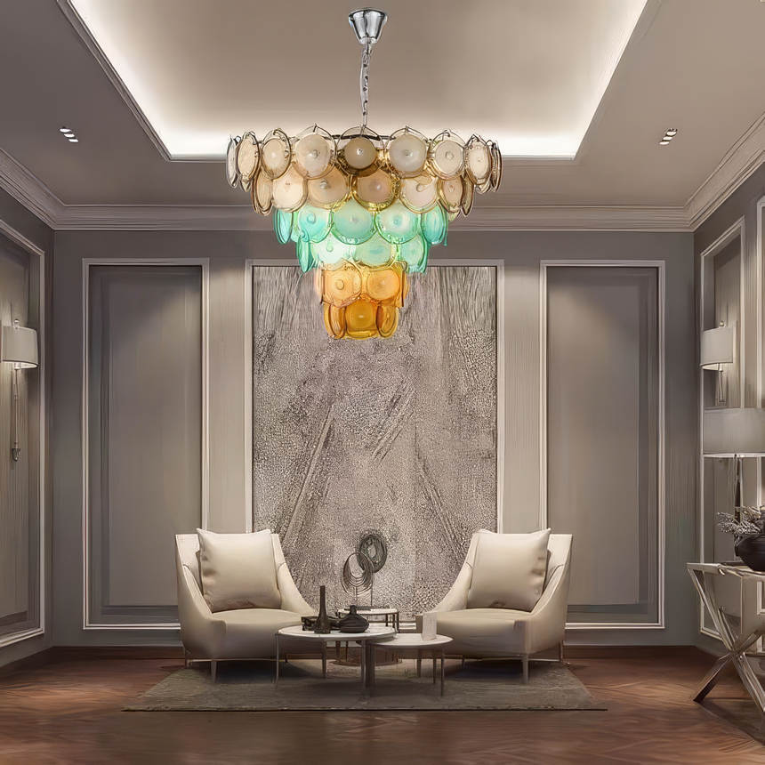 TOKENS CASCADE — название, в котором сочетаются образы света, движения и символической ценности. Token — это не только жетон или монета, но и знак, талисман, символ удачи. Светильники этой серии собраны из стеклянных пластин, напоминающих драгоценные жетоны: каждая деталь словно несёт свою историю и добавляет композиции характер.