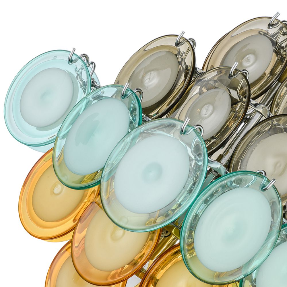 Пластины выполнены из ручного выдувного стекла: прозрачного, янтарного, бирюзового и дымчато-серого. Они свободно подвешены на металлическом каркасе и легко колеблются при движении воздуха или от лёгких вибраций, оживляя светильник и создавая игру бликов. Цвета «токенов» можно подобрать в индивидуальной комбинации, чтобы создать персональный ритм и оттенок композиции.