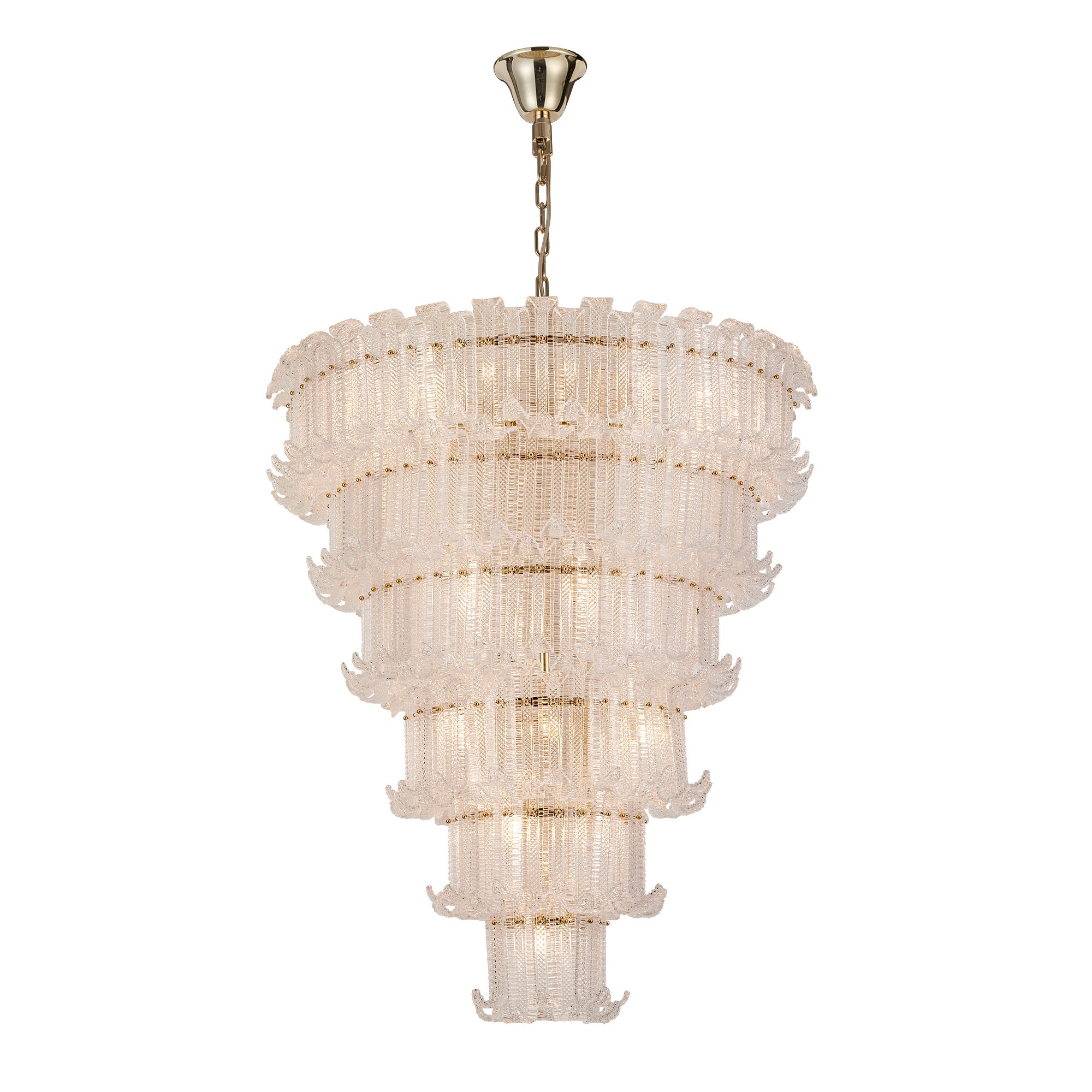 Каркас светильников выполнен из металла в светлом платиновом оттенке, подчёркивающим чистоту и гармонию формы. Плафоны из прозрачного стекла ручной работы обладают тонкой, многослойной фактурой, которая обеспечивает равномерное и мягкое рассеивание света, создавая ощущение лёгкости и воздушности.